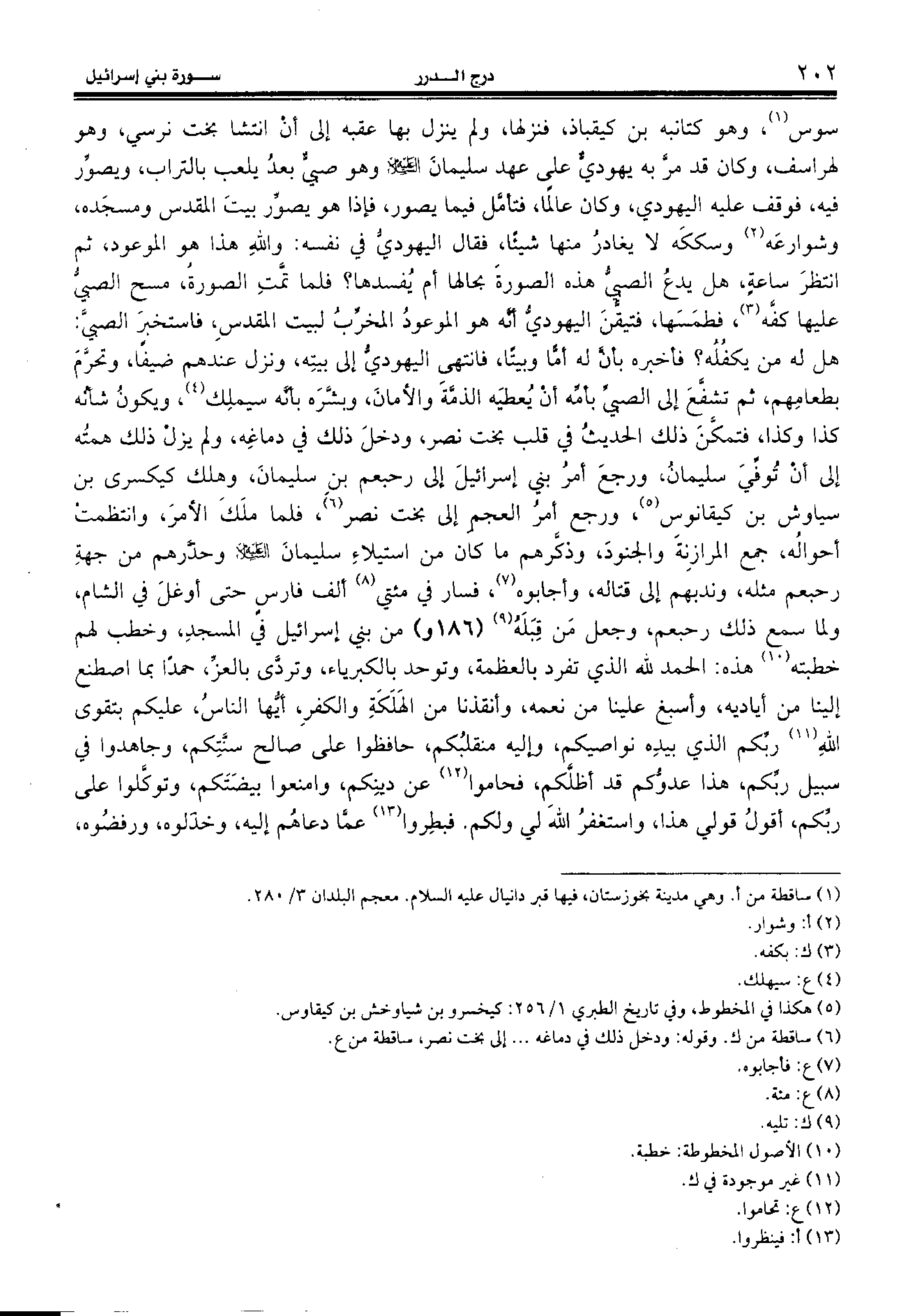 هل له من يكفله؟ فأخبره بأنّ له أمّا وبيتا، فانتهى اليهوديّ إلى بيته، ونزل عندهم ضيفا، وتحرّم بطعامهم، ثم تشفّع إلى الصبيّ بأمّه أن يعطيه الذمّة والأمان، وبشّره بأنّه سيملك (¬4)، ويكون شأنه كذا وكذا، فتمكّن ذلك الحديث في قلب بخت نصر، ودخل ذلك في دماغه، ولم يزل ذلك همته إلى أن توفّي سليمان، ورجع أمر بني إسرائيل إلى رحبعم بن سليمان، وهلك كيكسرى بن سياوش بن كيقانوس (¬5)، ورجع أمر العجم إلى بخت نصر (¬6)، فلما ملك الأمر، وانتظمت أحواله، جمع المرازنة والجنود، وذكّرهم ما كان من استيلاء سليمان عليه السّلام وحذّرهم من جهة رحبعم مثله، وندبهم إلى قتاله، وأجابوه (¬7)، فسار في مئتي (¬8) ألف فارس حتى أوغل في الشام، ولما سمع ذلك رحبعم، وجعل من قبله (¬9) (186 و) من بني إسرائيل في المسجد، وخطب لهم خطبته (¬10) هذه: الحمد لله الذي تفرد بالعظمة، وتوحد بالكبرياء، وتردّى بالعزّ، حمدا بما اصطنع إلينا من أياديه، وأسبغ علينا من نعمه، وأنقذنا من الهلكة والكفر، أيّها الناس، عليكم بتقوى الله (¬11) ربّكم الذي بيده نواصيكم، وإليه منقلبكم، حافظوا على صالح سنّتكم، وجاهدوا في سبيل ربّكم، هذا عدوّكم قد أظلّكم، فحاموا (¬12) عن دينكم، وامنعوا بيضتكم، وتوكّلوا على ربّكم، أقول قولي هذا، واستغفر الله لي ولكم. فبطروا (¬13) عمّا دعاهم إليه، وخذلوه، ورفضوه،