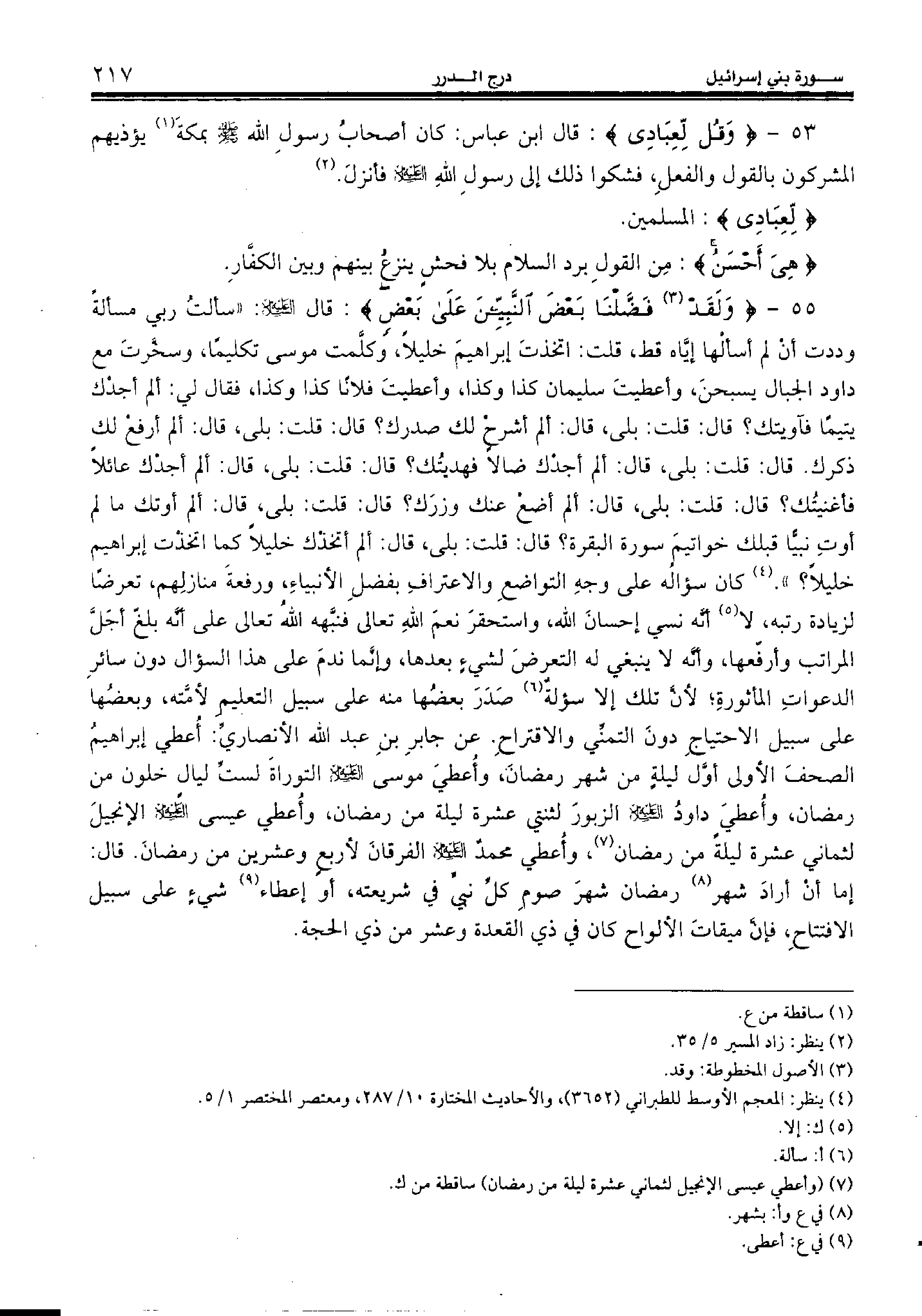55 - {وَلَقَدْ (¬3)} فَضَّلْنا بَعْضَ النَّبِيِّينَ عَلى بَعْضٍ: قال عليه السّلام: «سألت ربي مسألة وددت أن لم أسألها إيّاه قط، قلت: اتخذت إبراهيم خليلا، وكلّمت موسى تكليما، وسخّرت مع داود الجبال يسبحن، وأعطيت سليمان كذا وكذا، وأعطيت فلانا كذا وكذا، فقال لي: ألم أجدك يتيما فآويتك؟ قال: قلت: بلى، قال: ألم أشرح لك صدرك؟ قال: قلت: بلى، قال: ألم أرفع لك ذكرك. قال: قلت: بلى، قال: ألم أجدك ضالا فهديتك؟ قال: قلت: بلى، قال: ألم أجدك عائلا فأغنيتك؟ قال: قلت: بلى، قال: ألم أضع عنك وزرك؟ قال: قلت: بلى، قال: ألم أوتك ما لم أوت نبيّا قبلك خواتيم سورة البقرة؟ قال: قلت: بلى، قال: ألم أتخذك خليلا كما اتخذت إبراهيم خليلا؟». (¬4) كان سؤاله على وجه التواضع والاعتراف بفضل الأنبياء، ورفعة منازلهم، تعرضا لزيادة رتبه، لا (¬5) أنّه نسي إحسان الله، واستحقر نعم الله تعالى فنبّهه الله تعالى على أنّه بلغّ أجلّ المراتب وأرفّعها، وأنّه لا ينبغي له التعرض لشيء بعدها، وإنّما ندم على هذا السؤال دون سائر الدعوات المأثورة؛ لأنّ تلك إلا سؤلة (¬6) صدر بعضها منه على سبيل التعليم لأمّته، وبعضها على سبيل الاحتياج دون التمنّي والاقتراح. عن جابر بن عبد الله الأنصاريّ: أعطي إبراهيم الصحف الأولى أوّل ليلة من شهر رمضان، وأعطي موسى عليه السّلام التوراة لستّ ليال خلون من رمضان، وأعطي داود عليه السّلام الزبور لثنتي عشرة ليلة من رمضان، وأعطي عيسى عليه السّلام الإنجيل لثماني عشرة ليلة من رمضان (¬7)، وأعطي محمد عليه السّلام الفرقان لأربع وعشرين من رمضان. قال: