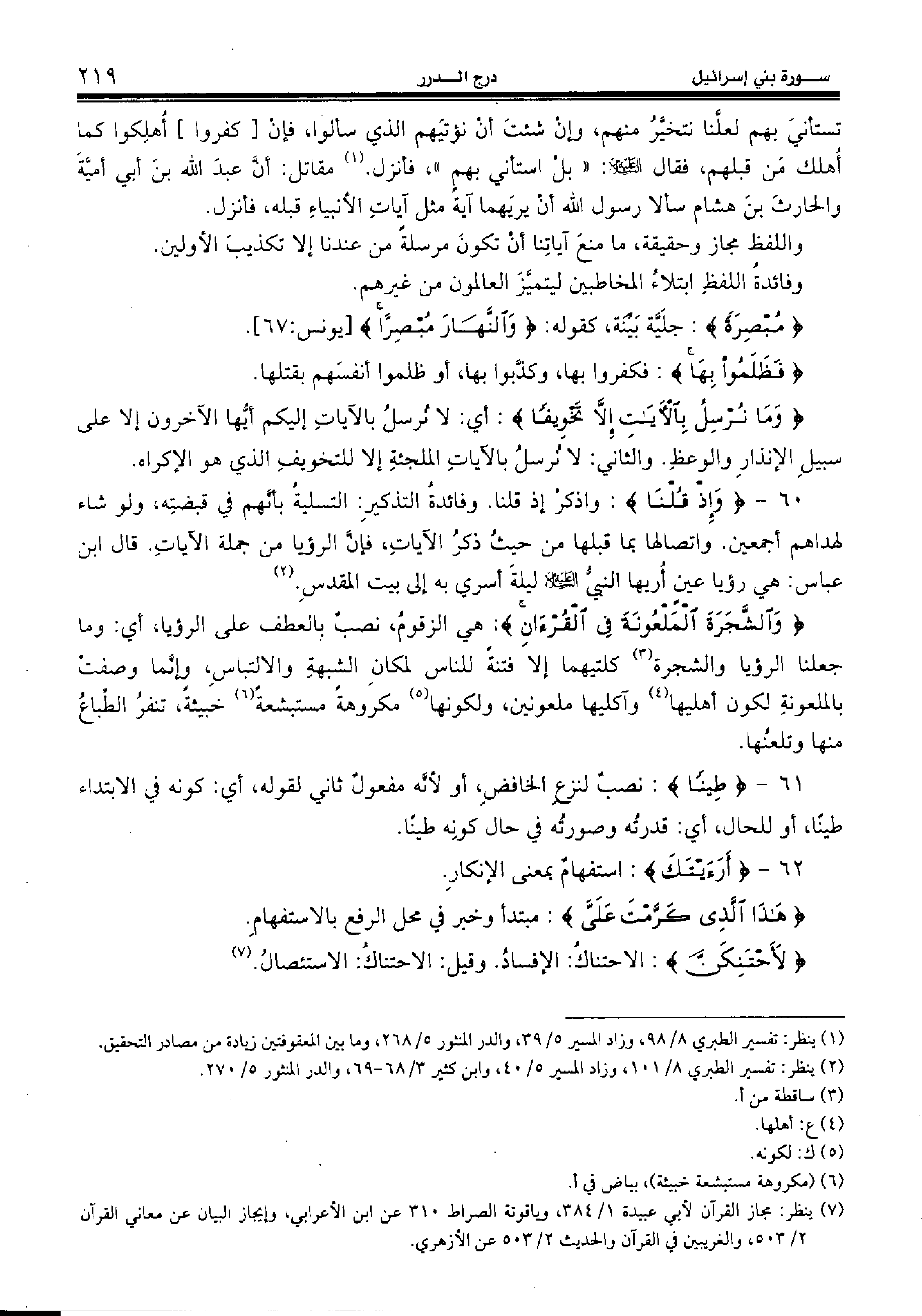 60 - {وَإِذْ قُلْنا:} واذكر إذ قلنا. وفائدة التذكير: التسلية بأنّهم في قبضته، ولو شاء لهداهم أجمعين. واتصالها بما قبلها من حيث ذكر الآيات، فإنّ الرؤيا من جملة الآيات. قال ابن عباس: هي رؤيا عين أريها النبيّ عليه السّلام ليلة أسري به إلى بيت المقدس. (¬2)