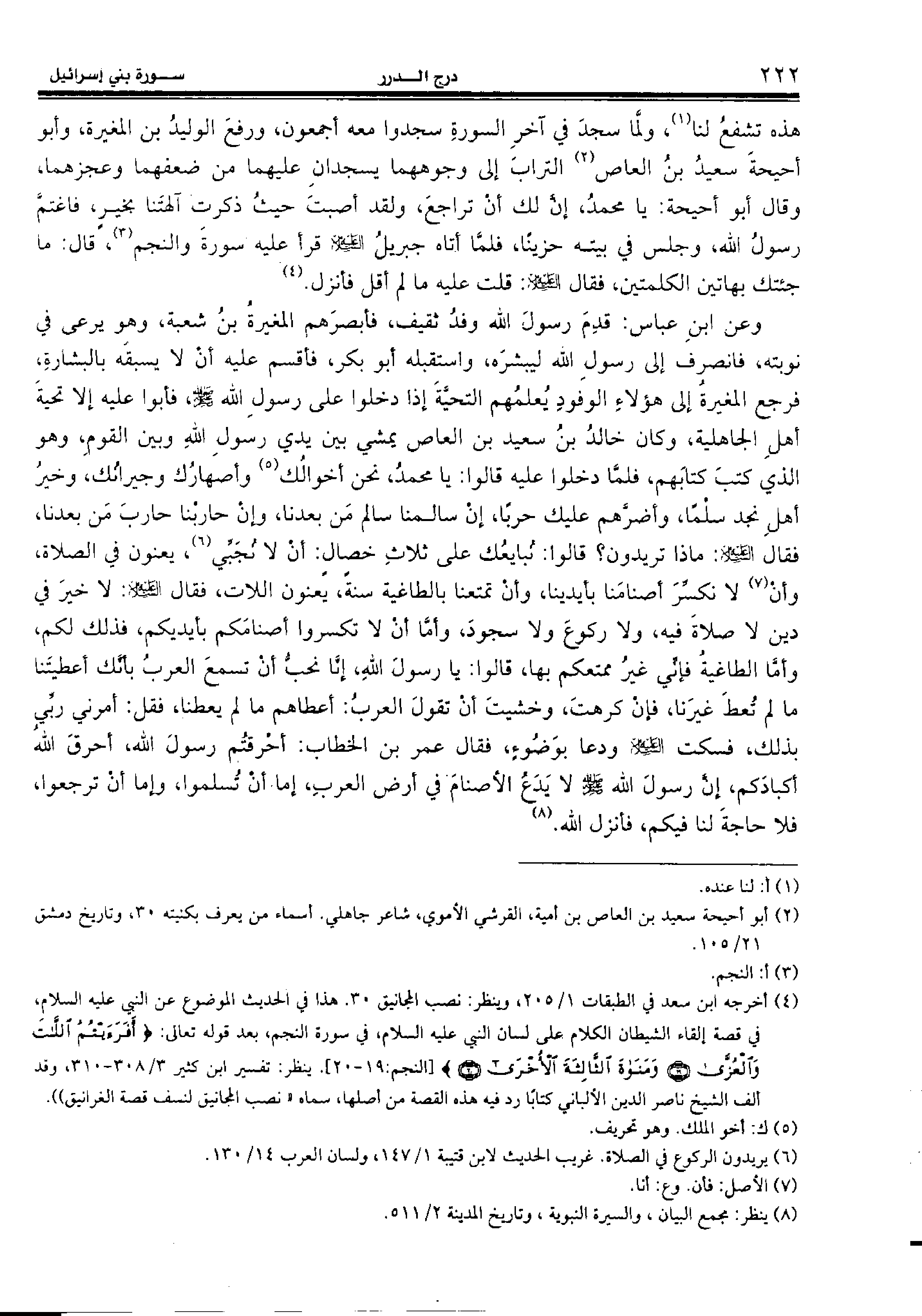 (¬4) أخرجه ابن سعد في الطبقات 1/ 205، وينظر: نصب المجانيق 30. هذا في الحديث الموضوع عن النبي عليه السّلام، في قصة إلقاء الشيطان الكلام على لسان النبي عليه السّلام، في سورة النجم، بعد قوله تعالى: أَفَرَأَيْتُمُ اللاّتَ وَالْعُزّى (19) وَمَناةَ الثّالِثَةَ الْأُخْرى (20) [النجم:19 - 20]. ينظر: تفسير ابن كثير 3/ 308 - 310، وقد ألف الشيخ ناصر الدين الألباني كتابا رد فيه هذه القصة من أصلها، سماه «نصب المجانيق لنسف قصة الغرانيق)).