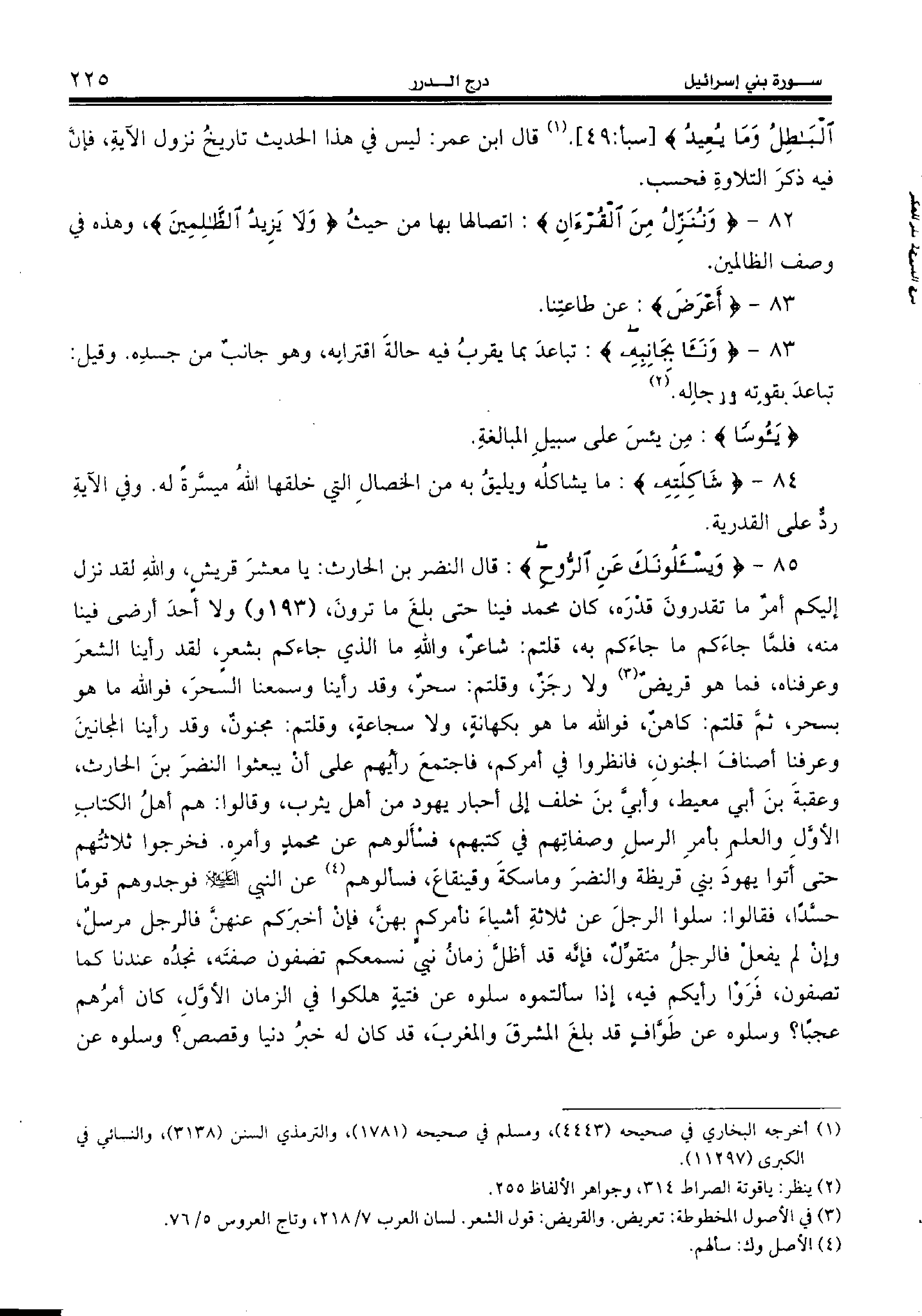 85 - {وَيَسْئَلُونَكَ عَنِ الرُّوحِ:} قال النضر بن الحارث: يا معشر قريش، والله لقد نزل إليكم أمر ما تقدرون قدره، كان محمد فينا حتى بلغ ما ترون، (193 و) ولا أحد أرضى فينا منه، فلمّا جاءكم ما جاءكم به، قلتم: شاعر، والله ما الذي جاءكم بشعر، لقد رأينا الشعر وعرفناه، فما هو قريض (¬3) ولا رجز، وقلتم: سحر، وقد رأينا وسمعنا السحر، فو الله ما هو بسحر، ثمّ قلتم: كاهن، فو الله ما هو بكهانة، ولا سجاعة، وقلتم: مجنون، وقد رأينا المجانين وعرفنا أصناف الجنون، فانظروا في أمركم، فاجتمع رأيهم على أن يبعثوا النضر بن الحارث، وعقبة بن أبي معيط، وأبيّ بن خلف إلى أحبار يهود من أهل يثرب، وقالوا: هم أهل الكتاب الأوّل والعلم بأمر الرسل وصفاتهم في كتبهم، فسألوهم عن محمد وأمره. فخرجوا ثلاثتهم حتى أتوا يهود بني قريظة والنضر وماسكة وقينقاع، فسألوهم (¬4) عن النبي عليه السّلام فوجدوهم قوما حسّدا، فقالوا: سلوا الرجل عن ثلاثة أشياء نأمركم بهنّ، فإن أخبركم عنهنّ فالرجل مرسل، وإن لم يفعل فالرجل متقوّل، فإنّه قد أظلّ زمان نبيّ نسمعكم تصفون صفته، نجده عندنا كما تصفون، فروا رأيكم فيه، إذا سألتموه سلوه عن فتية هلكوا في الزمان الأوّل، كان أمرهم عجبا؟ وسلوه عن طوّاف قد بلغ المشرق والمغرب، قد كان له خبر دنيا وقصص؟ وسلوه عن