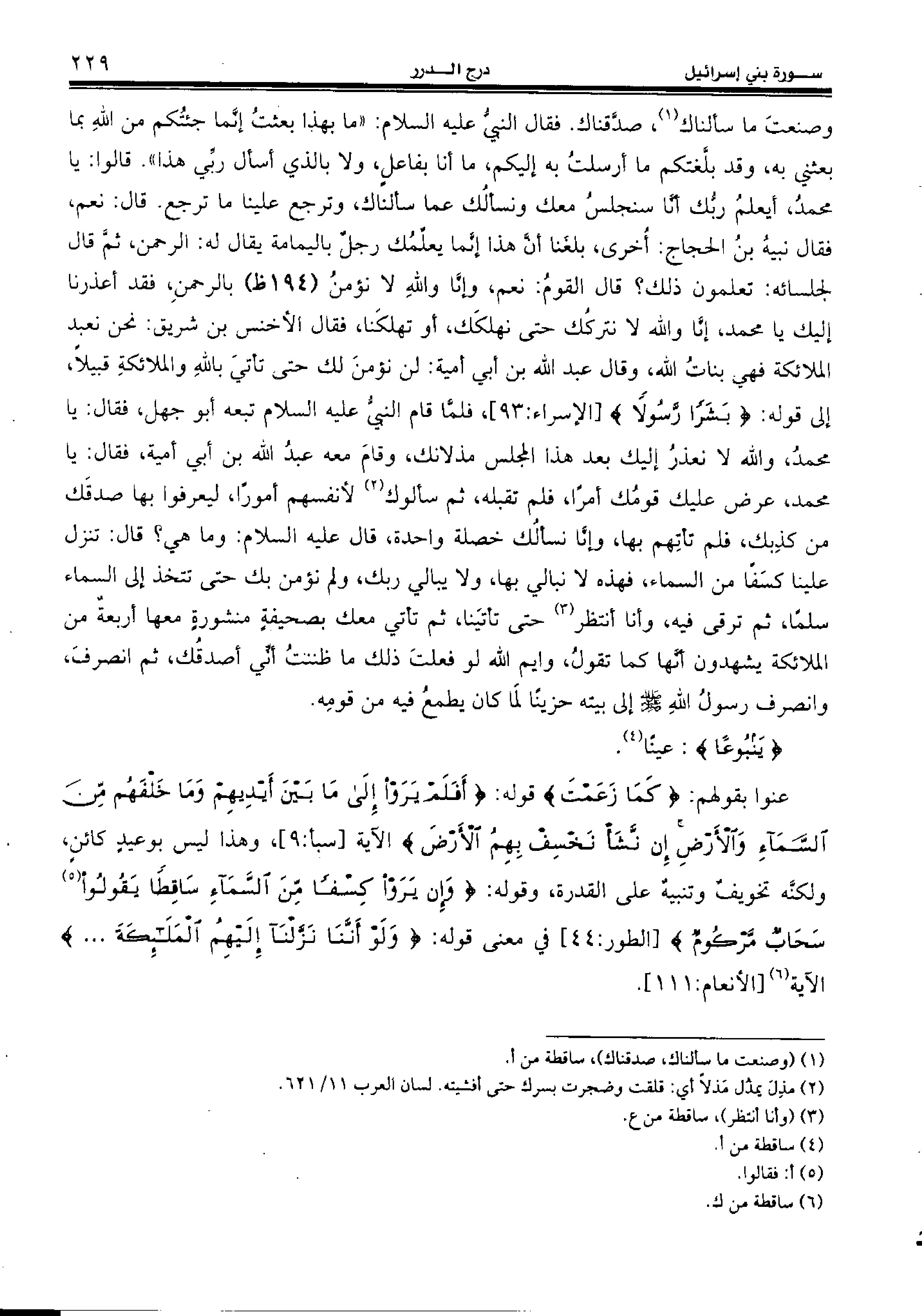 عنوا بقولهم: {كَما زَعَمْتَ} قوله: {أَفَلَمْ يَرَوْا إِلى ما بَيْنَ أَيْدِيهِمْ وَما خَلْفَهُمْ مِنَ السَّماءِ وَالْأَرْضِ إِنْ نَشَأْ نَخْسِفْ بِهِمُ الْأَرْضَ} الآية [سبأ:9]، وهذا ليس بوعيد كائن، ولكنّه تخويف وتنبيه على القدرة، وقوله: {وَإِنْ يَرَوْا كِسْفاً مِنَ السَّماءِ ساقِطاً يَقُولُوا (¬5)} سَحابٌ مَرْكُومٌ [الطور:44] في معنى قوله: {وَلَوْ أَنَّنا نَزَّلْنا إِلَيْهِمُ الْمَلائِكَةَ. . .}
