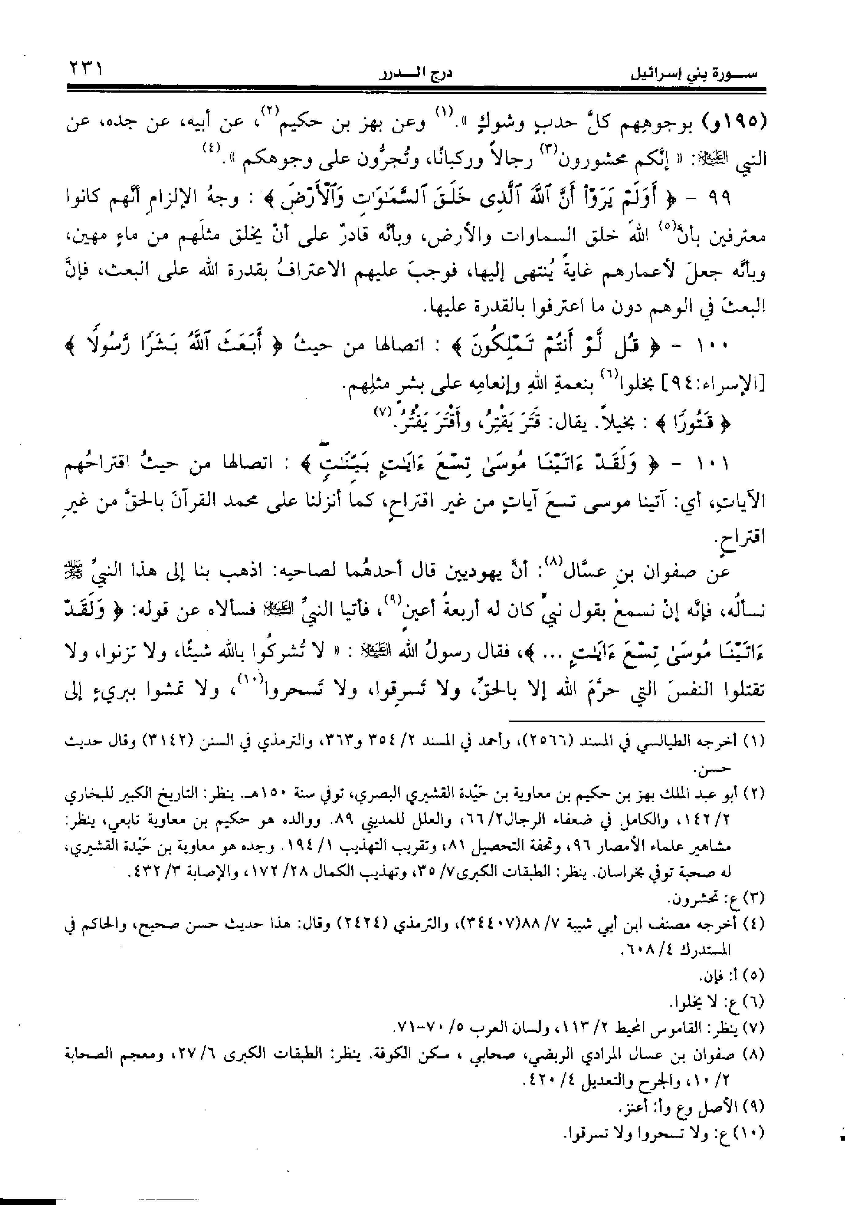 عن صفوان بن عسّال (¬8): أنّ يهوديين قال أحدهما لصاحبه: اذهب بنا إلى هذا النبيّ صلّى الله عليه وسلّم نسأله، فإنّه إن نسمع بقول نبيّ كان له أربعة أعين (¬9)، فأتيا النبيّ عليه السّلام فسألاه عن قوله: {وَلَقَدْ آتَيْنا مُوسى تِسْعَ آياتٍ. . .،} فقال رسول الله عليه السّلام: «لا تشركوا بالله شيئا، ولا تزنوا، ولا تقتلوا النفس التي حرّم الله إلا بالحقّ، ولا تسرقوا، ولا تسحروا (¬10)، ولا تمشوا ببريء إلى