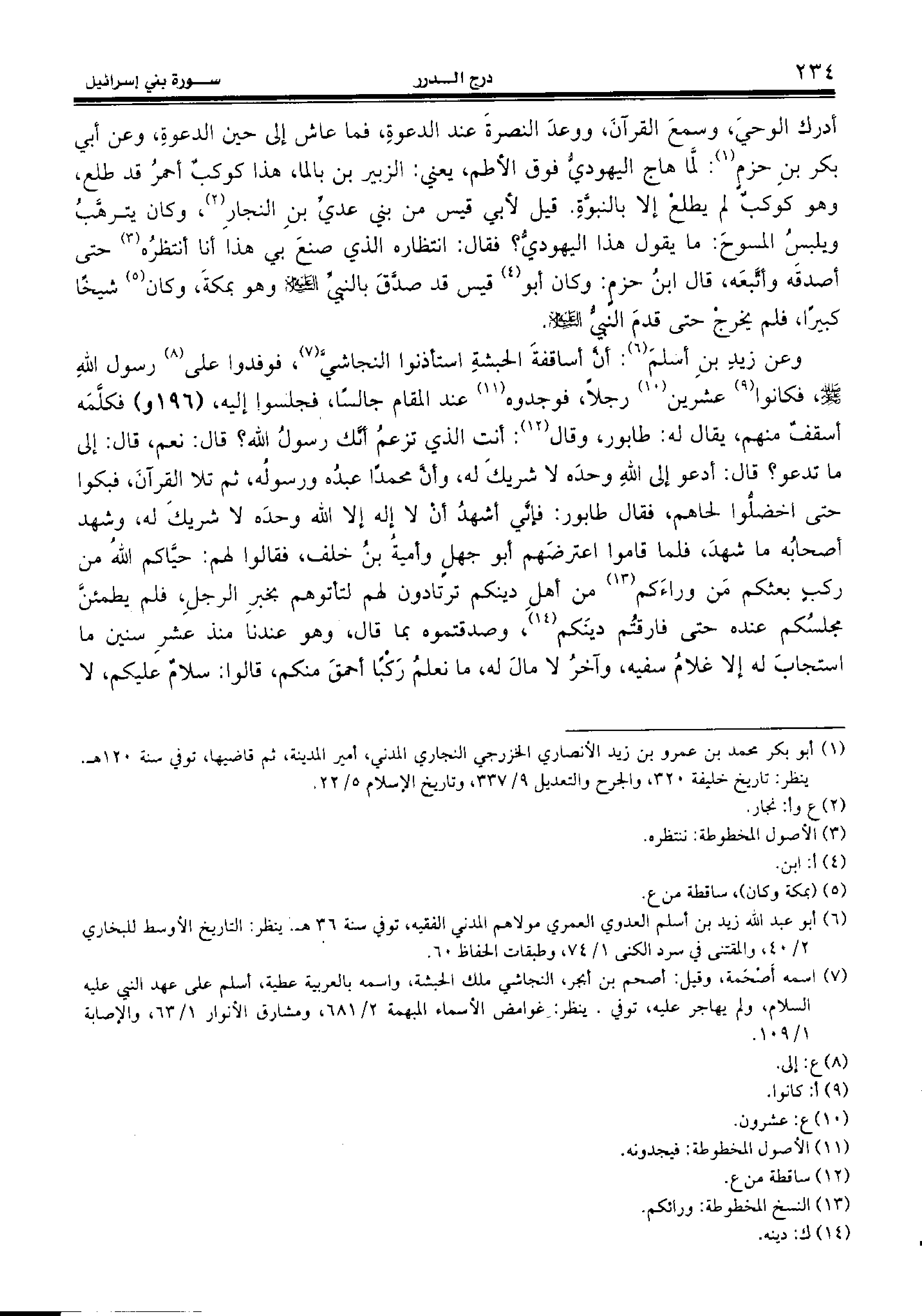 وعن زيد بن أسلم (¬6): أنّ أساقفة الحبشة استأذنوا النجاشيّ (¬7)، فوفدوا على (¬8) رسول الله صلّى الله عليه وسلّم، فكانوا (¬9) عشرين (¬10) رجلا، فوجدوه (¬11) عند المقام جالسا، فجلسوا إليه، (196 و) فكلّمه أسقف منهم، يقال له: طابور، وقال (¬12): أنت الذي تزعم أنّك رسول الله؟ قال: نعم، قال: إلى ما تدعو؟ قال: أدعو إلى الله وحده لا شريك له، وأنّ محمدا عبده ورسوله، ثم تلا القرآن، فبكوا حتى اخضلّوا لحاهم، فقال طابور: فإنّي أشهد أن لا إله إلا الله وحده لا شريك له، وشهد أصحابه ما شهد، فلما قاموا اعترضهم أبو جهل وأمية بن خلف، فقالوا لهم: حيّاكم الله من ركب بعثكم من وراءكم (¬13) من أهل دينكم ترتادون لهم لتأتوهم بخبر الرجل، فلم يطمئنّ مجلسكم عنده حتى فارقتم دينكم (¬14)، وصدقتموه بما قال، وهو عندنا منذ عشر سنين ما استجاب له إلا غلام سفيه، وآخر لا مال له، ما نعلم ركبا أحمق منكم، قالوا: سلام عليكم، لا