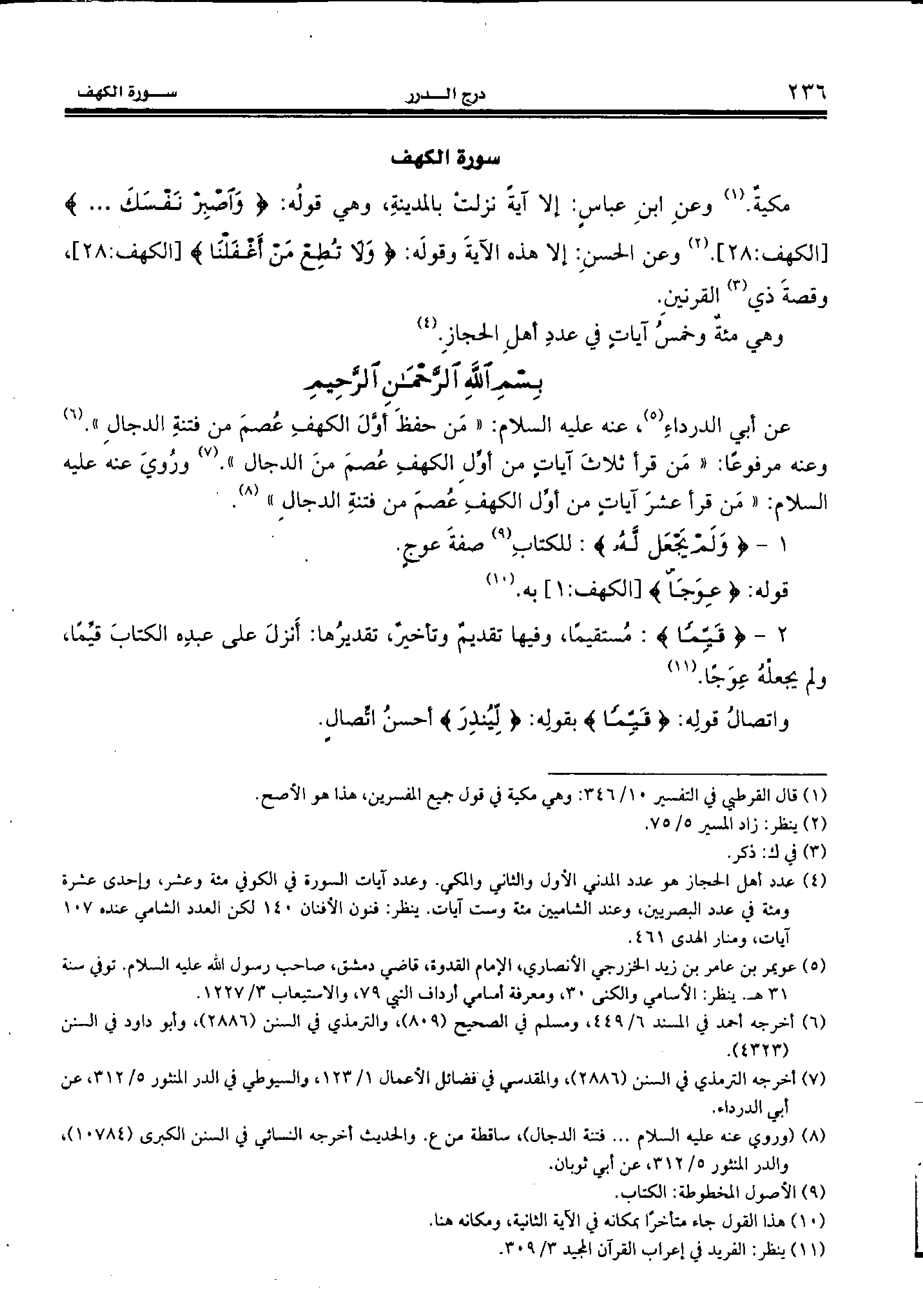 بسم الله الرّحمن الرّحيم عن أبي الدرداء (¬5)، عنه عليه السّلام: «من حفظ أوّل الكهف عصم من فتنة الدجال». (¬6)