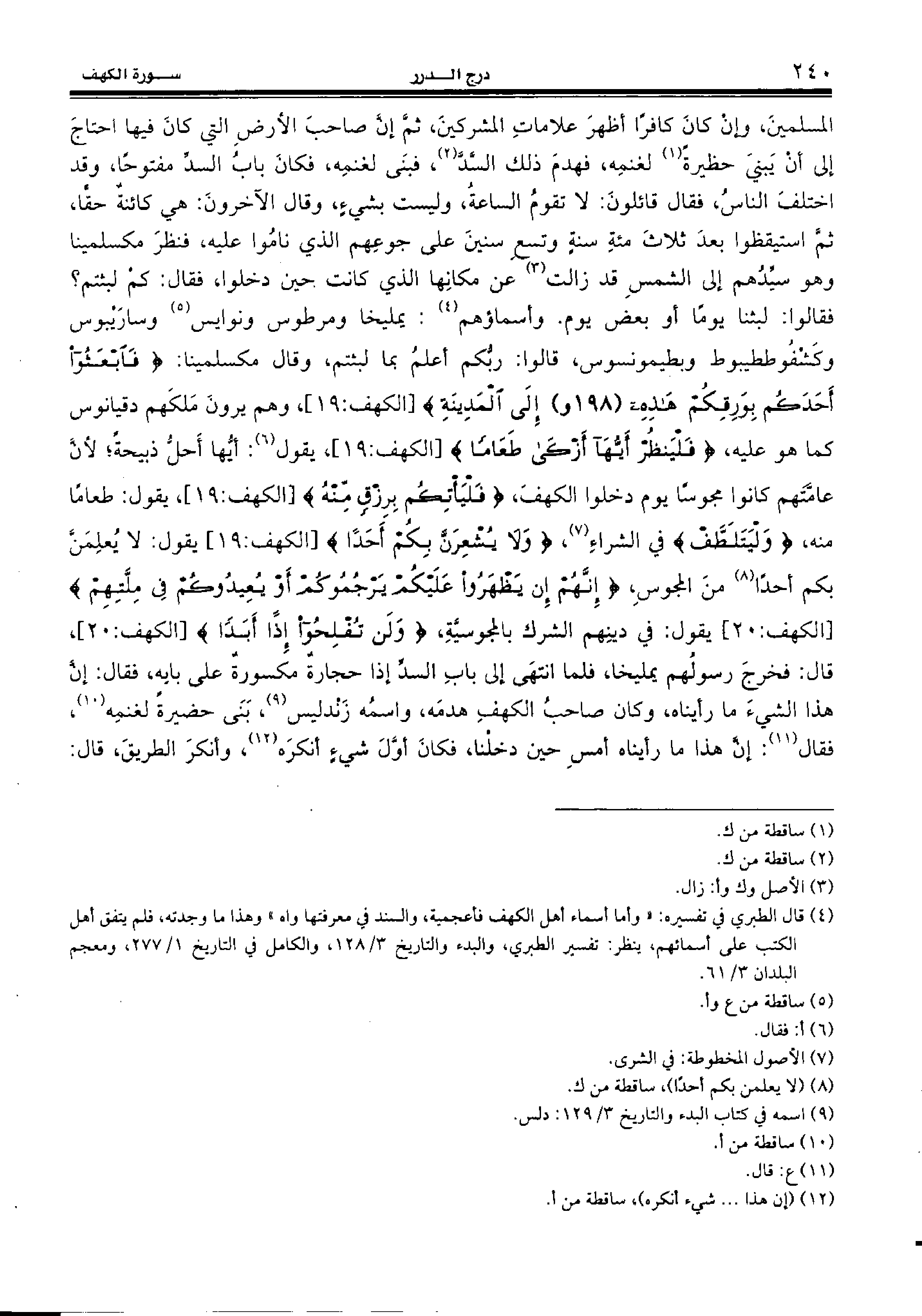 (¬4) قال الطبري في تفسيره: «وأما أسماء أهل الكهف فأعجمية، والسند في معرفتها واه» وهذا ما وجدته، فلم يتفق أهل الكتب على أسمائهم، ينظر: تفسير الطبري، والبدء والتاريخ 3/ 128، والكامل في التاريخ 1/ 277، ومعجم البلدان 3/ 61.