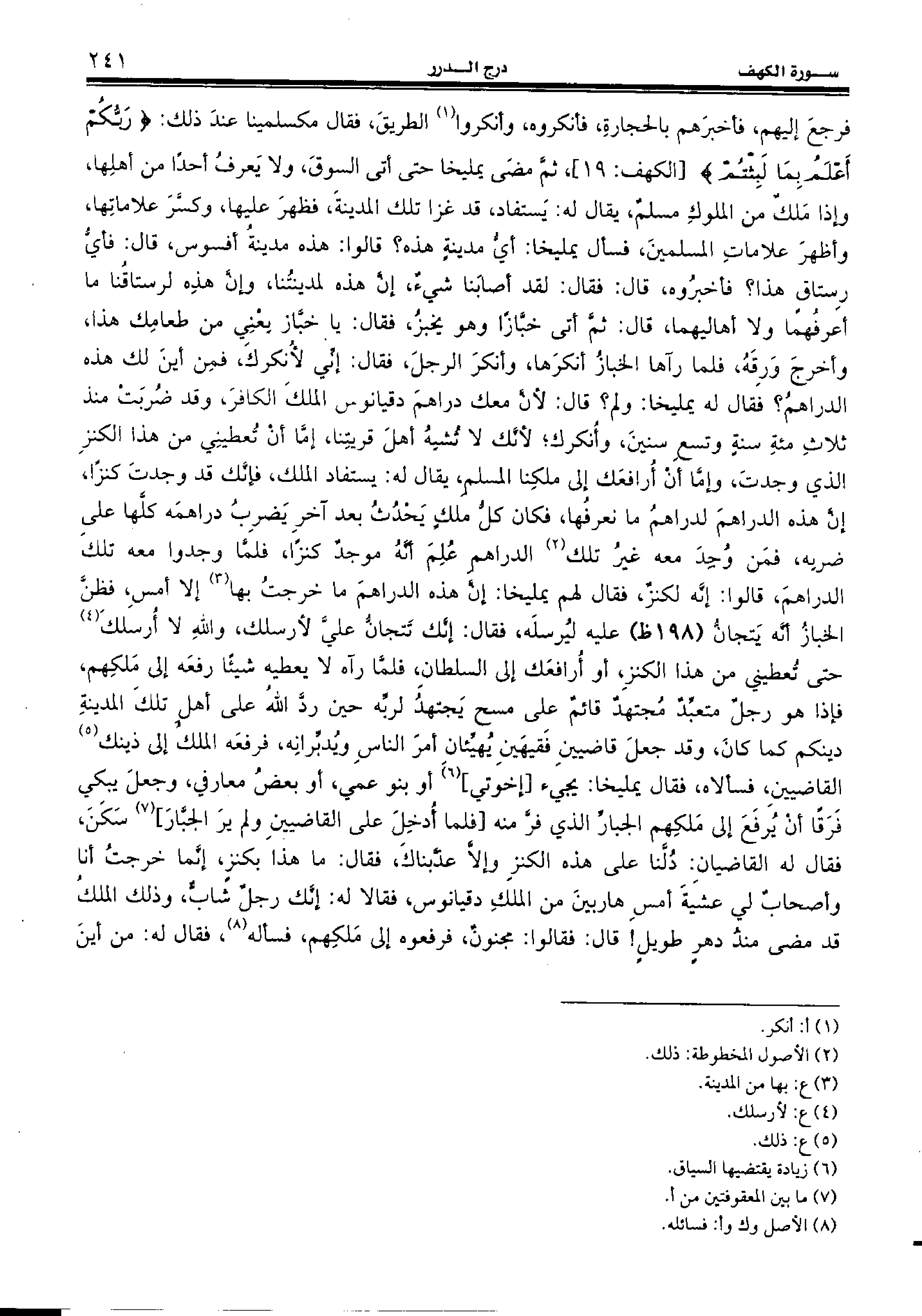فرجع إليهم، فأخبرهم بالحجارة، فأنكروه، وأنكروا (¬1) الطريق، فقال مكسلمينا عند ذلك: {رَبُّكُمْ أَعْلَمُ بِما لَبِثْتُمْ} [الكهف:19]، ثمّ مضى يمليخا حتى أتى السوق، ولا يعرف أحدا من أهلها، وإذا ملك من الملوك مسلم، يقال له: يستفاد، قد غزا تلك المدينة، فظهر عليها، وكسّر علاماتها، وأظهر علامات المسلمين، فسأل يمليخا: أيّ مدينة هذه؟ قالوا: هذه مدينة أفسوس، قال: فأيّ رستاق هذا؟ فأخبروه، قال: فقال: لقد أصابنا شيء، إنّ هذه لمدينتنا، وإنّ هذه لرستاقنا ما أعرفهما ولا أهاليهما، قال: ثمّ أتى خبّازا وهو يخبز، فقال: يا خبّاز بعني من طعامك هذا، وأخرج ورقه، فلما رآها الخباز أنكرها، وأنكر الرجل، فقال: إنّي لأنكرك، فمن أين لك هذه الدراهم؟ فقال له يمليخا: ولم؟ قال: لأنّ معك دراهم دقيانوس الملك الكافر، وقد ضربت منذ ثلاث مئة سنة وتسع سنين، وأنكرك؛ لأنّك لا تشبه أهل قريتنا، إمّا أن تعطيني من هذا الكنز الذي وجدت، وإمّا أن أرافعك إلى ملكنا المسلم، يقال له: يستفاد الملك، فإنّك قد وجدت كنزا، إنّ هذه الدراهم لدراهم ما نعرفها، فكان كلّ ملك يحدث بعد آخر يضرب دراهمه كلّها على ضربه، فمن وجد معه غير تلك (¬2) الدراهم علم أنّه موجد كنزا، فلمّا وجدوا معه تلك الدراهم، قالوا: إنّه لكنز، فقال لهم يمليخا: إنّ هذه الدراهم ما خرجت بها (¬3) إلا أمس، فظنّ الخباز أنّه يتجانّ (198 ظ) عليه ليرسله، فقال: إنّك تتجانّ عليّ لأرسلك، والله لا أرسلك (¬4) حتى تعطيني من هذا الكنز، أو أرافعك إلى السلطان، فلمّا رآه لا يعطيه شيئا رفعه إلى ملكهم، فإذا هو رجل متعبّد مجتهد قائم على مسح يجتهد لربّه حين ردّ الله على أهل تلك المدينة دينكم كما كان، وقد جعل قاضيين فقيهين يهيّئان أمر الناس ويدبّرانه، فرفعه الملك إلى ذينك (¬5) القاضيين، فسألاه، فقال يمليخا: يجيء [إخوتي] (¬6) أو بنو عمي، أو بعض معارفي، وجعل يبكي فرقا أن يرفع إلى ملكهم الجبارّ الذي فرّ منه [فلما أدخل على القاضيين ولم ير الجبّار] (¬7) سكن، فقال له القاضيان: دلّنا على هذه الكنز وإلاّ عذّبناك، فقال: ما هذا بكنز، إنّما خرجت أنا وأصحاب لي عشية أمس هاربين من الملك دقيانوس، فقالا له: إنّك رجل شابّ، وذلك الملك قد مضى منذ دهر طويل! قال: فقالوا: مجنون، فرفعوه إلى ملكهم، فسأله (¬8)، فقال له: من أين
