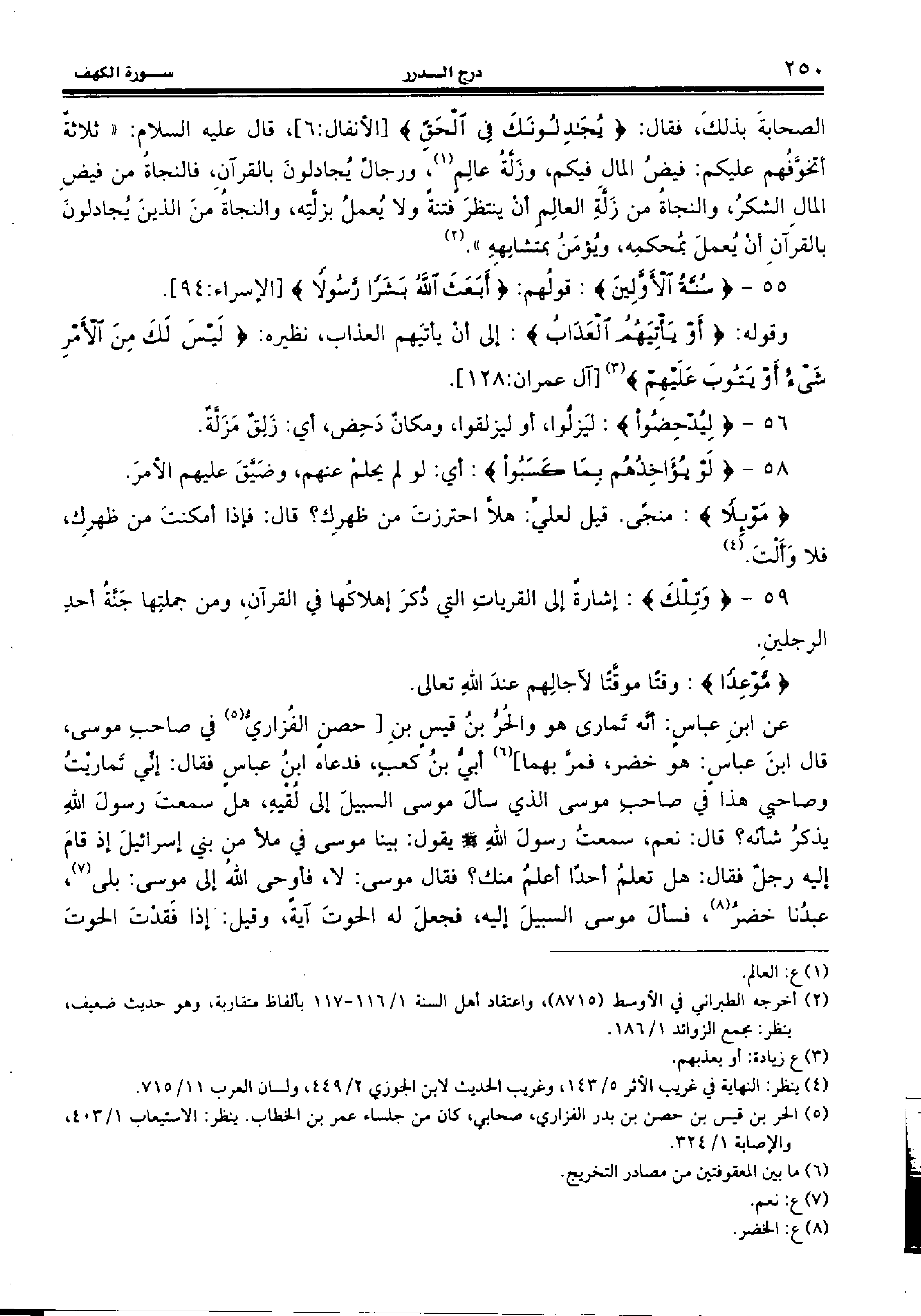 عن ابن عباس: أنّه تمارى هو والحرّ بن قيس بن [حصن الفزاريّ (¬5) في صاحب موسى، قال ابن عباس: هو خضر، فمرّ بهما] (¬6) أبيّ بن كعب، فدعاه ابن عباس فقال: إنّي تماريت وصاحبي هذا في صاحب موسى الذي سأل موسى السبيل إلى لقيه، هل سمعت رسول الله يذكر شأنه؟ قال: نعم، سمعت رسول الله صلّى الله عليه وسلّم يقول: بينا موسى في ملأ من بني إسرائيل إذ قام إليه رجل فقال: هل تعلم أحدا أعلم منك؟ فقال موسى: لا، فأوحى الله إلى موسى: بلى (¬7)، عبدنا خضر (¬8)، فسأل موسى السبيل إليه، فجعل له الحوت آية، وقيل: إذا فقدت الحوت