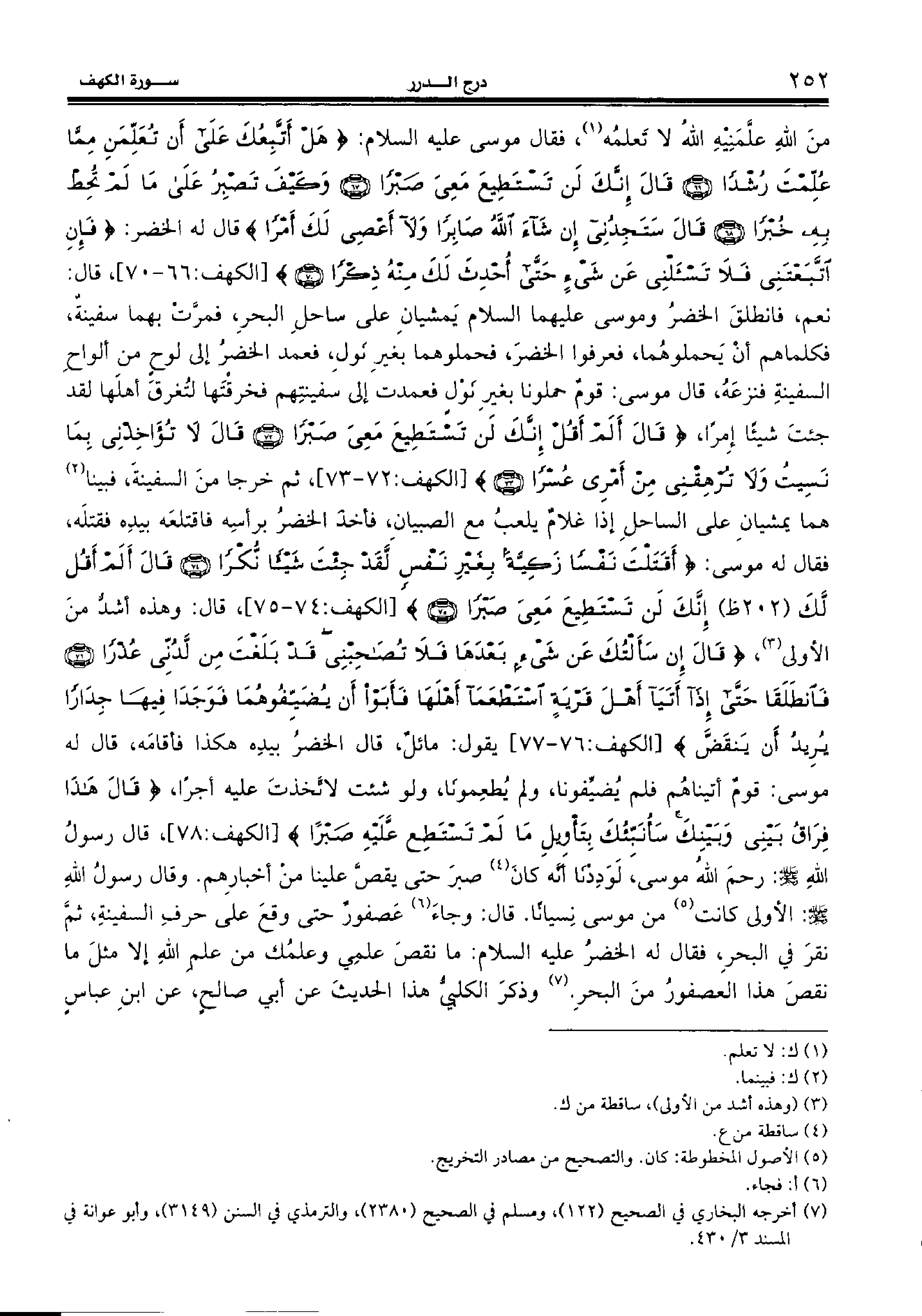 من الله علّمنيه الله لا تعلمه (¬1)، فقال موسى عليه السّلام: {هَلْ أَتَّبِعُكَ عَلى أَنْ تُعَلِّمَنِ مِمّا عُلِّمْتَ رُشْداً (66) قالَ إِنَّكَ لَنْ تَسْتَطِيعَ مَعِيَ صَبْراً (67) وَكَيْفَ تَصْبِرُ عَلى ما لَمْ تُحِطْ بِهِ خُبْراً (68) قالَ سَتَجِدُنِي إِنْ شاءَ اللهُ صابِراً وَلا أَعْصِي لَكَ أَمْراً} قال له الخضر: {فَإِنِ اِتَّبَعْتَنِي فَلا تَسْئَلْنِي عَنْ شَيْءٍ حَتّى أُحْدِثَ لَكَ مِنْهُ ذِكْراً} (70) [الكهف:66 - 70]، قال: