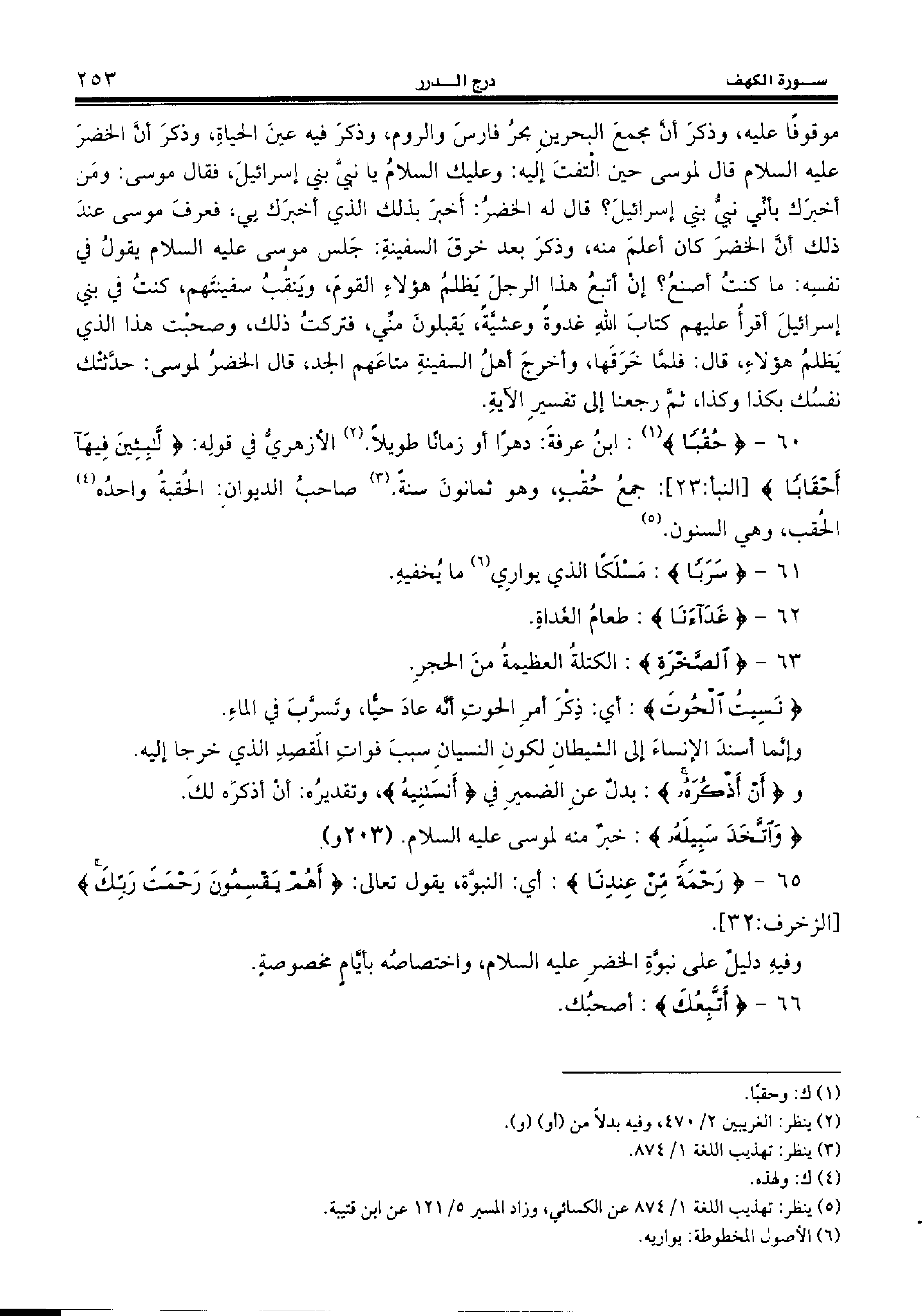 60 - {حُقُباً} (¬1): ابن عرفة: دهرا أو زمانا طويلا. (¬2) الأزهريّ في قوله: {لابِثِينَ فِيها أَحْقاباً} [النبأ:23]: جمع حقب، وهو ثمانون سنة. (¬3) صاحب الديوان: الحقبة واحده (¬4) الحقب، وهي السنون. (¬5)