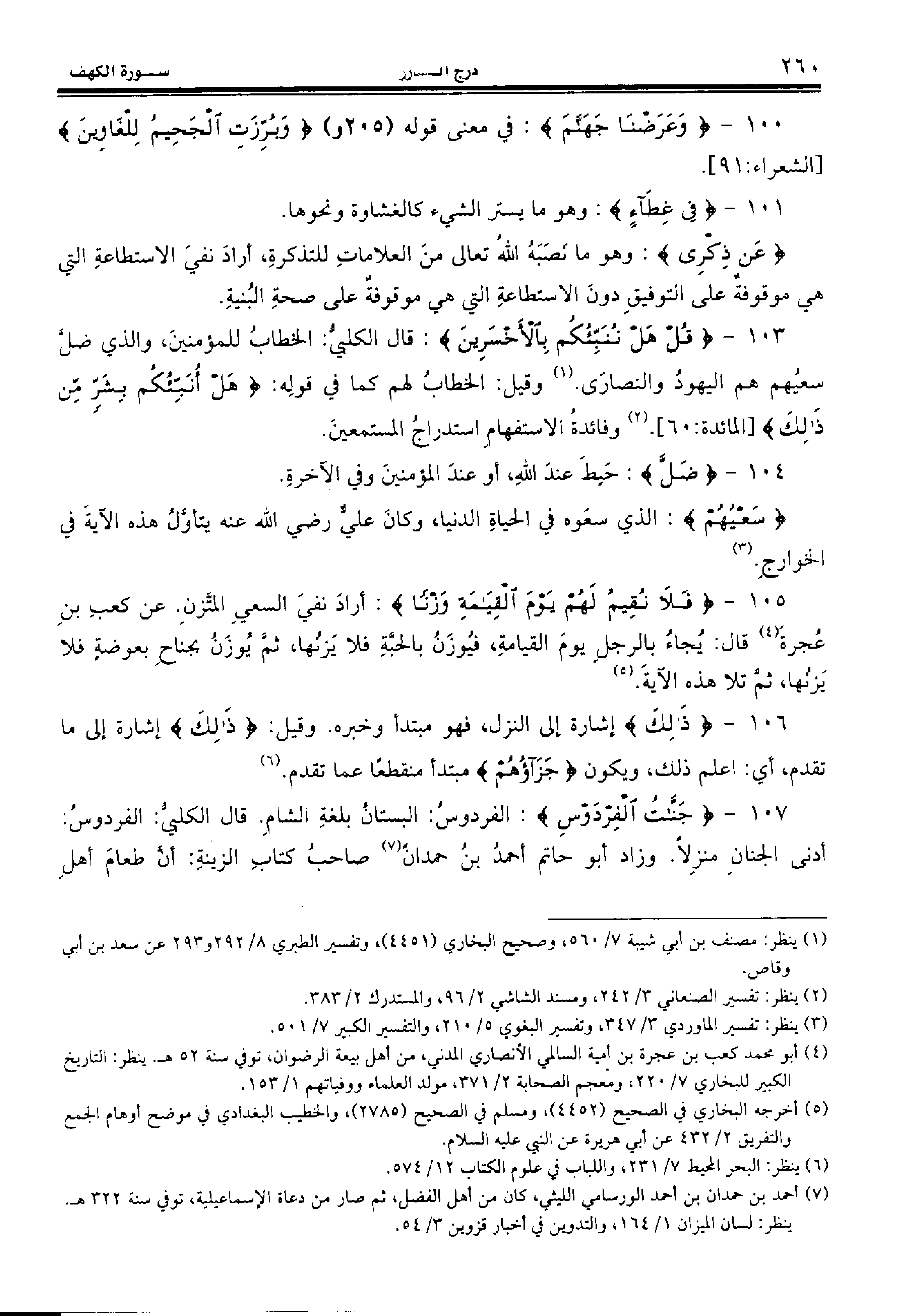 105 - {فَلا نُقِيمُ لَهُمْ يَوْمَ الْقِيامَةِ وَزْناً:} أراد نفي السعي المتّزن. عن كعب بن عجرة (¬4) قال: يجاء بالرجل يوم القيامة، فيوزن بالحبّة فلا يزنها، ثمّ يوزن بجناح بعوضة فلا يزنها، ثمّ تلا هذه الآية. (¬5)