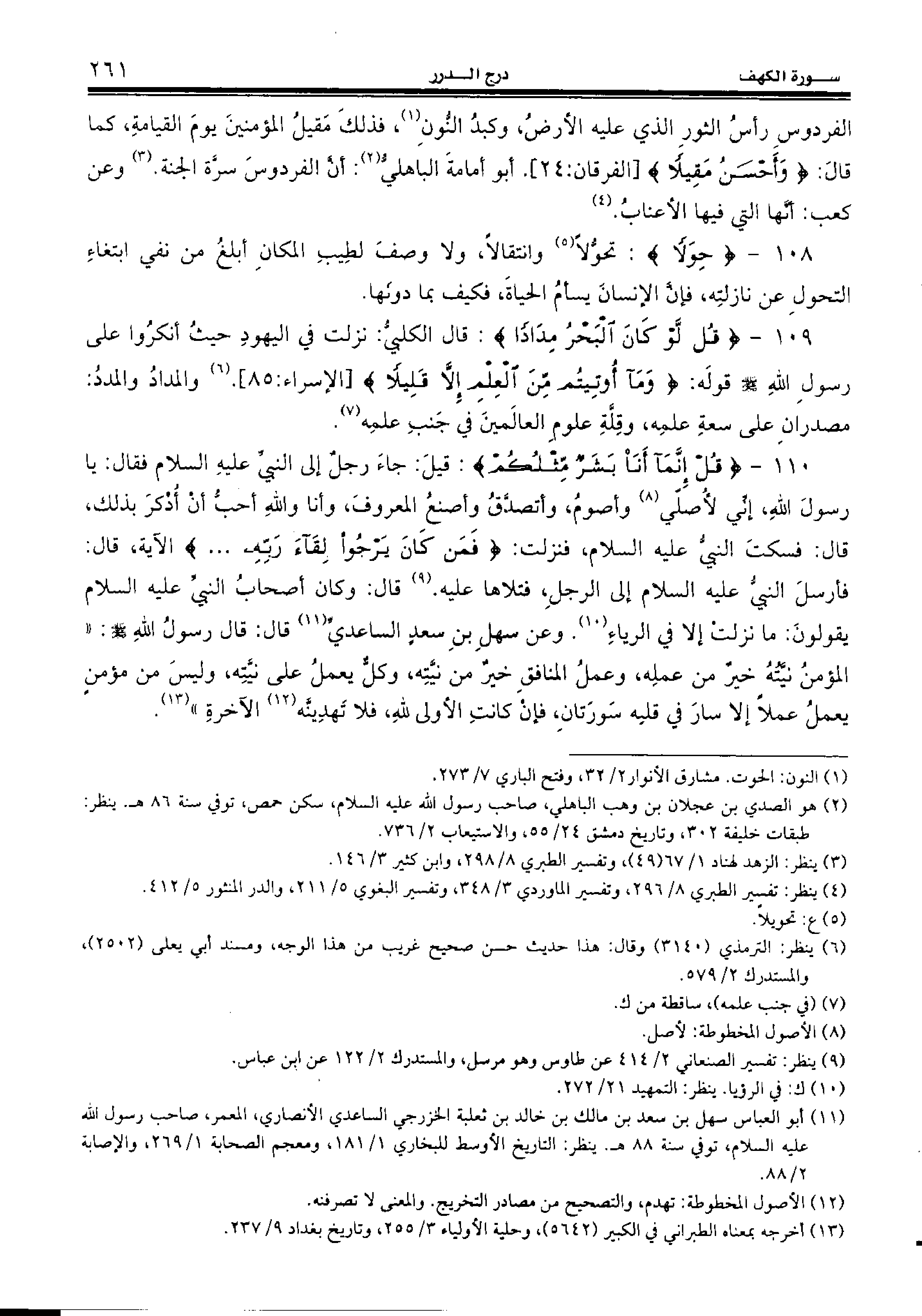 110 - {قُلْ إِنَّما أَنَا بَشَرٌ مِثْلُكُمْ:} قيل: جاء رجل إلى النبيّ عليه السّلام فقال: يا رسول الله، إنّي لأصلّي (¬8) وأصوم، وأتصدّق وأصنع المعروف، وأنا والله أحبّ أن أذكر بذلك، قال: فسكت النبيّ عليه السّلام، فنزلت: {فَمَنْ كانَ يَرْجُوا لِقاءَ رَبِّهِ. . .} الآية، قال:
