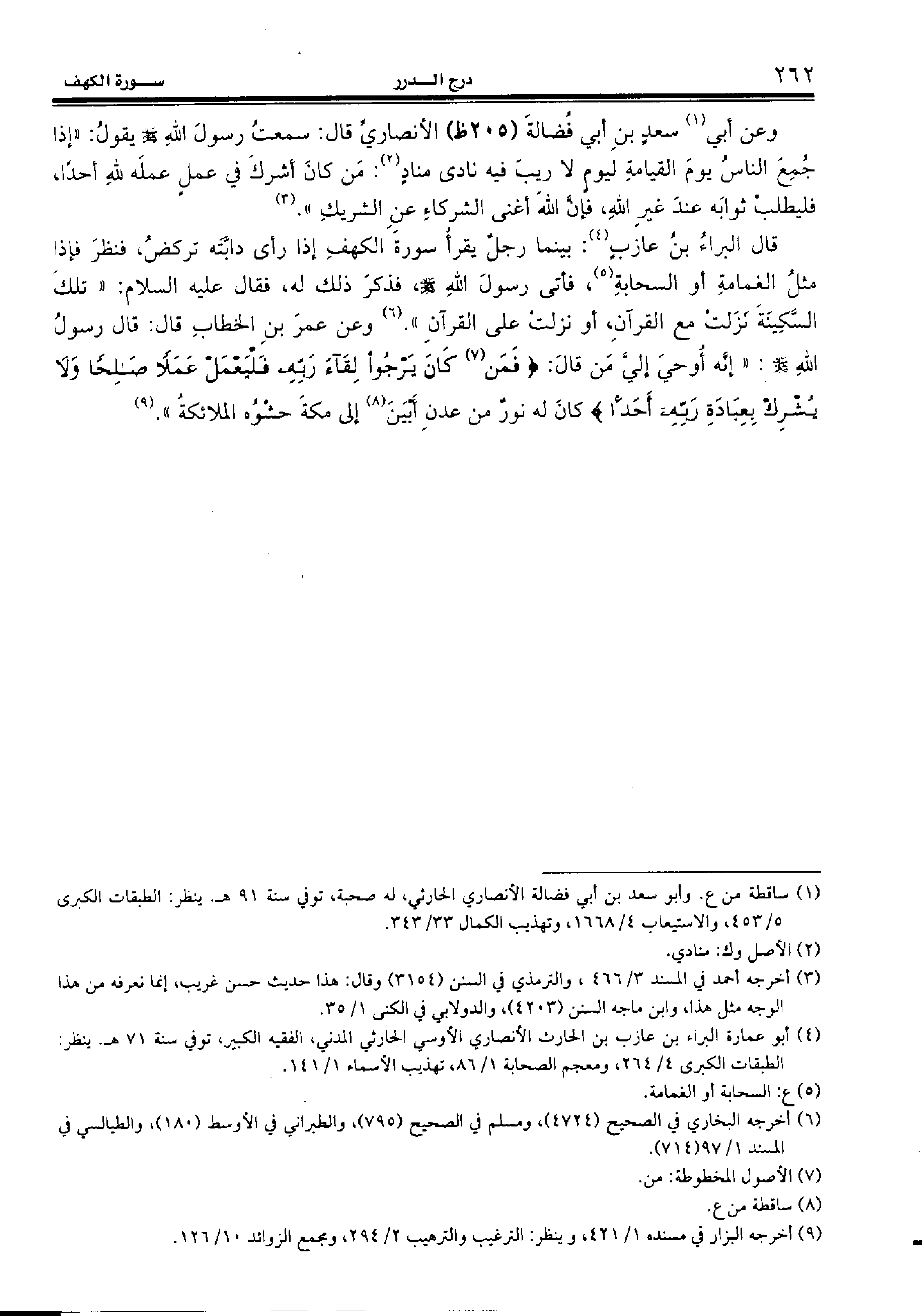 وعن أبي (¬1) سعد بن أبي فضالة (205 ظ) الأنصاريّ قال: سمعت رسول الله صلّى الله عليه وسلّم يقول: «إذا جمع الناس يوم القيامة ليوم لا ريب فيه نادى مناد (¬2): من كان أشرك في عمل عمله لله أحدا، فليطلب ثوابه عند غير الله، فإنّ الله أغنى الشركاء عن الشريك». (¬3)