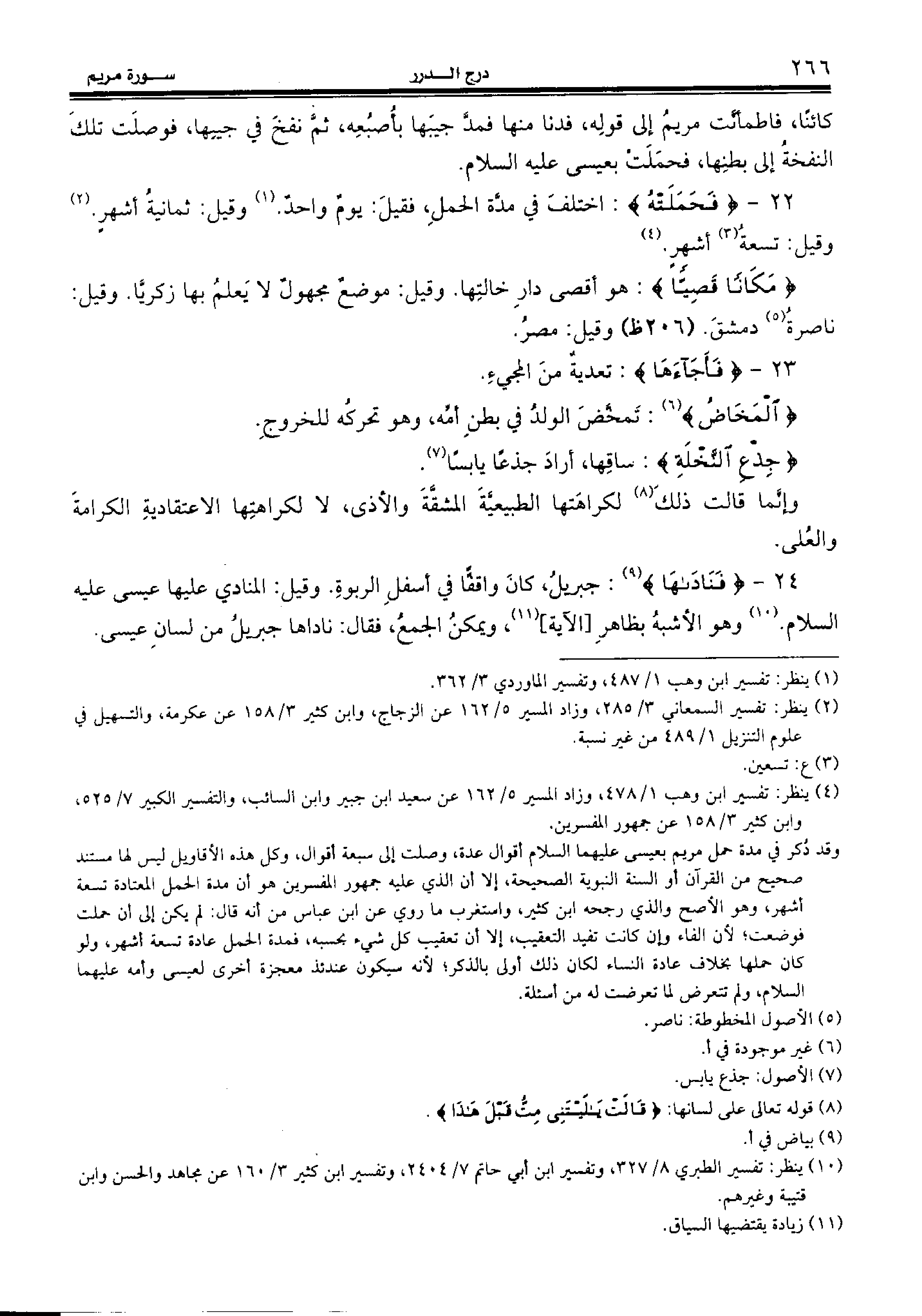 (¬4) ينظر: تفسير ابن وهب 1/ 478، وزاد المسير 5/ 162 عن سعيد ابن جبير وابن السائب، والتفسير الكبير 7/ 525، وابن كثير 3/ 158 عن جمهور المفسرين. وقد ذكر في مدة حمل مريم بعيسى عليهما السّلام أقوال عدة، وصلت إلى سبعة أقوال، وكل هذه الأقاويل ليس لها مستند صحيح من القرآن أو السنة النبوية الصحيحة، إلا أن الذي عليه جمهور المفسرين هو أن مدة الحمل المعتادة تسعة أشهر، وهو الأصح والذي رجحه ابن كثير، واستغرب ما روي عن ابن عباس من أنه قال: لم يكن إلى أن حملت فوضعت؛ لأن الفاء وإن كانت تفيد التعقيب، إلا أن تعقيب كل شيء بحسبه، فمدة الحمل عادة تسعة أشهر، ولو كان حملها بخلاف عادة النساء لكان ذلك أولى بالذكر؛ لأنه سيكون عندئذ معجزة أخرى لعيسى وأمه عليهما السّلام، ولم تتعرض لما تعرضت له من أسئلة.