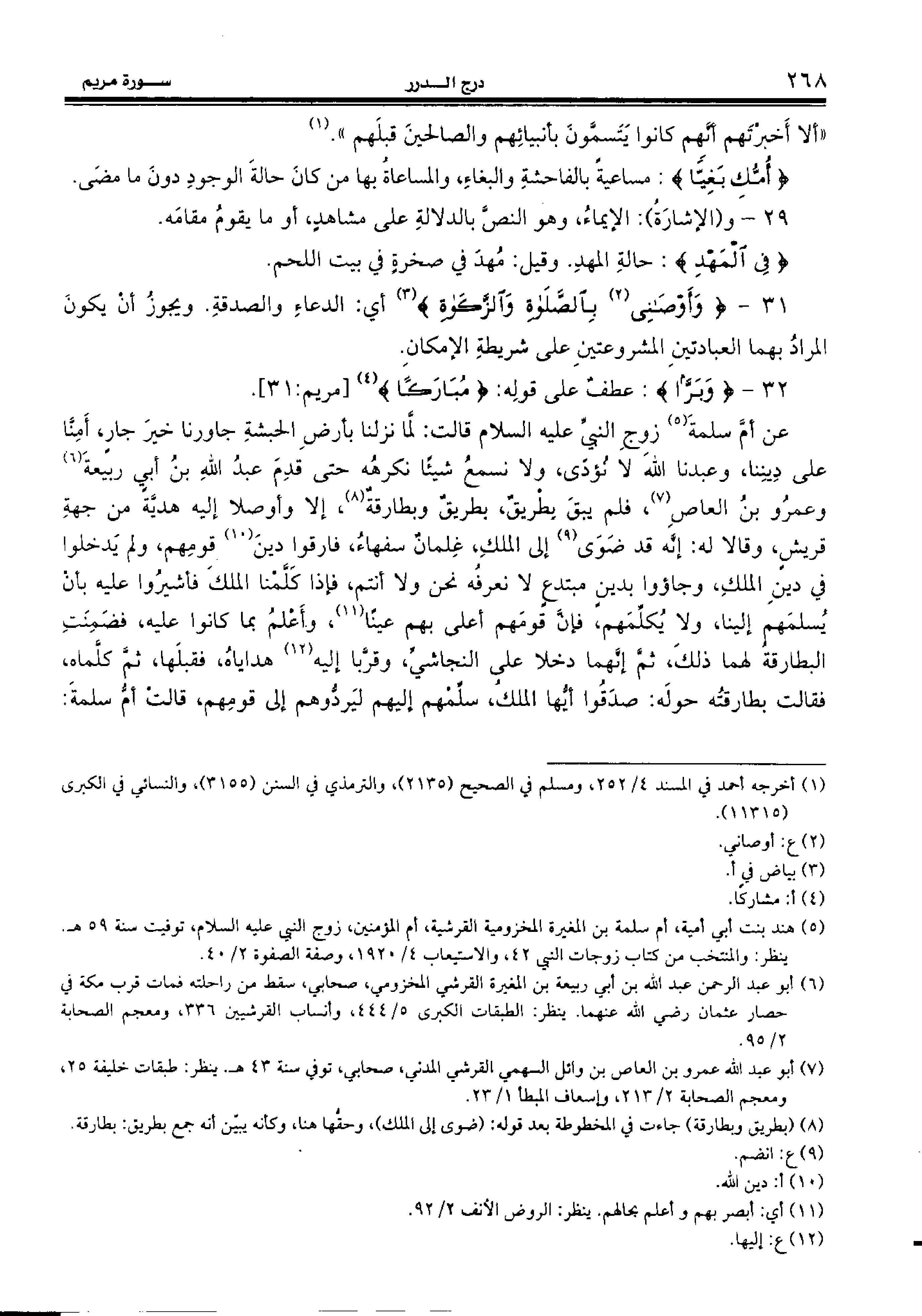 عن أمّ سلمة (¬5) زوج النبيّ عليه السّلام قالت: لّما نزلنا بأرض الحبشة جاورنا خير جار، أمنّا على ديننا، وعبدنا الله لا نؤدّى، ولا نسمع شيئا نكرهه حتى قدم عبد الله بن أبي ربيعة (¬6) وعمرو بن العاص (¬7)، فلم يبق بطريق، بطريق وبطارقة (¬8)، إلا وأوصلا إليه هديّة من جهة قريش، وقالا له: إنّه قد ضوى (¬9) إلى الملك، غلمان سفهاء، فارقوا دين (¬10) قومهم، ولم يدخلوا في دين الملك، وجاؤوا بدين مبتدع لا نعرفه نحن ولا أنتم، فإذا كلّمنا الملك فأشيروا عليه بأن يسلمهم إلينا، ولا يكلّمهم، فإنّ قومهم أعلى بهم عينا (¬11)، وأعلم بما كانوا عليه، فضمنت البطارقة لهما ذلك، ثمّ إنّهما دخلا على النجاشيّ، وقرّبا إليه (¬12) هداياه، فقبلها، ثمّ كلّماه، فقالت بطارقته حوله: صدقوا أيّها الملك، سلّمهم إليهم ليردّوهم إلى قومهم، قالت أمّ سلمة: