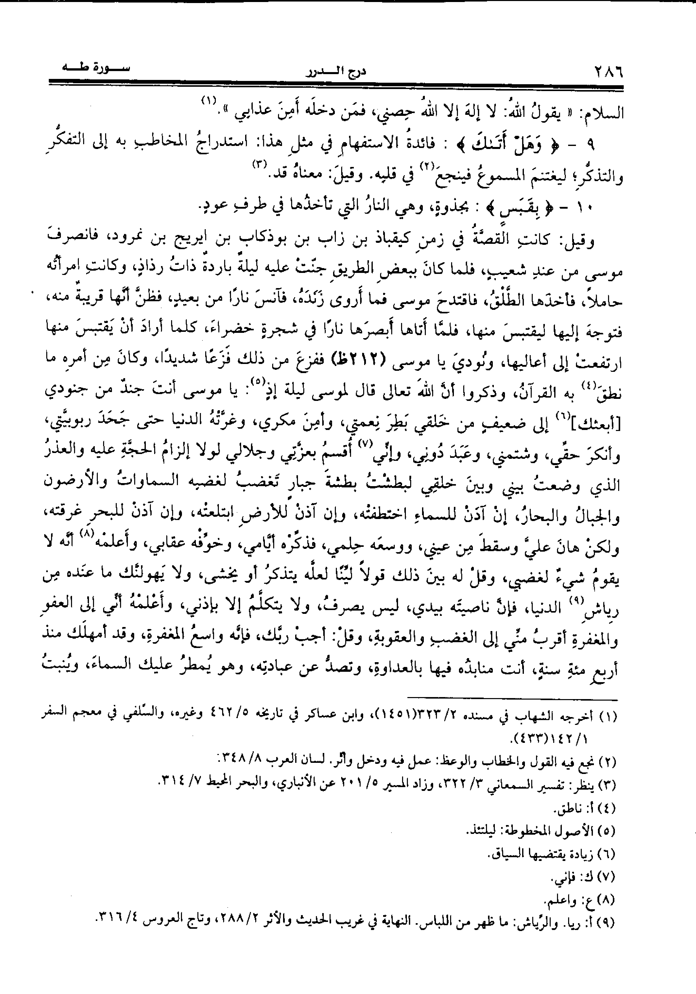وقيل: كانت القصّة في زمن كيقباذ بن زاب بن بوذكاب بن ايريج بن نمرود، فانصرف موسى من عند شعيب، فلما كان ببعض الطريق جنّت عليه ليلة باردة ذات رذاذ، وكانت امرأته حاملا، فأخذها الطّلق، فاقتدح موسى فما أروى زنده، فآنس نارا من بعيد، فظنّ أنّها قريبة منه، فتوجه إليها ليقتبس منها، فلمّا أتاها أبصرها نارا في شجرة خضراء، كلما أراد أن يقتبس منها ارتفعت إلى أعاليها، ونودي يا موسى (212 ظ) ففزع من ذلك فزعا شديدا، وكان من أمره ما نطق (¬4) به القرآن، وذكروا أنّ الله تعالى قال لموسى ليلة إذ (¬5): يا موسى أنت جند من جنودي [أبعثك] (¬6) إلى ضعيف من خلقي بطر نعمتي، وأمن مكري، وغرّته الدنيا حتى جحد ربوبيّتي، وأنكر حقّي، وشتمني، وعبد دوني، وإنّي (¬7) أقسم بعزّتي وجلالي لولا إلزام الحجّة عليه والعذر الذي وضعت بيني وبين خلقي لبطشت بطشة جبار تغضب لغضبه السماوات والأرضون والجبال والبحار، إن آذن للسماء اختطفته، وإن آذن للأرض ابتلعته، وإن آذن للبحر غرقته، ولكن هان عليّ وسقط من عيني، ووسعه حلمي، فذكّره أيّامي، وخوّفه عقابي، وأعلمه (¬8) أنّه لا يقوم شيء لغضبي، وقل له بين ذلك قولا ليّنا لعلّه يتذكر أو يخشى، ولا يهولنّك ما عنده من رياش (¬9) الدنيا، فإنّ ناصيته بيدي، ليس يصرف، ولا يتكلّم إلا بإذني، وأعلمه أنّي إلى العفو والمغفرة أقرب منّي إلى الغضب والعقوبة، وقل: أجب ربّك، فإنّه واسع المغفرة، وقد أمهلك منذ أربع مئة سنة، أنت منابذه فيها بالعداوة، وتصدّ عن عبادته، وهو يمطر عليك السماء، وينبت