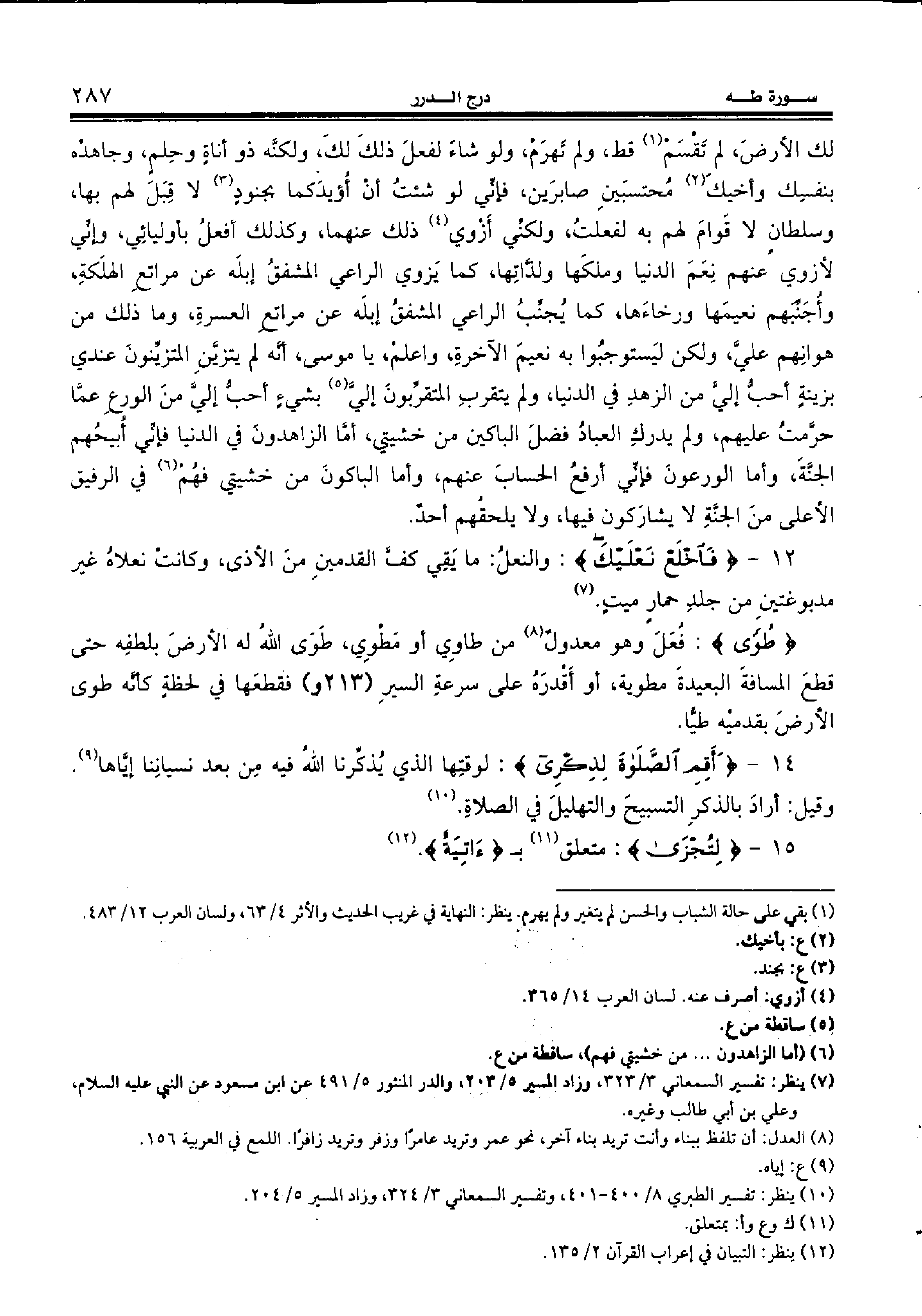 12 - {فَاخْلَعْ نَعْلَيْكَ:} والنعل: ما يقي كفّ القدمين من الأذى، وكانت نعلاه غير مدبوغتين من جلد حمار ميت. (¬7)