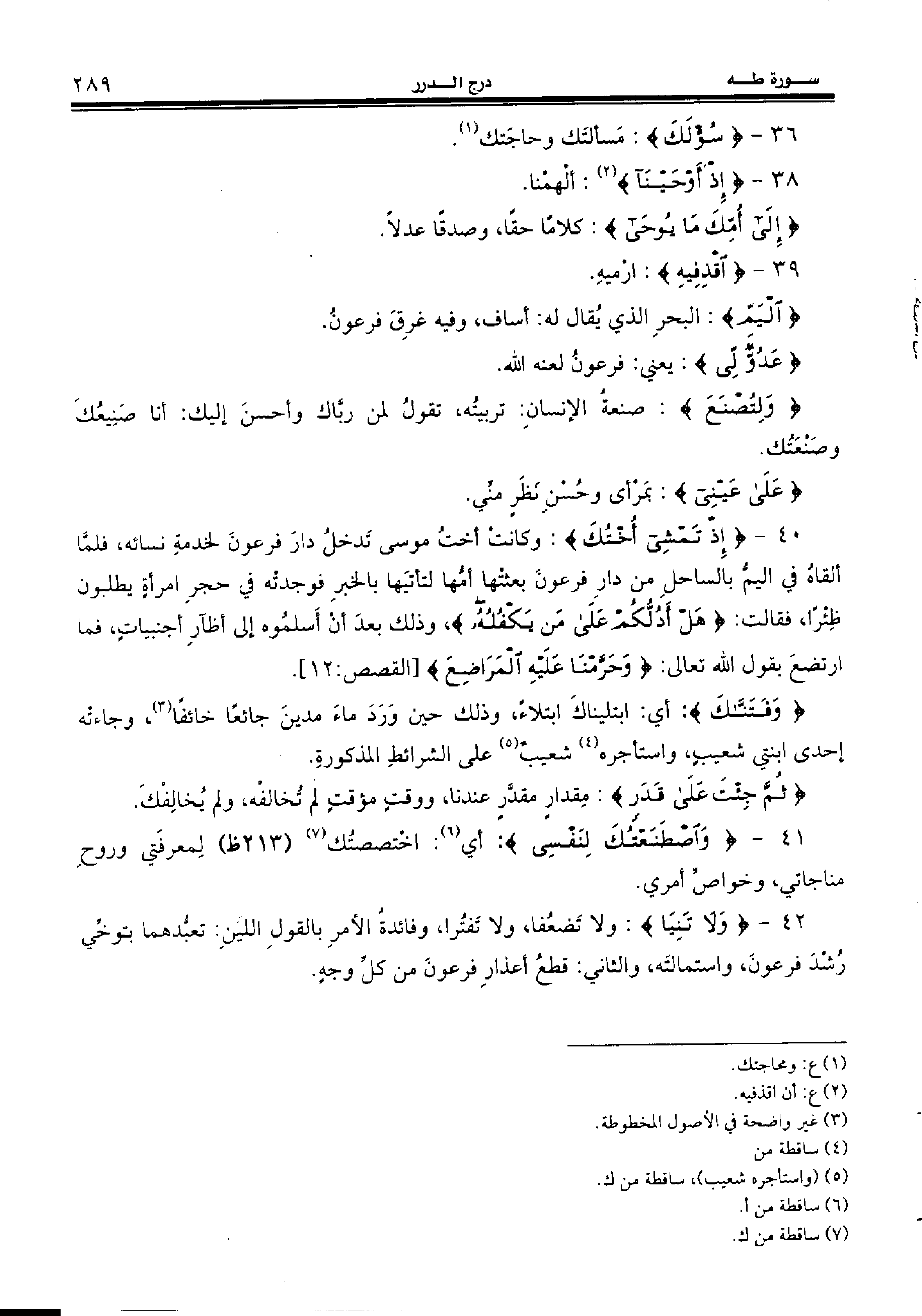 40 - {إِذْ تَمْشِي أُخْتُكَ:} وكانت أخت موسى تدخل دار فرعون لخدمة نسائه، فلمّا ألقاه في اليمّ بالساحل من دار فرعون بعثتها أمّها لتأتيها بالخبر فوجدته في حجر امرأة يطلبون ظئرا، فقالت: {هَلْ أَدُلُّكُمْ عَلى مَنْ يَكْفُلُهُ،} وذلك بعد أن أسلموه إلى أظآر أجنبيات، فما ارتضع بقول الله تعالى: {وَحَرَّمْنا عَلَيْهِ الْمَراضِعَ} [القصص:12].