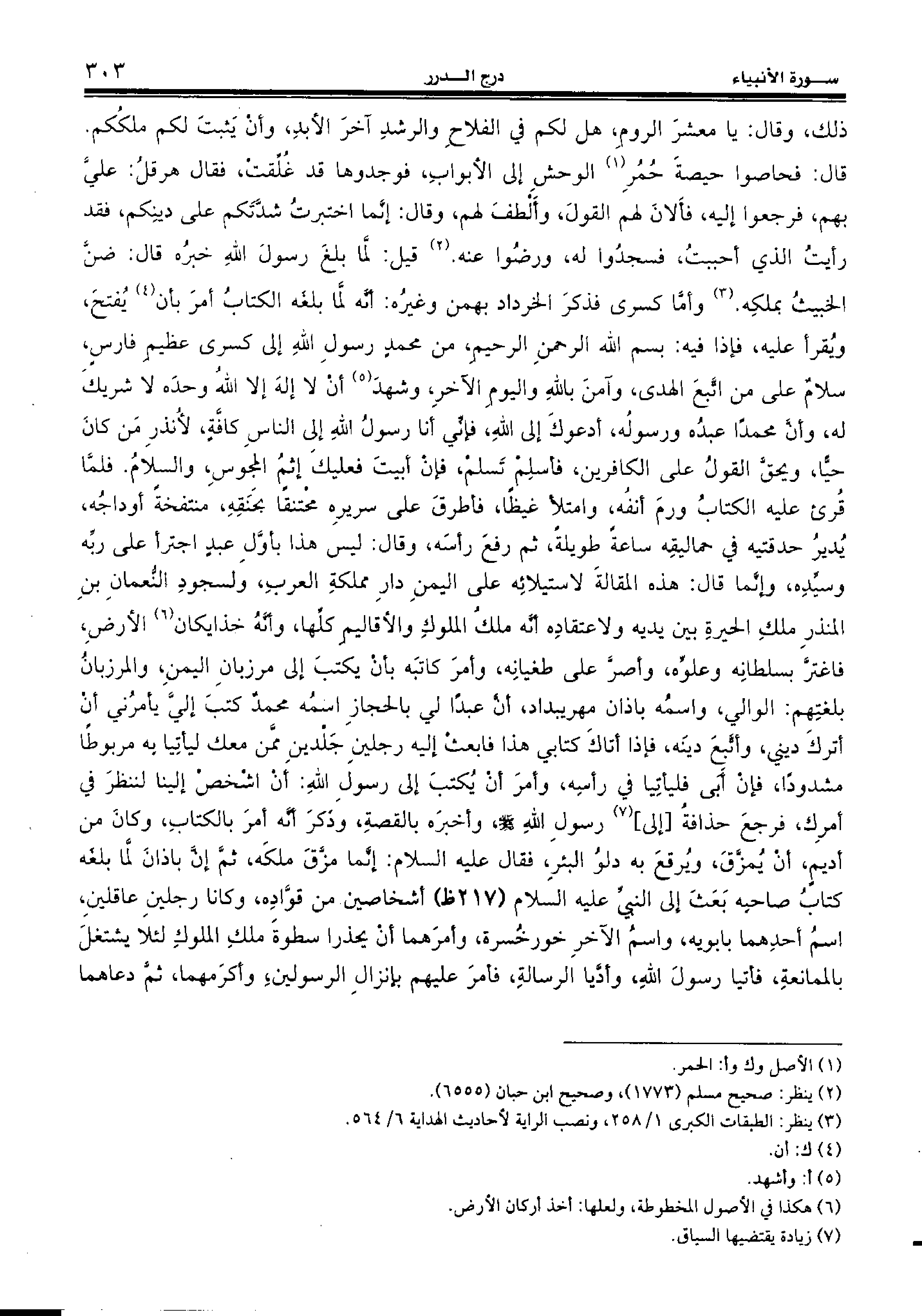 قال: فحاصوا حيصة حمر (¬1) الوحش إلى الأبواب، فوجدوها قد غلّقت، فقال هرقل: عليّ بهم، فرجعوا إليه، فألان لهم القول، وألطف لهم، وقال: إنّما اختبرت شدّتكم على دينكم، فقد رأيت الذي أحببت، فسجدوا له، ورضوا عنه. (¬2) قيل: لّما بلغ رسول الله خبره قال: ضنّ الخبيث بملكه. (¬3) وأمّا كسرى فذكر الخرداد بهمن وغيره: أنّه لّما بلغه الكتاب أمر بأن (¬4) يفتح، ويقرأ عليه، فإذا فيه: بسم الله الرحمن الرحيم، من محمد رسول الله إلى كسرى عظيم فارس، سلام على من اتّبع الهدى، وآمن بالله واليوم الآخر، وشهد (¬5) أن لا إله إلا الله وحده لا شريك له، وأنّ محمدا عبده ورسوله، أدعوك إلى الله، فإنّي أنا رسول الله إلى الناس كافّة، لأنذر من كان حيّا، ويحقّ القول على الكافرين، فأسلم تسلم، فإن أبيت فعليك إثم المجوس، والسّلام. فلمّا قرئ عليه الكتاب ورم أنفه، وامتلأ غيظا، فأطرق على سريره محتنقا بحنقه، منتفخة أوداجه، يدير حدقتيه في حماليقه ساعة طويلة، ثم رفع رأسه، وقال: ليس هذا بأوّل عبد اجترأ على ربّه وسيّده، وإنّما قال: هذه المقالة لاستيلائه على اليمن دار مملكة العرب، ولسجود النّعمان بن المنذر ملك الحيرة بين يديه ولاعتقاده أنّه ملك الملوك والأقاليم كلّها، وأنّه خذايكان (¬6) الأرض، فاغترّ بسلطانه وعلوّه، وأصرّ على طغيانه، وأمر كاتبه بأن يكتب إلى مرزبان اليمن، والمرزبان بلغتهم: الوالي، واسمه باذان مهريبداد، أنّ عبدا لي بالحجاز اسمه محمد كتب إليّ يأمرني أن أترك ديني، وأتّبع دينه، فإذا أتاك كتابي هذا فابعث إليه رجلين جلدين ممّن معك ليأتيا به مربوطا مشدودا، فإن أبى فليأتيا في رأسه، وأمر أن يكتب إلى رسول الله: أن اشخص إلينا لننظر في أمرك، فرجع حذافة [إلى] (¬7) رسول الله صلّى الله عليه وسلّم، وأخبره بالقصة، وذكر أنّه أمر بالكتاب، وكان من أديم، أن يمزّق، ويرقع به دلو البئر، فقال عليه السّلام: إنّما مزّق ملكه، ثمّ إنّ باذان لّما بلغه كتاب صاحبه بعث إلى النبيّ عليه السّلام (217 ظ) أشخاصين من قوّاده، وكانا رجلين عاقلين، اسم أحدهما بابويه، واسم الآخر خورخسرة، وأمرهما أن يحذرا سطوة ملك الملوك لئلا يشتغل بالممانعة، فأتيا رسول الله، وأدّيا الرسالة، فأمر عليهم بإنزال الرسولين، وأكرمهما، ثمّ دعاهما