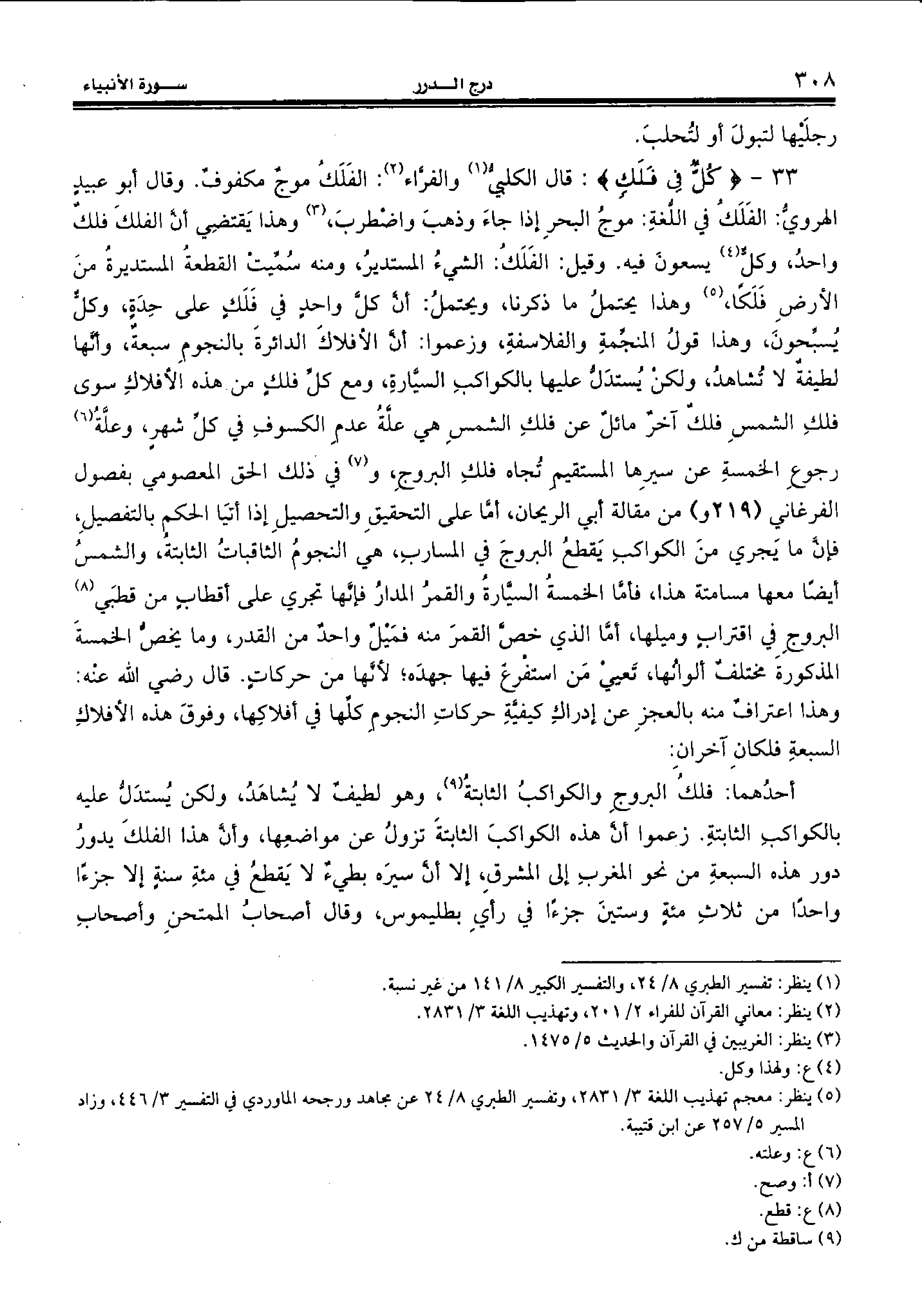 33 - {كُلٌّ فِي فَلَكٍ:} قال الكلبيّ (¬1) والفرّاء (¬2): الفلك موج مكفوف. وقال أبو عبيد الهرويّ: الفلك في اللّغة: موج البحر إذا جاء وذهب واضطرب، (¬3) وهذا يقتضي أنّ الفلك فلك واحد، وكلّ (¬4) يسعون فيه. وقيل: الفلك: الشيء المستدير، ومنه سمّيت القطعة المستديرة من الأرض فلكا، (¬5) وهذا يحتمل ما ذكرنا، ويحتمل: أنّ كلّ واحد في فلك على حدة، وكلّ يسبّحون، وهذا قول المنجّمة والفلاسفة، وزعموا: أنّ الأفلاك الدائرة بالنجوم سبعة، وأنّها لطيفة لا تشاهد، ولكن يستدلّ عليها بالكواكب السيّارة، ومع كلّ فلك من هذه الأفلاك سوى فلك الشمس فلك آخر مائل عن فلك الشمس هي علّة عدم الكسوف في كلّ شهر، وعلّة (¬6) رجوع الخمسة عن سيرها المستقيم تجاه فلك البروج، و (¬7) في ذلك الحق المعصومي بفصول الفرغاني (219 و) من مقالة أبي الريحان، أمّا على التحقيق والتحصيل إذا أتيا الحكم بالتفصيل، فإنّ ما يجري من الكواكب يقطع البروج في المسارب، هي النجوم الثاقبات الثابتة، والشمس أيضا معها مسامتة هذا، فأمّا الخمسة السيّارة والقمر المدار فإنّها تجري على أقطاب من قطبي (¬8) البروج في اقتراب وميلها، أمّا الذي خصّ القمر منه فميل واحد من القدر، وما يخصّ الخمسة المذكورة مختلف ألوانها، تعيي من استفرغ فيها جهده؛ لأنّها من حركات. قال رضي الله عنه: