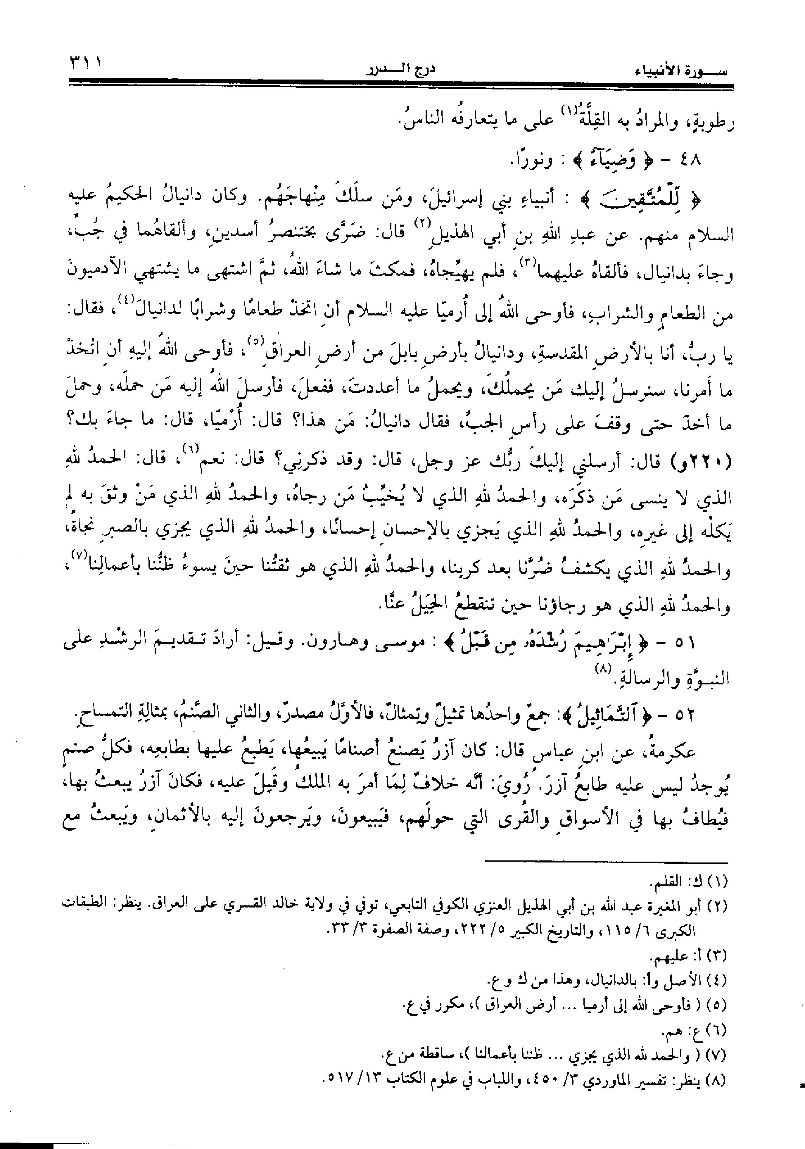52 - {التَّماثِيلُ:} جمع واحدها تمثيل وتمثال، فالأوّل مصدر، والثاني الصّنم، بمثالة التمساح.