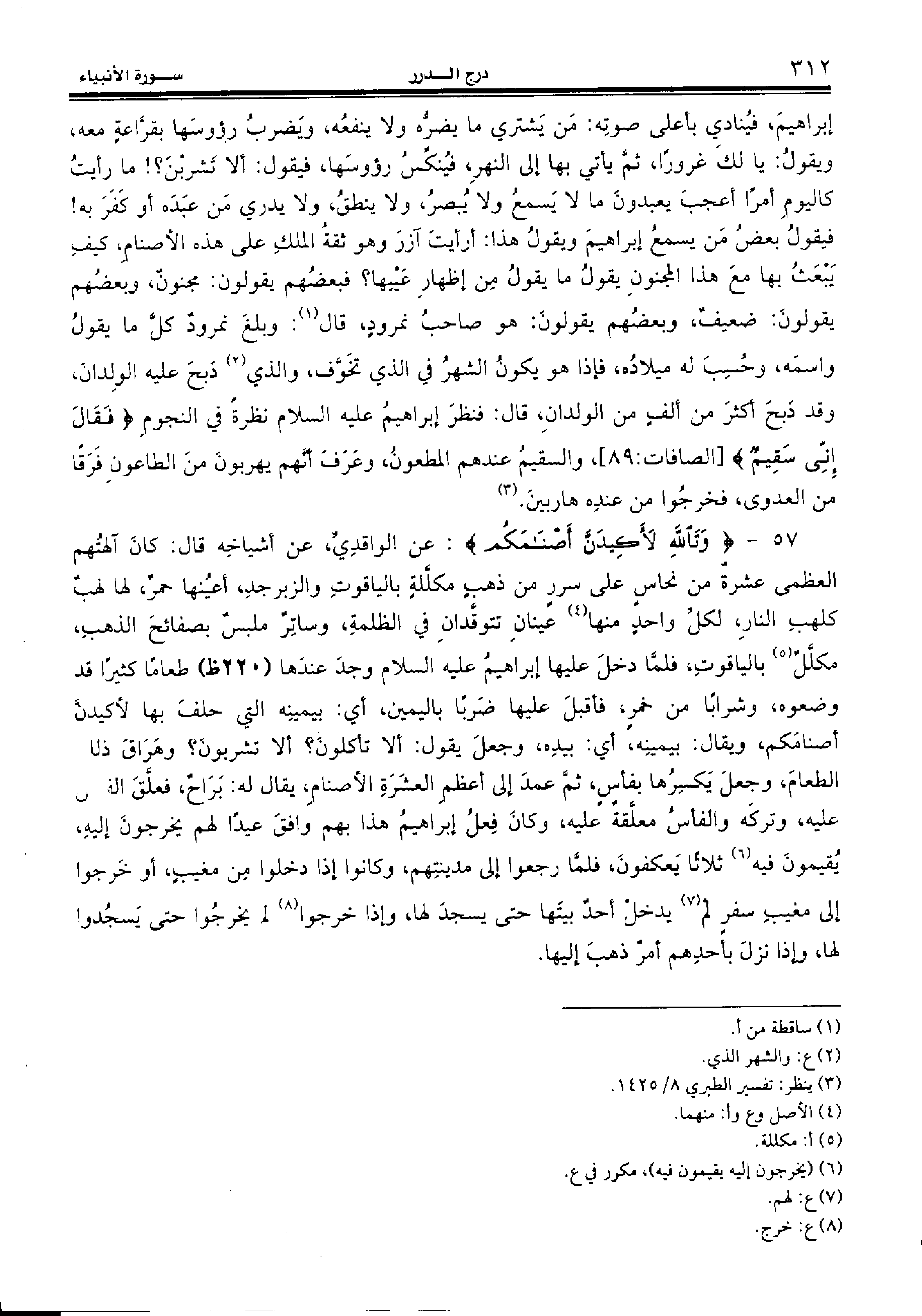 57 - {وَتَاللهِ لَأَكِيدَنَّ أَصْنامَكُمْ:} عن الواقديّ، عن أشياخه قال: كان آلهتهم العظمى عشرة من نحاس على سرر من ذهب مكلّلة بالياقوت والزبرجد، أعينها حمر، لها لهب كلهب النار، لكلّ واحد منها (¬4) عينان تتوقّدان في الظلمة، وساتر ملبس بصفائح الذهب، مكلّل (¬5) بالياقوت، فلمّا دخل عليها إبراهيم عليه السّلام وجد عندها (220 ظ) طعاما كثيرا قد وضعوه، وشرابا من خمر، فأقبل عليها ضربا باليمين، أي: بيمينه التي حلف بها لأكيدنّ أصنامكم، ويقال: بيمينه، أي: بيده، وجعل يقول: ألا تأكلون؟ ألا تشربون؟ وهراق ذلك الطعام، وجعل يكسرها بفأس، ثمّ عمد إلى أعظم العشرة الأصنام، يقال له: براح، فعلّق الفأس عليه، وتركه والفأس معلّقة عليه، وكان فعل إبراهيم هذا بهم وافق عيدا لهم يخرجون إليه، يقيمون فيه (¬6) ثلاثا يعكفون، فلمّا رجعوا إلى مدينتهم، وكانوا إذا دخلوا من مغيب، أو خرجوا إلى مغيب سفر لم (¬7) يدخل أحد بيتها حتى يسجد لها، وإذا خرجوا (¬8) لم يخرجوا حتى يسجدوا لها، وإذا نزل بأحدهم أمر ذهب إليها.