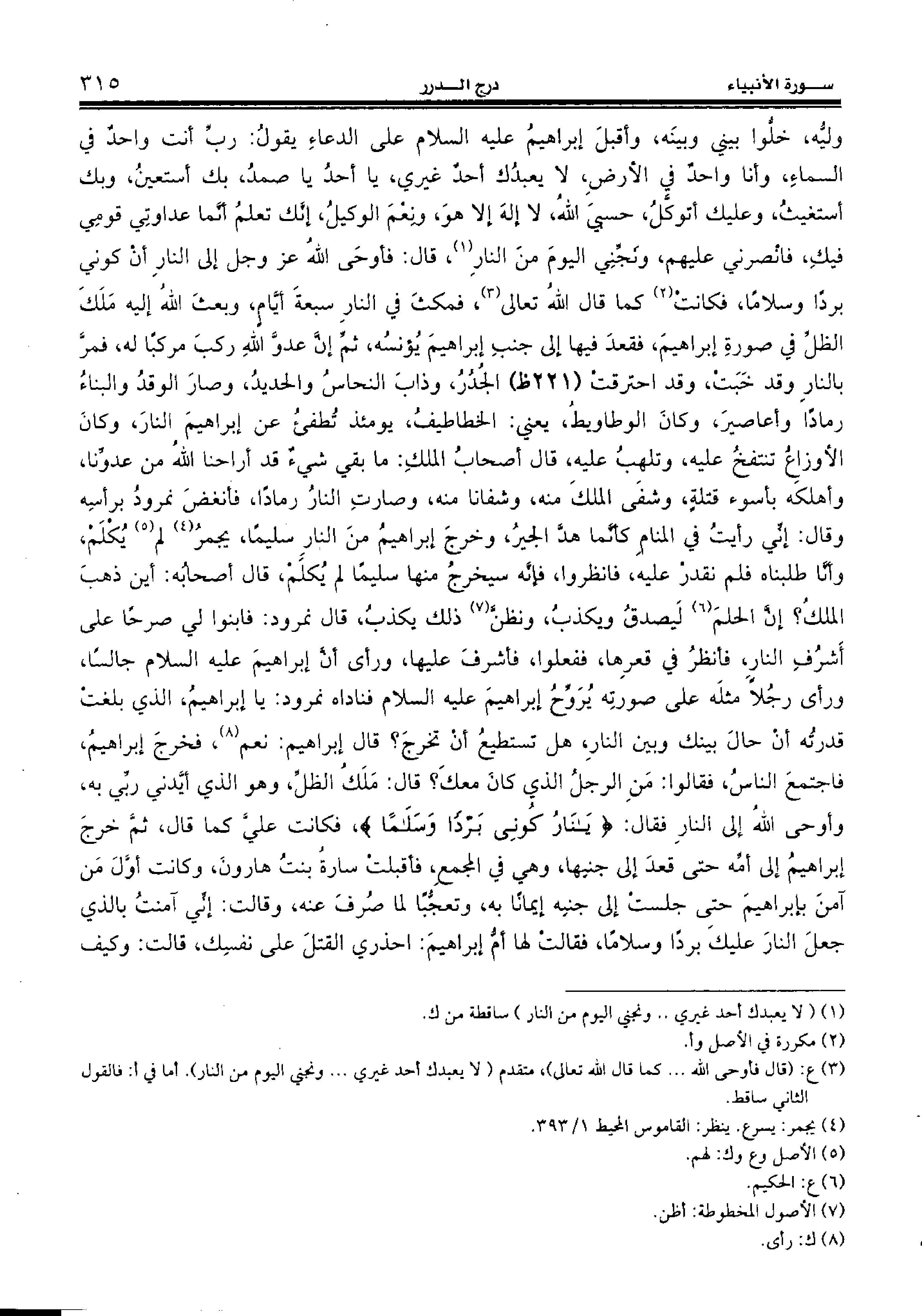 وليّه، خلّوا بيني وبينه، وأقبل إبراهيم عليه السّلام على الدعاء يقول: ربّ أنت واحد في السماء، وأنا واحد في الأرض، لا يعبدك أحد غيري، يا أحد يا صمد، بك أستعين، وبك أستغيث، وعليك أتوكّل، حسبي الله، لا إله إلا هو، ونعم الوكيل، إنّك تعلم أنّما عداوتي قومي فيك، فانصرني عليهم، ونجّني اليوم من النار (¬1)، قال: فأوحى الله عز وجل إلى النار أن كوني بردا وسلاما، فكانت (¬2) كما قال الله تعالى (¬3)، فمكث في النار سبعة أيّام، وبعث الله إليه ملك الظلّ في صورة إبراهيم، فقعد فيها إلى جنب إبراهيم يؤنسه، ثمّ إنّ عدوّ الله ركب مركبا له، فمرّ بالنار وقد خبت، وقد احترقت (221 ظ) الجدر، وذاب النحاس والحديد، وصار الوقد والبناء رمادا وأعاصير، وكان الوطاويط، يعني: الخطاطيف، يومئذ تطفئ عن إبراهيم النار، وكان الأوزاع تنتفخ عليه، وتلهب عليه، قال أصحاب الملك: ما بقي شيء قد أراحنا الله من عدوّنا، وأهلكه بأسوء قتلة، وشفى الملك منه، وشفانا منه، وصارت النار رمادا، فأنغض نمرود برأسه وقال: إنّي رأيت في المنام كأنّما هدّ الجير، وخرج إبراهيم من النار سليما، يجمر (¬4) لم (¬5) يكلم، وأنّا طلبناه فلم نقدر عليه، فانظروا، فإنّه سيخرج منها سليما لم يكلم، قال أصحابه: أين ذهب الملك؟ إنّ الحلم (¬6) ليصدق ويكذب، ونظنّ (¬7) ذلك يكذب، قال نمرود: فابنوا لي صرحا على أشرف النار، فأنظر في قعرها، ففعلوا، فأشرف عليها، ورأى أنّ إبراهيم عليه السّلام جالسا، ورأى رجلا مثله على صورته يروّح إبراهيم عليه السّلام فناداه نمرود: يا إبراهيم، الذي بلغت قدرته أن حال بينك وبين النار، هل تستطيع أن تخرج؟ قال إبراهيم: نعم (¬8)، فخرج إبراهيم، فاجتمع الناس، فقالوا: من الرجل الذي كان معك؟ قال: ملك الظلّ، وهو الذي أيّدني ربّي به، وأوحى الله إلى النار فقال: {يا نارُ كُونِي بَرْداً وَسَلاماً} فكانت عليّ كما قال، ثمّ خرج إبراهيم إلى أمّه حتى قعد إلى جنبها، وهي في المجمع، فأقبلت سارة بنت هارون، وكانت أوّل من آمن بإبراهيم حتى جلست إلى جنبه إيمانا به، وتعجّبا لما صرف عنه، وقالت: إنّي آمنت بالذي جعل النار عليك بردا وسلاما، فقالت لها أمّ إبراهيم: احذري القتل على نفسك، قالت: وكيف