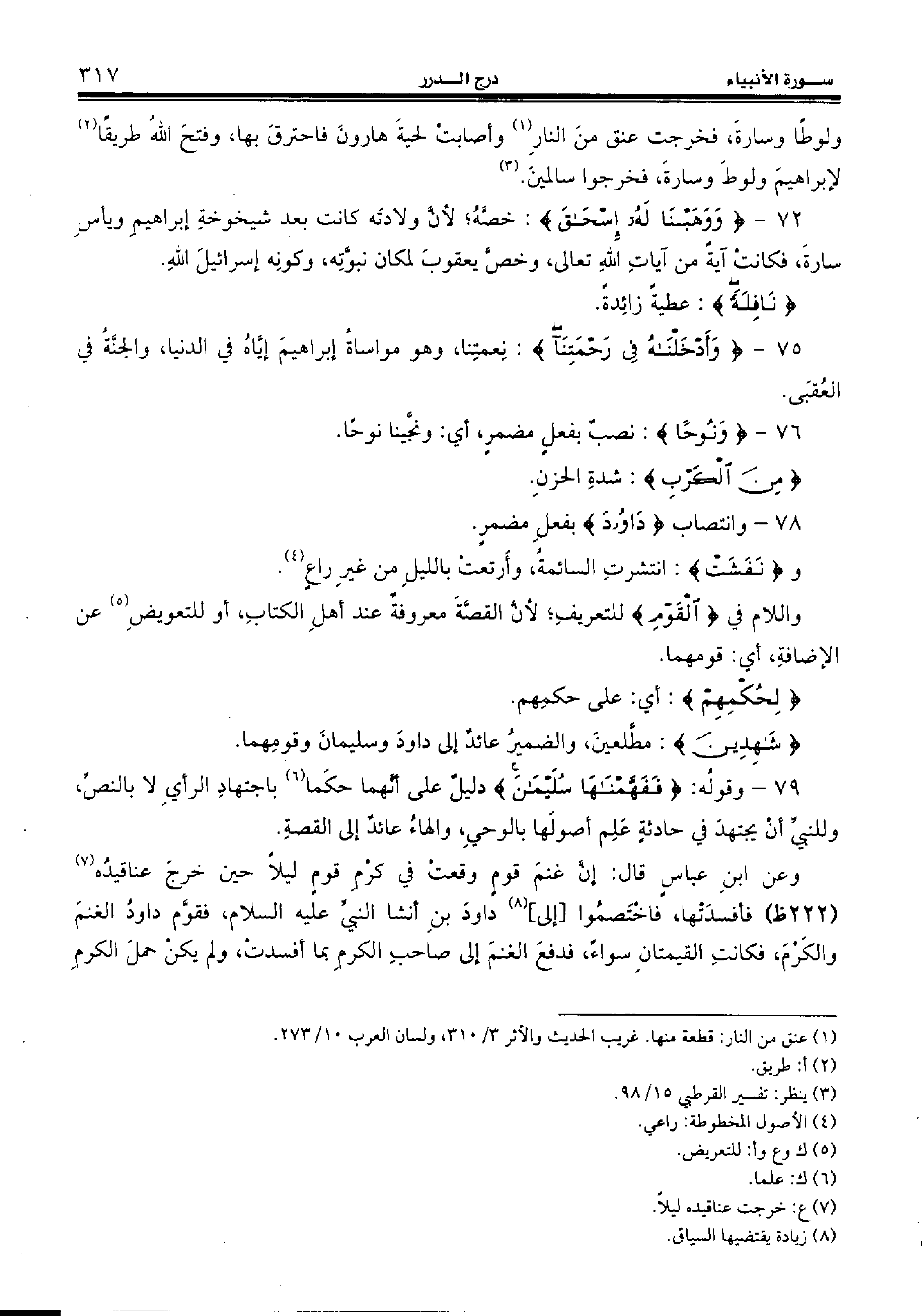 79 - وقوله: {فَفَهَّمْناها سُلَيْمانَ} دليل على أنّهما حكما (¬6) باجتهاد الرأي لا بالنصّ، وللنبيّ أن يجتهد في حادثة علم أصولها بالوحي، والهاء عائد إلى القصة.