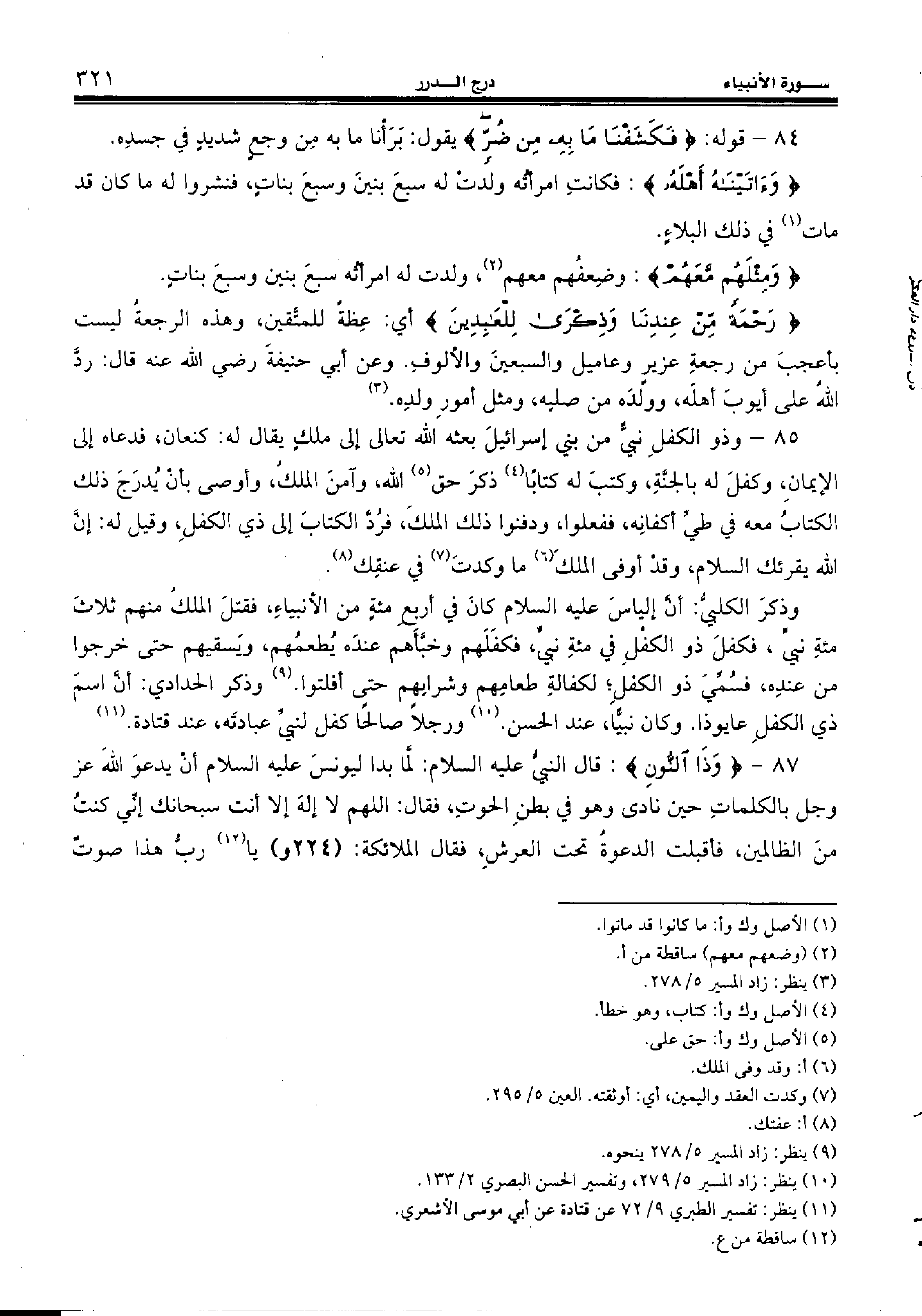 وذكر الكلبيّ: أنّ إلياس عليه السّلام كان في أربع مئة من الأنبياء، فقتل الملك منهم ثلاث مئة نبيّ، فكفل ذو الكفل في مئة نبيّ، فكفلهم وخبّأهم عنده يطعمهم، ويسقيهم حتى خرجوا من عنده، فسمّي ذو الكفل؛ لكفالة طعامهم وشرابهم حتى أفلتوا. (¬9) وذكر الحدادي: أنّ اسم ذي الكفل عايوذا. وكان نبيّا، عند الحسن. (¬10) ورجلا صالحا كفل لنبيّ عبادته، عند قتادة. (¬11)