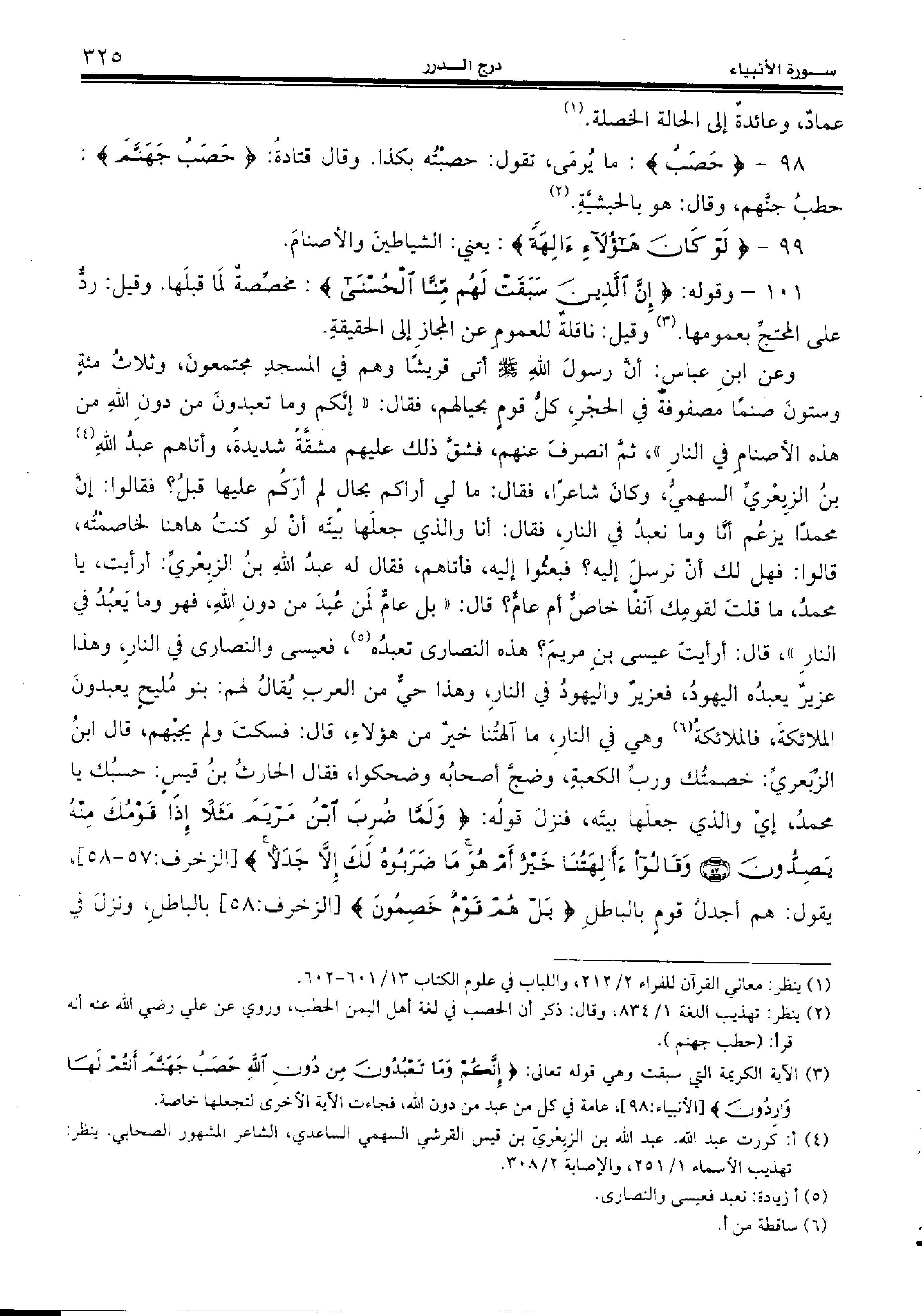 101 - وقوله: {إِنَّ الَّذِينَ سَبَقَتْ لَهُمْ مِنَّا الْحُسْنى:} مخصّصة لما قبلها. وقيل: ردّ على المحتجّ بعمومها. (¬3) وقيل: ناقلة للعموم عن المجاز إلى الحقيقة.