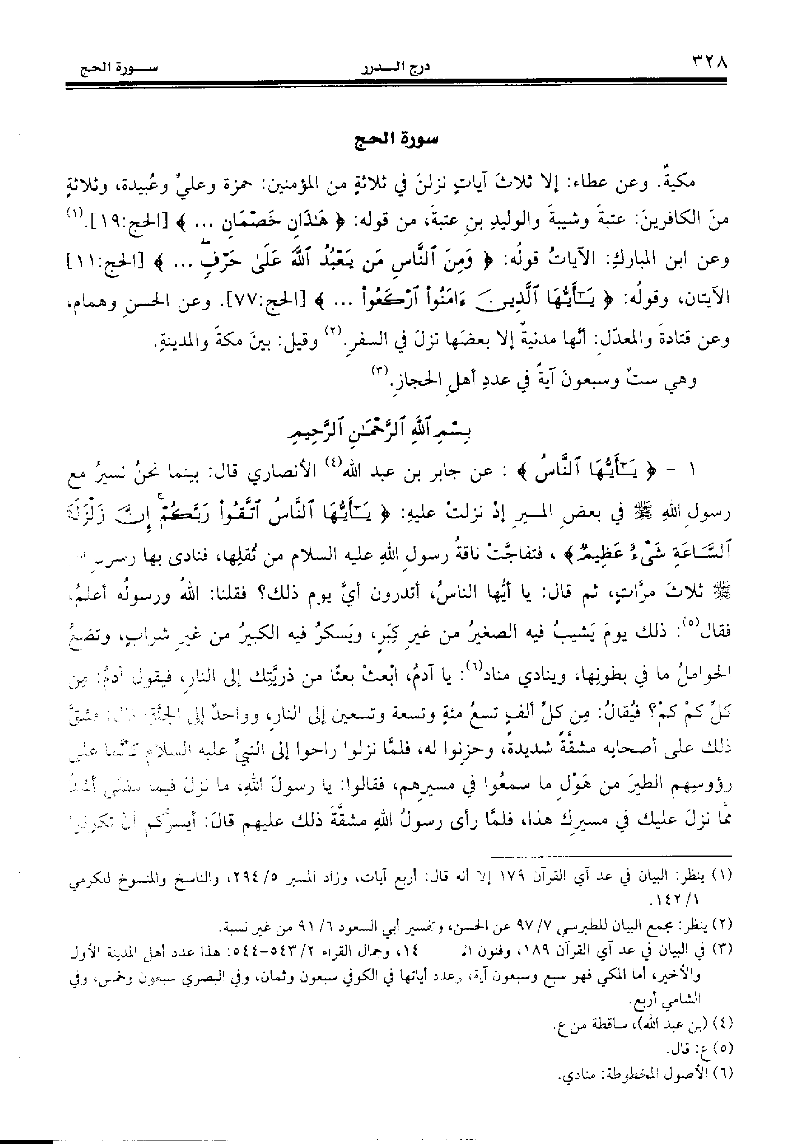 1 - {يا أَيُّهَا النّاسُ:} عن جابر بن عبد الله (¬4) الأنصاري قال: بينما نحن نسير مع رسول الله صلّى الله عليه وسلّم في بعض المسير إذ نزلت عليه: {يا أَيُّهَا النّاسُ اِتَّقُوا رَبَّكُمْ إِنَّ زَلْزَلَةَ السّاعَةِ شَيْءٌ عَظِيمٌ،} فتفاجّت ناقة رسول الله عليه السّلام من ثقلها، فنادى بها رسول الله صلّى الله عليه وسلّم ثلاث مرّات، ثم قال: يا أيّها الناس، أتدرون أيّ يوم ذلك؟ فقلنا: الله ورسوله أعلم، فقال (¬5): ذلك يوم يشيب فيه الصغير من غير كبر، ويسكر فيه الكبير من غير شراب، وتضع الحوامل ما في بطونها، وينادي مناد (¬6): يا آدم، ابعث بعثا من ذريّتك إلى النار، فيقول آدم: من كلّ كم كم؟ فيقال: من كلّ ألف تسع مئة وتسعة وتسعين إلى النار، وواحد إلى الجنّة، قال: فشقّ ذلك على أصحابه مشقّة شديدة، وحزنوا له، فلمّا نزلوا راحوا إلى النبيّ عليه السّلام كأنّما على رؤوسهم الطير من هول ما سمعوا في مسيرهم، فقالوا: يا رسول الله، ما نزل فيما مضى أشدّ ممّا نزل عليك في مسيرك هذا، فلمّا رأى رسول الله مشقّة ذلك عليهم قال: أيسرّكم أن تكونوا