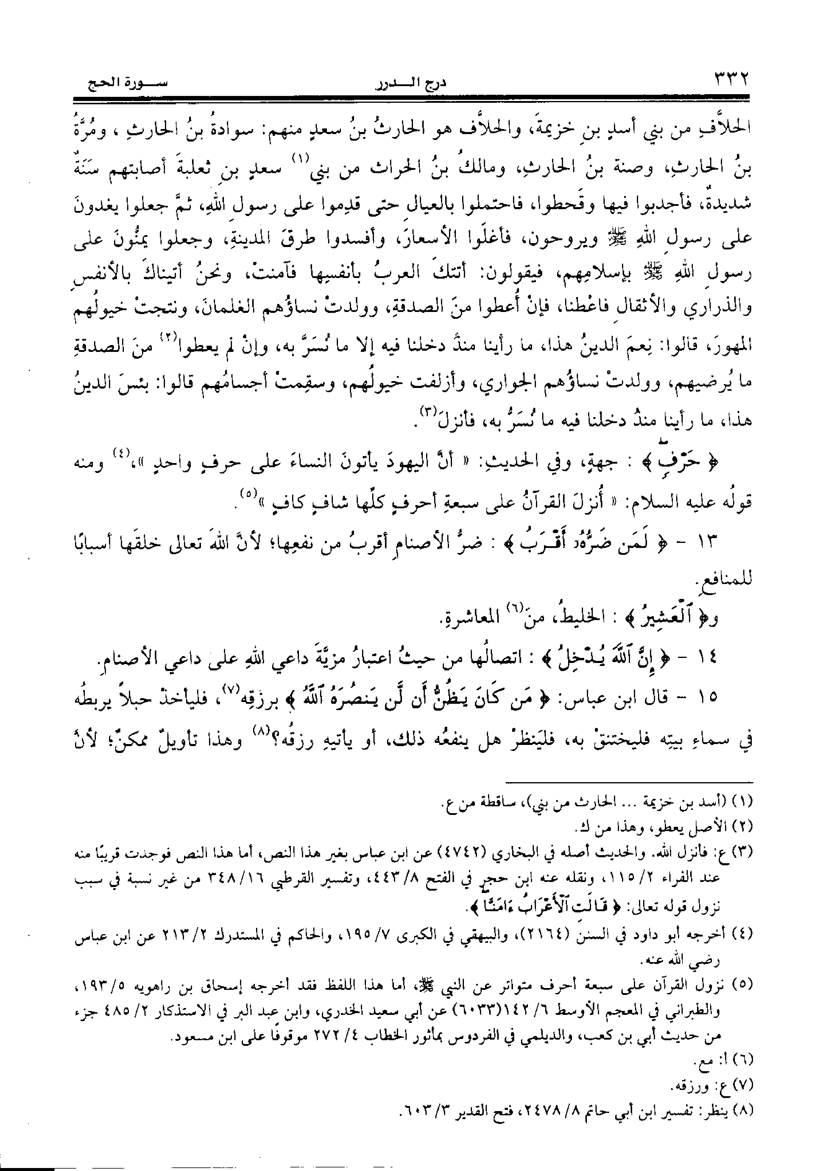 {حَرْفٍ:} جهة، وفي الحديث: «أنّ اليهود يأتون النساء على حرف واحد»، (¬4) ومنه قوله عليه السّلام: «أنزل القرآن على سبعة أحرف كلّها شاف كاف» (¬5).