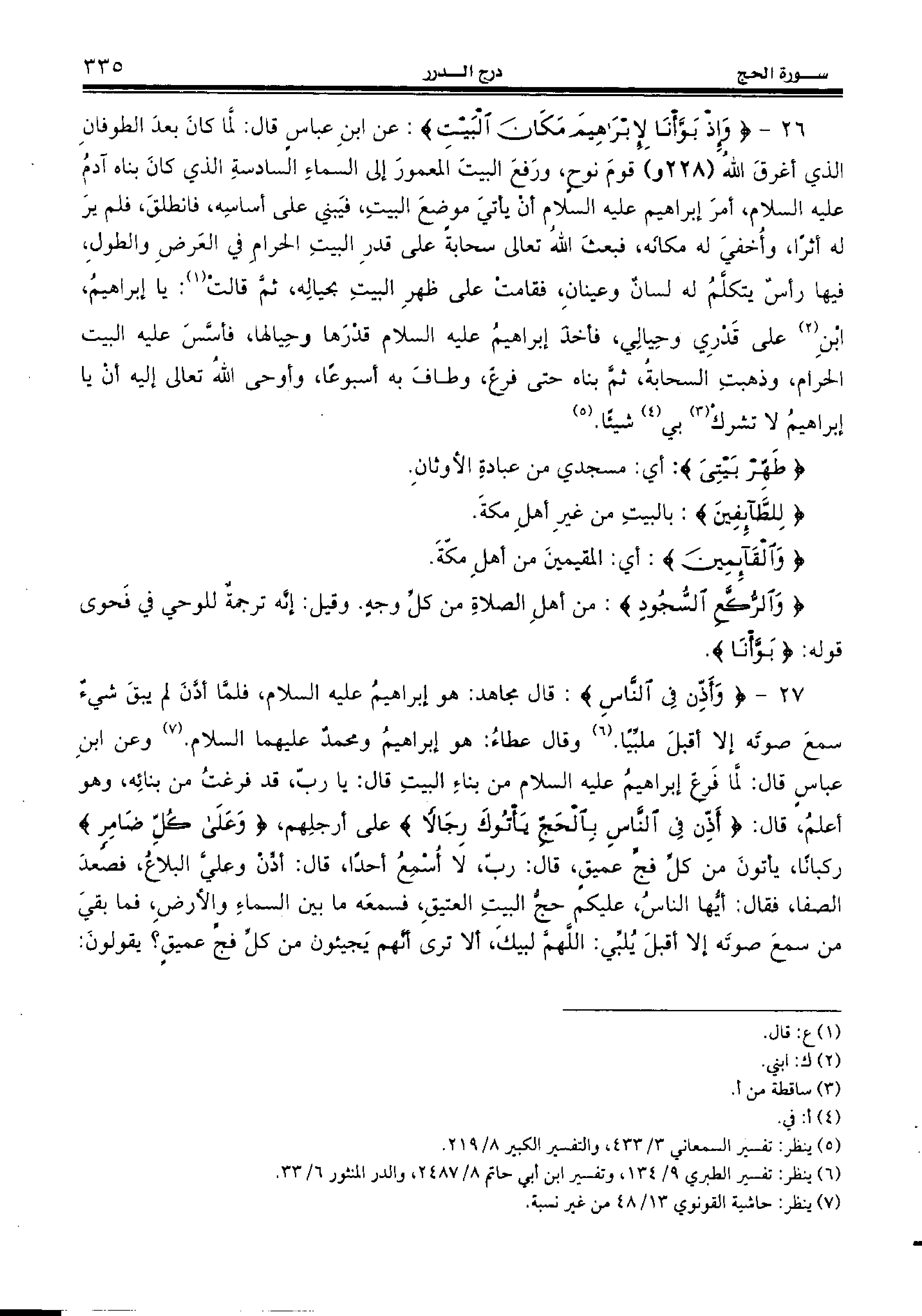26 - {وَإِذْ بَوَّأْنا لِإِبْراهِيمَ مَكانَ الْبَيْتِ:} عن ابن عباس قال: لّما كان بعد الطوفان الذي أغرق الله (228 و) قوم نوح، ورفع البيت المعمور إلى السماء السادسة الذي كان بناه آدم عليه السّلام، أمر إبراهيم عليه السّلام أن يأتي موضع البيت، فيبني على أساسه، فانطلق، فلم ير له أثرا، وأخفي له مكانه، فبعث الله تعالى سحابة على قدر البيت الحرام في العرض والطول، فيها رأس يتكلّم له لسان وعينان، فقامت على ظهر البيت بحياله، ثمّ قالت (¬1): يا إبراهيم، ابن (¬2) على قدري وحيالي، فأخذ إبراهيم عليه السّلام قدرها وحيالها، فأسّس عليه البيت الحرام، وذهبت السحابة، ثمّ بناه حتى فرغ، وطاف به أسبوعا، وأوحى الله تعالى إليه أن يا إبراهيم لا تشرك (¬3) بي (¬4) شيئا. (¬5)