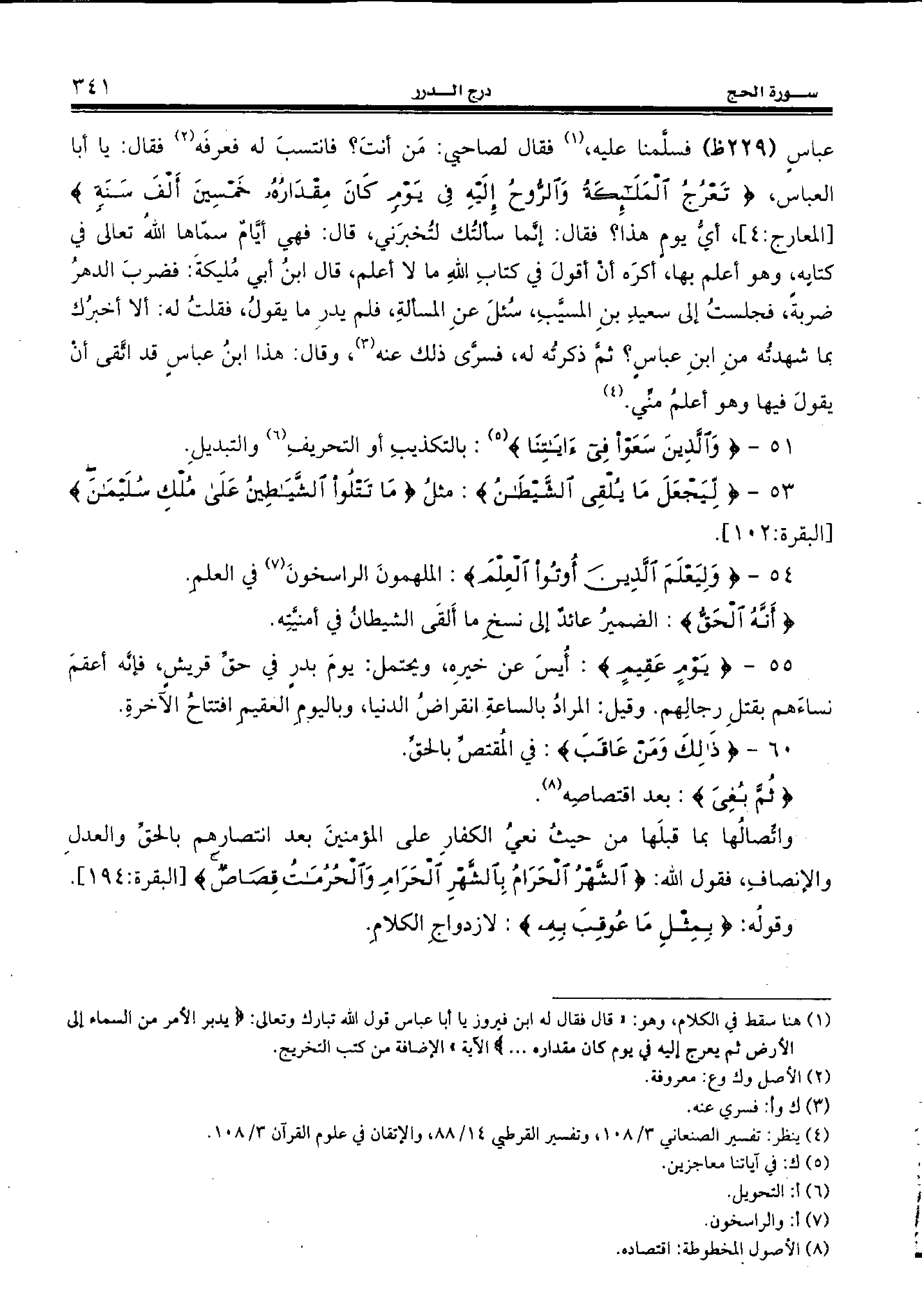 عباس (229 ظ) فسلّمنا عليه، (¬1) فقال لصاحبي: من أنت؟ فانتسب له فعرفه (¬2) فقال: يا أبا العباس، {تَعْرُجُ الْمَلائِكَةُ وَالرُّوحُ إِلَيْهِ فِي يَوْمٍ كانَ مِقْدارُهُ خَمْسِينَ أَلْفَ سَنَةٍ} [المعارج:4]، أيّ يوم هذا؟ فقال: إنّما سألتك لتخبرني، قال: فهي أيّام سمّاها الله تعالى في كتابه، وهو أعلم بها، أكره أن أقول في كتاب الله ما لا أعلم، قال ابن أبي مليكة: فضرب الدهر ضربة، فجلست إلى سعيد بن المسيّب، سئل عن المسألة، فلم يدر ما يقول، فقلت له: ألا أخبرك بما شهدته من ابن عباس؟ ثمّ ذكرته له، فسرّى ذلك عنه (¬3)، وقال: هذا ابن عباس قد اتّقى أن يقول فيها وهو أعلم منّي. (¬4)