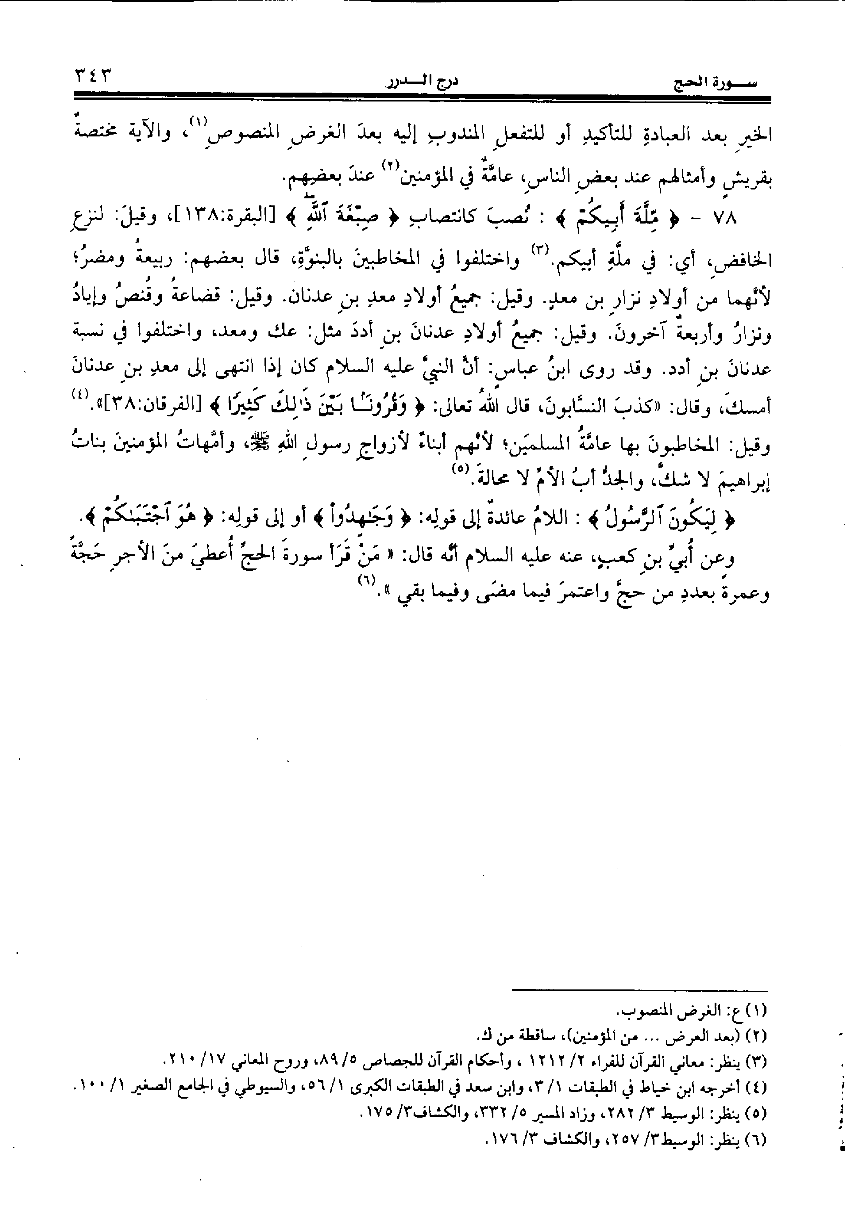 78 - {مِلَّةَ أَبِيكُمْ:} نصب كانتصاب {صِبْغَةَ اللهِ} [البقرة:138]، وقيل: لنزع الخافض، أي: في ملّة أبيكم. (¬3) واختلفوا في المخاطبين بالبنوّة، قال بعضهم: ربيعة ومضر؛ لأنّهما من أولاد نزار بن معد. وقيل: جميع أولاد معد بن عدنان. وقيل: قضاعة وقنص وإياد ونزار وأربعة آخرون. وقيل: جميع أولاد عدنان بن أدد مثل: عك ومعد، واختلفوا في نسبة عدنان بن أدد. وقد روى ابن عباس: أنّ النبيّ عليه السّلام كان إذا انتهى إلى معد بن عدنان أمسك، وقال: «كذب النسّابون، قال الله تعالى: {وَقُرُوناً بَيْنَ ذلِكَ كَثِيراً} [الفرقان:38]». (¬4)