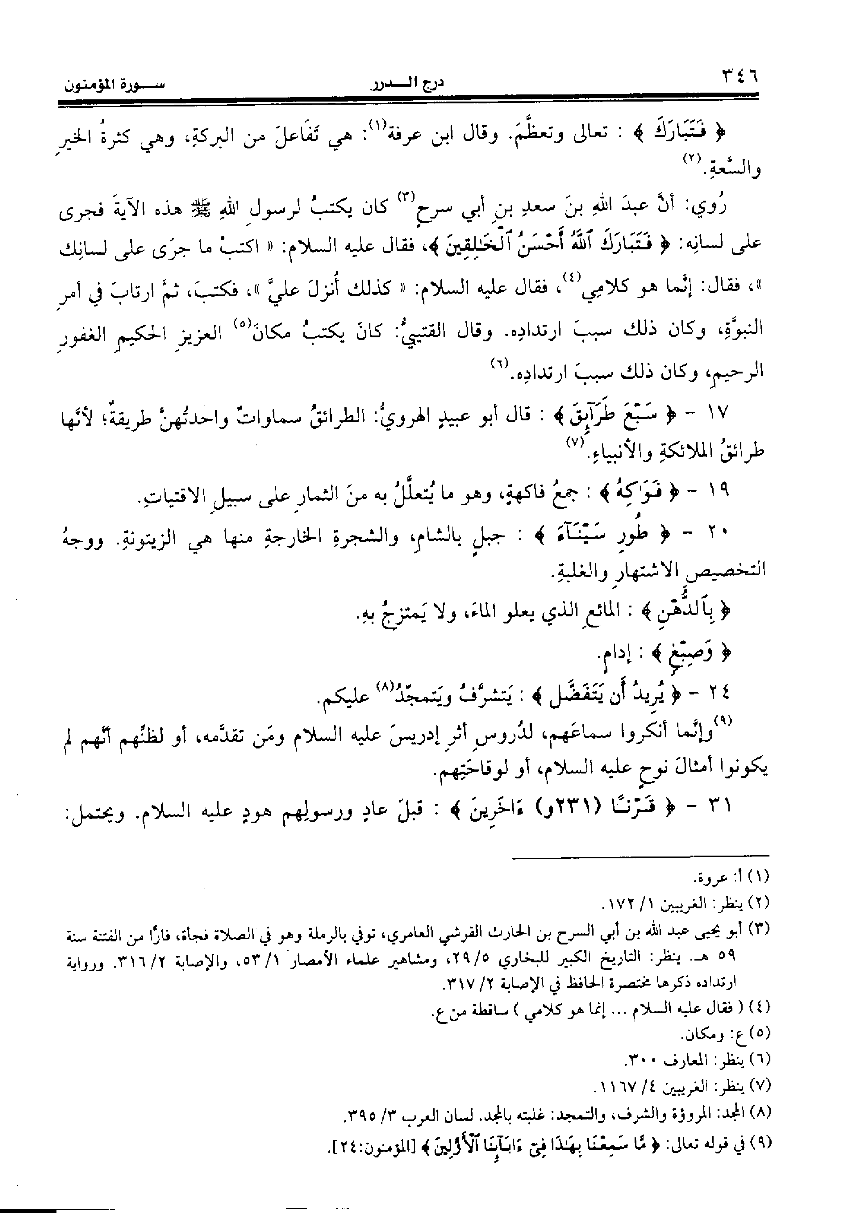 (¬3) أبو يحيى عبد الله بن أبي السرح بن الحارث القرشي العامري، توفي بالرملة وهو في الصلاة فجأة، فارّا من الفتنة سنة 59 هـ. ينظر: التاريخ الكبير للبخاري 5/ 29، ومشاهير علماء الأمصار 1/ 53، والإصابة 2/ 316. ورواية ارتداده ذكرها مختصرة الحافظ في الإصابة 2/ 317.