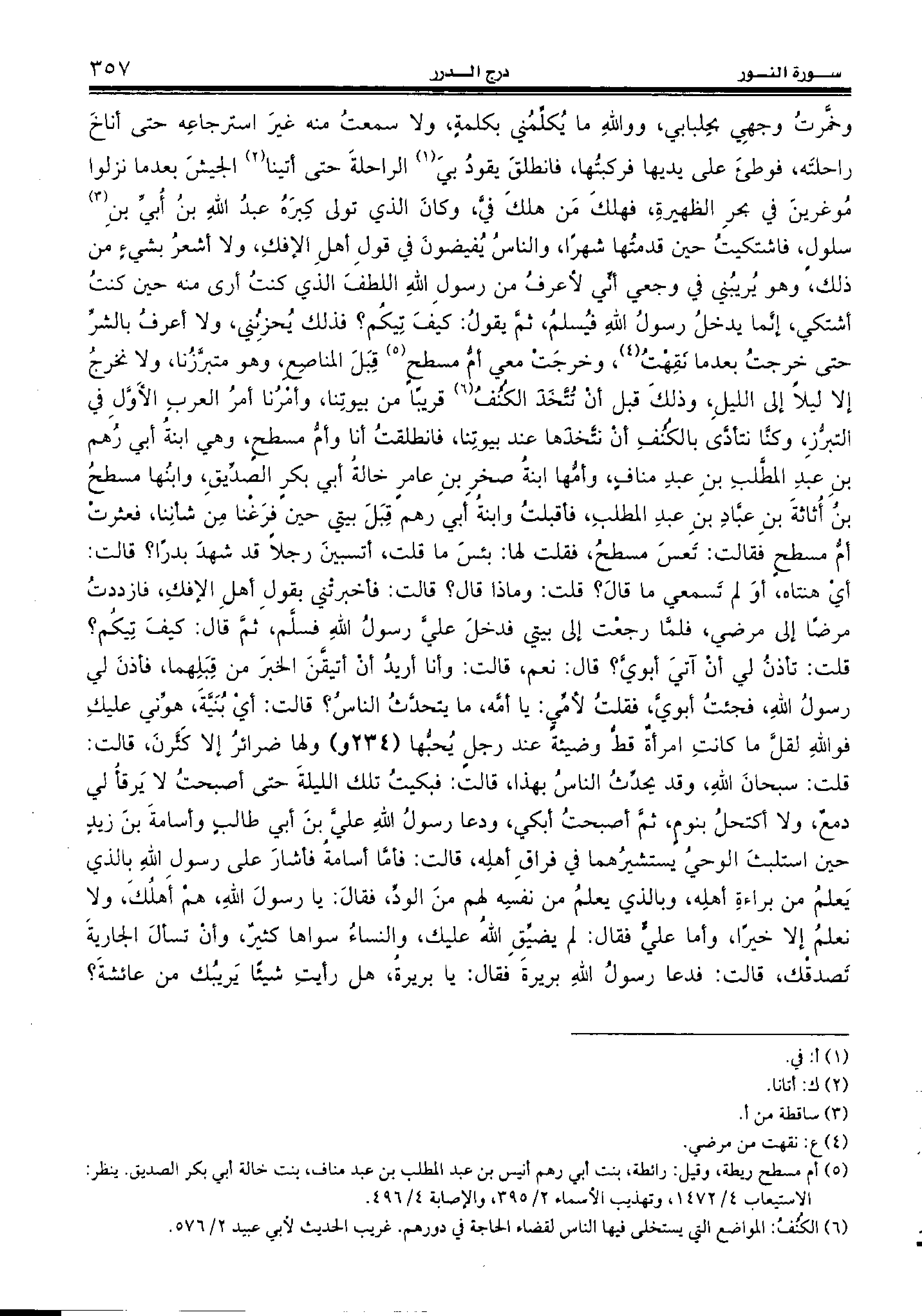 أي هنتاه، أو لم تسمعي ما قال؟ قلت: وماذا قال؟ قالت: فأخبرتني بقول أهل الإفك، فازددت مرضا إلى مرضي، فلمّا رجعت إلى بيتي فدخل عليّ رسول الله فسلّم، ثمّ قال: كيف تيكم؟ قلت: تأذن لي أن آتي أبويّ؟ قال: نعم، قالت: وأنا أريد أن أتيقّن الخبر من قبلهما، فأذن لي رسول الله، فجئت أبويّ، فقلت لأمّي: يا أمّه، ما يتحدّث الناس؟ قالت: أي بنيّة، هوّني عليك فو الله لقلّ ما كانت امرأة قطّ وضيئة عند رجل يحبّها (234 و) ولها ضرائر إلا كثّرن، قالت: