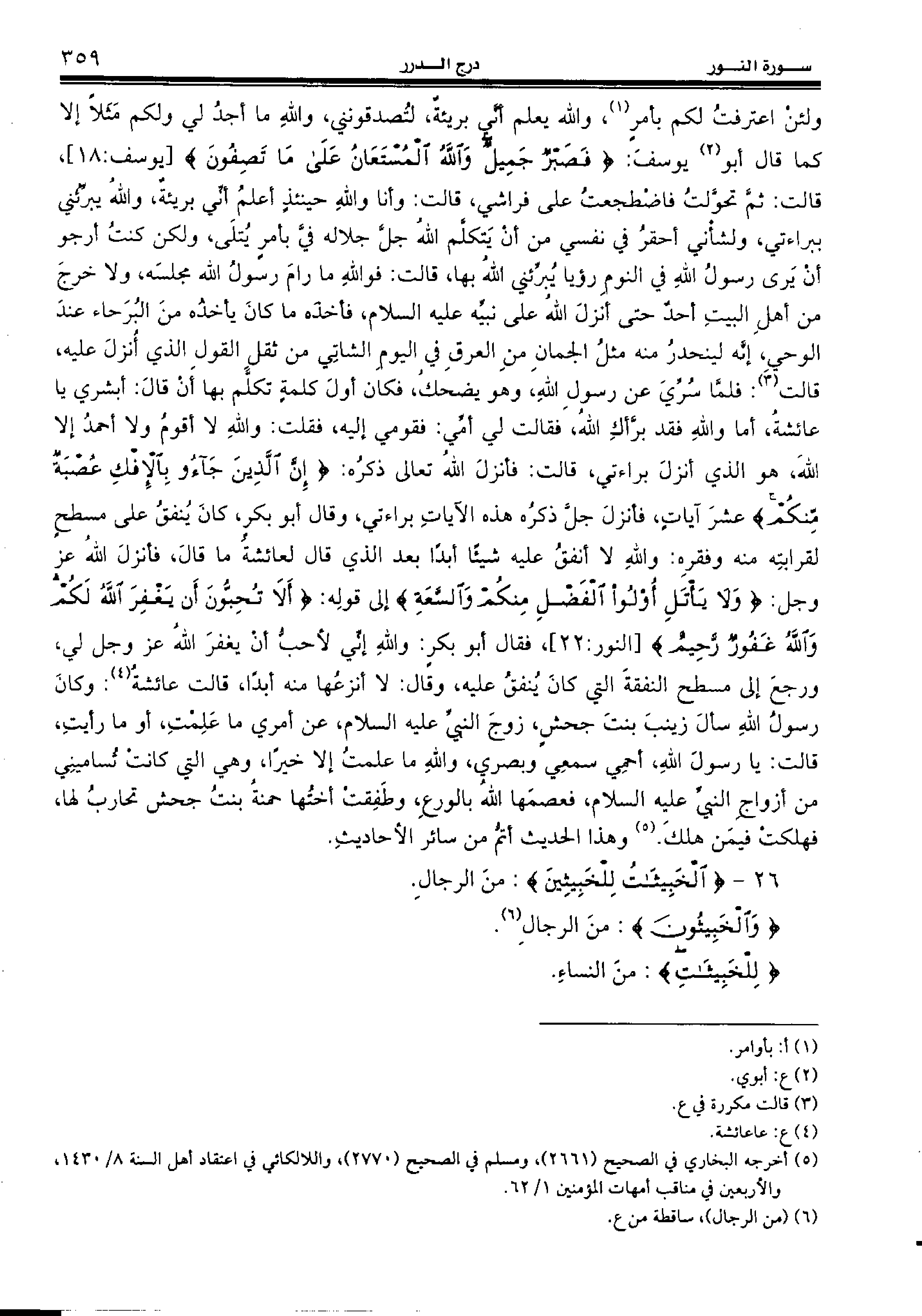 ولئن اعترفت لكم بأمر (¬1)، والله يعلم أنّي بريئة، لتصدقونني، والله ما أجد لي ولكم مثلا إلا كما قال أبو (¬2) يوسف: {فَصَبْرٌ جَمِيلٌ وَاللهُ الْمُسْتَعانُ عَلى ما تَصِفُونَ} [يوسف:18]، قالت: ثمّ تحوّلت فاضطجعت على فراشي، قالت: وأنا والله حينئذ أعلم أنّي بريئة، والله يبرّئني ببراءتي، ولشأني أحقر في نفسي من أن يتكلّم الله جلّ جلاله فيّ بأمر يتلى، ولكن كنت أرجو أن يرى رسول الله في النوم رؤيا يبرّئني الله بها، قالت: فو الله ما رام رسول الله مجلسه، ولا خرج من أهل البيت أحد حتى أنزل الله على نبيّه عليه السّلام، فأخذه ما كان يأخذه من البرحاء عند الوحي، إنّه لينحدر منه مثل الجمان من العرق في اليوم الشاتي من ثقل القول الذي أنزل عليه، قالت (¬3): فلمّا سرّي عن رسول الله، وهو يضحك، فكان أول كلمة تكلّم بها أن قال: أبشري يا عائشة، أما والله فقد برّأك الله، فقالت لي أمّي: فقومي إليه، فقلت: والله لا أقوم ولا أحمد إلا الله، هو الذي أنزل براءتي، قالت: فأنزل الله تعالى ذكره: {إِنَّ الَّذِينَ جاؤُ بِالْإِفْكِ عُصْبَةٌ مِنْكُمْ} عشر آيات، فأنزل جلّ ذكره هذه الآيات براءتي، وقال أبو بكر، كان ينفق على مسطح لقرابته منه وفقره: والله لا أنفق عليه شيئا أبدا بعد الذي قال لعائشة ما قال، فأنزل الله عز وجل: {وَلا يَأْتَلِ أُولُوا الْفَضْلِ مِنْكُمْ وَالسَّعَةِ} إلى قوله: {أَلا تُحِبُّونَ أَنْ يَغْفِرَ اللهُ لَكُمْ وَاللهُ غَفُورٌ رَحِيمٌ} [النور:22]، فقال أبو بكر: والله إنّي لأحبّ أن يغفر الله عز وجل لي، ورجع إلى مسطح النفقة التي كان ينفق عليه، وقال: لا أنزعها منه أبدا، قالت عائشة (¬4): وكان رسول الله سأل زينب بنت جحش، زوج النبيّ عليه السّلام، عن أمري ما علمت، أو ما رأيت، قالت: يا رسول الله، أحمي سمعي وبصري، والله ما علمت إلا خيرا، وهي التي كانت تساميني من أزواج النبيّ عليه السّلام، فعصمها الله بالورع، وطفقت أختها حمنة بنت جحش تحارب لها، فهلكت فيمن هلك. (¬5) وهذا الحديث أتمّ من سائر الأحاديث.
