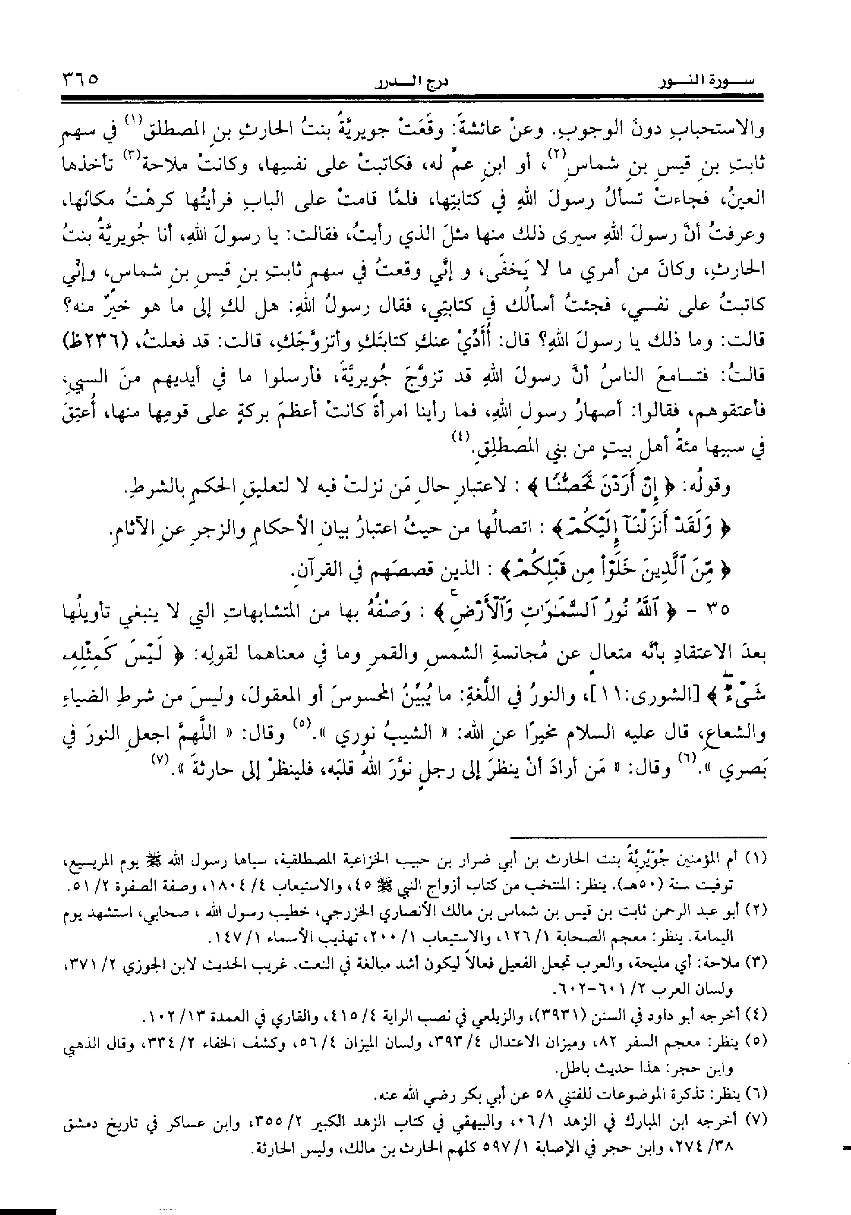 35 - {اللهُ نُورُ السَّماواتِ وَالْأَرْضِ:} وصفه بها من المتشابهات التي لا ينبغي تأويلها بعد الاعتقاد بأنّه متعال عن مجانسة الشمس والقمر وما في معناهما لقوله: {لَيْسَ كَمِثْلِهِ شَيْءٌ} [الشورى:11]، والنور في اللّغة: ما يبيّن المحسوس أو المعقول، وليس من شرط الضياء والشعاع، قال عليه السّلام مخبرا عن الله: «الشيب نوري». (¬5) وقال: «اللهمّ اجعل النور في بصري». (¬6) وقال: «من أراد أن ينظر إلى رجل نوّر الله قلبه، فلينظر إلى حارثة». (¬7)