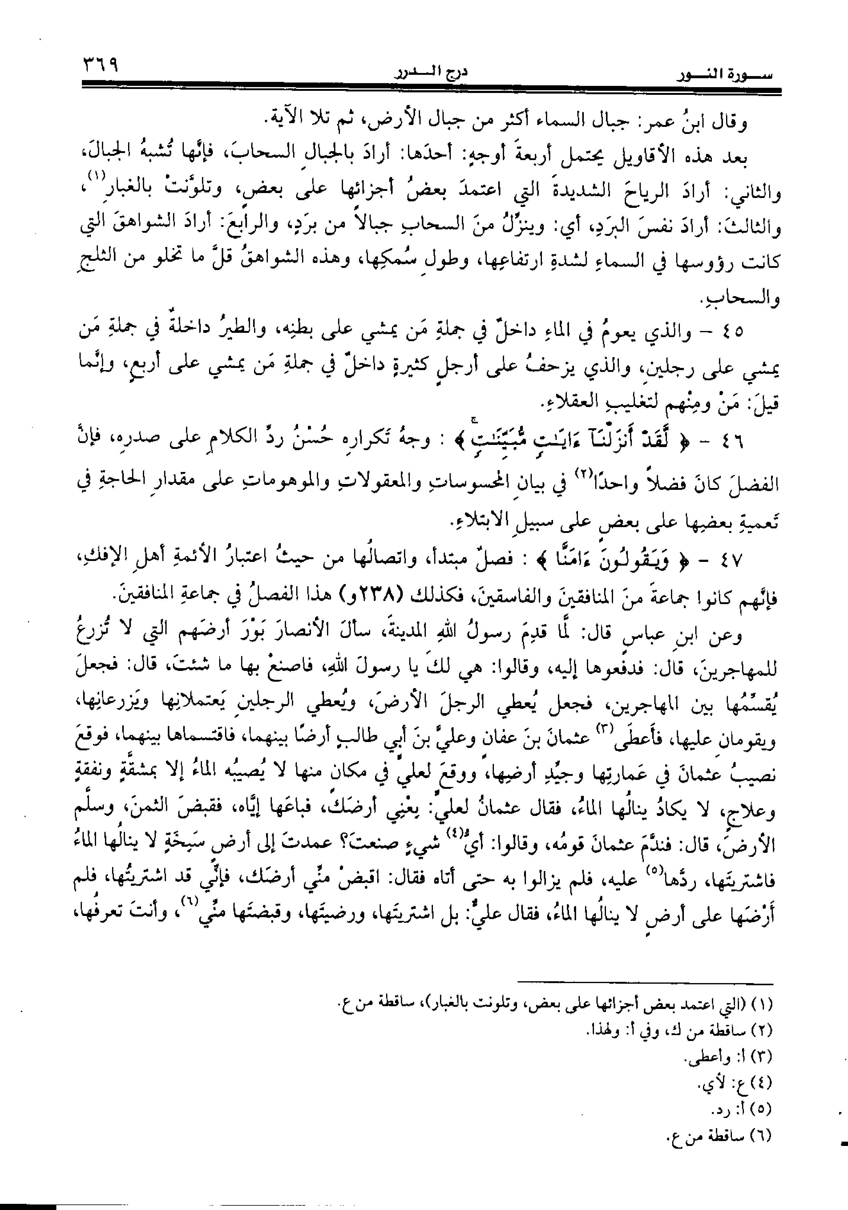 45 - والذي يعوم في الماء داخل في جملة من يمشي على بطنه، والطير داخلة في جملة من يمشي على رجلين، والذي يزحف على أرجل كثيرة داخل في جملة من يمشي على أربع، وإنّما قيل: من ومنهم لتغليب العقلاء.