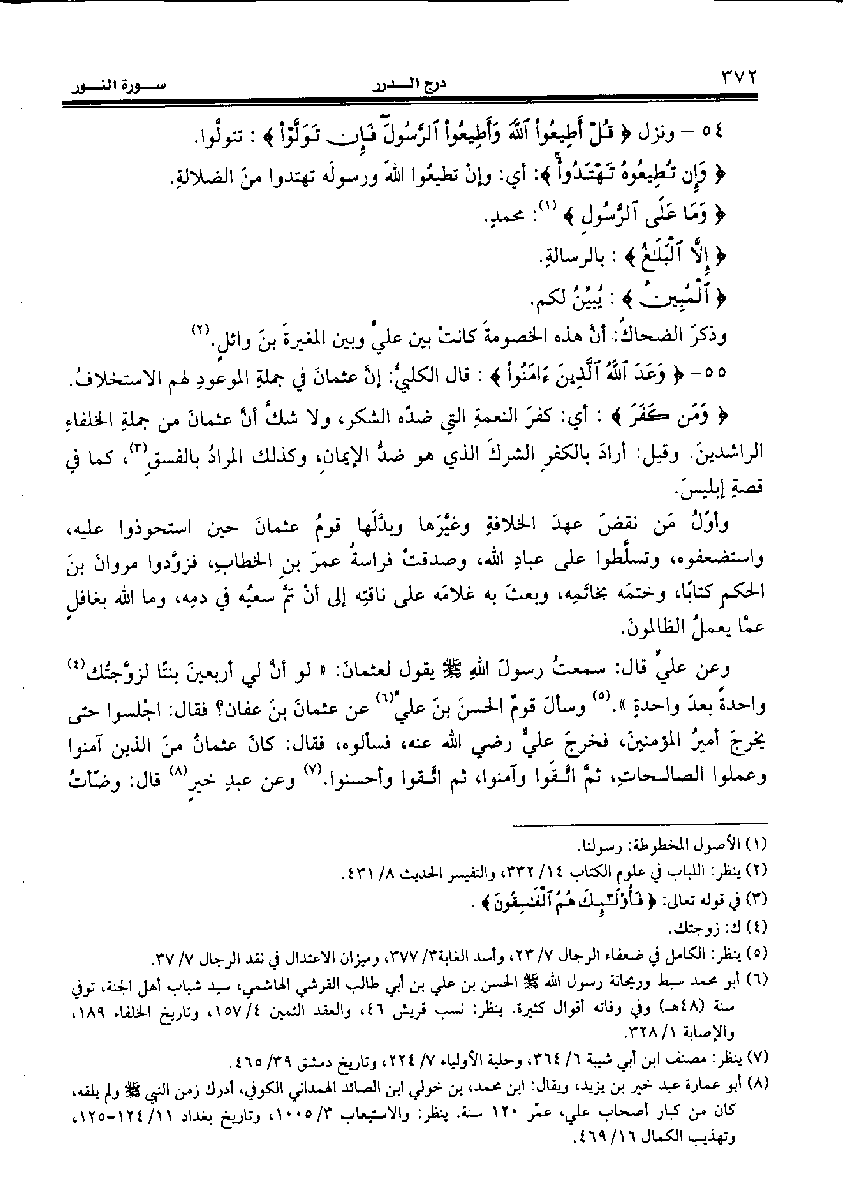 55 - {وَعَدَ اللهُ الَّذِينَ آمَنُوا:} قال الكلبيّ: إنّ عثمان في جملة الموعود لهم الاستخلاف.