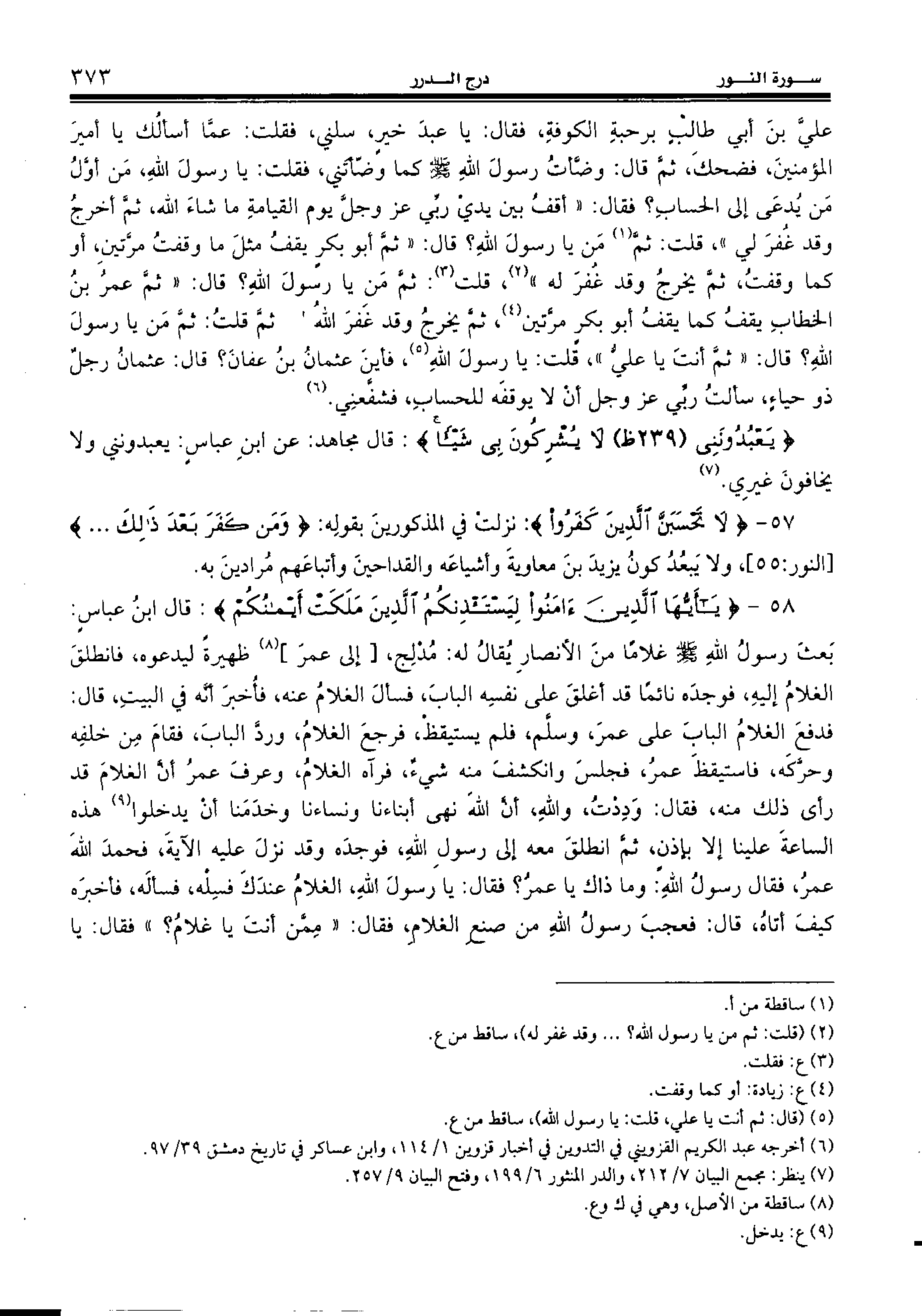 فدفع الغلام الباب على عمر، وسلّم، فلم يستيقظ، فرجع الغلام، وردّ الباب، فقام من خلفه وحرّكه، فاستيقظ عمر، فجلس وانكشف منه شيء، فرآه الغلام، وعرف عمر أنّ الغلام قد رأى ذلك منه، فقال: وددت، والله، أنّ الله نهى أبناءنا ونساءنا وخدمنا أن يدخلوا (¬9) هذه الساعة علينا إلا بإذن، ثمّ انطلق معه إلى رسول الله، فوجده وقد نزل عليه الآية، فحمد الله عمر، فقال رسول الله: وما ذاك يا عمر؟ فقال: يا رسول الله، الغلام عندك فسله، فسأله، فأخبره كيف أتاه، قال: فعجب رسول الله من صنع الغلام، فقال: «ممّن أنت يا غلام؟» فقال: يا