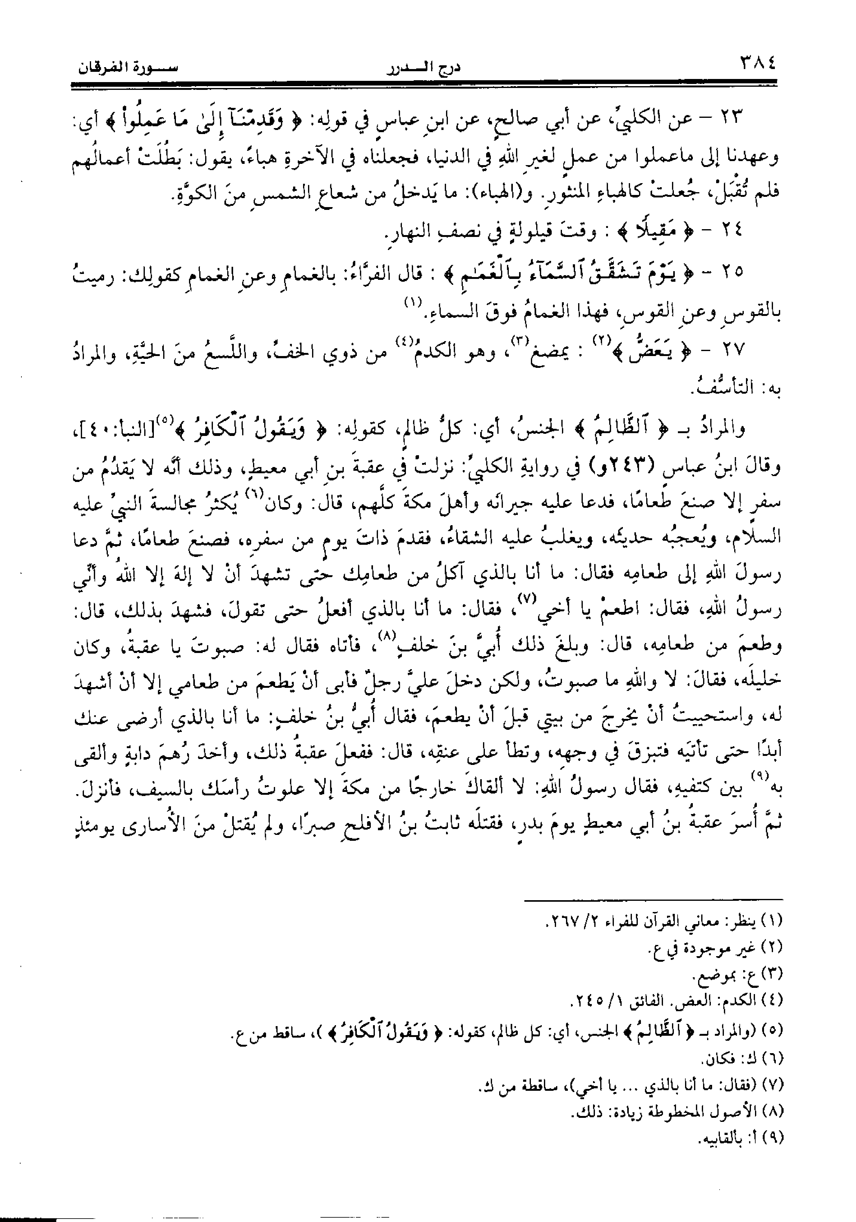 والمراد ب {الظّالِمُ} الجنس، أي: كلّ ظالم، كقوله: {وَيَقُولُ الْكافِرُ} (¬5) [النبأ:40]، وقال ابن عباس (243 و) في رواية الكلبيّ: نزلت في عقبة بن أبي معيط، وذلك أنّه لا يقدم من سفر إلا صنع طعاما، فدعا عليه جيرانه وأهل مكة كلّهم، قال: وكان (¬6) يكثر مجالسة النبيّ عليه السّلام، ويعجبه حديثه، ويغلب عليه الشقاء، فقدم ذات يوم من سفره، فصنع طعاما، ثمّ دعا رسول الله إلى طعامه فقال: ما أنا بالذي آكل من طعامك حتى تشهد أن لا إله إلا الله وأنّي رسول الله، فقال: اطعم يا أخي (¬7)، فقال: ما أنا بالذي أفعل حتى تقول، فشهد بذلك، قال: