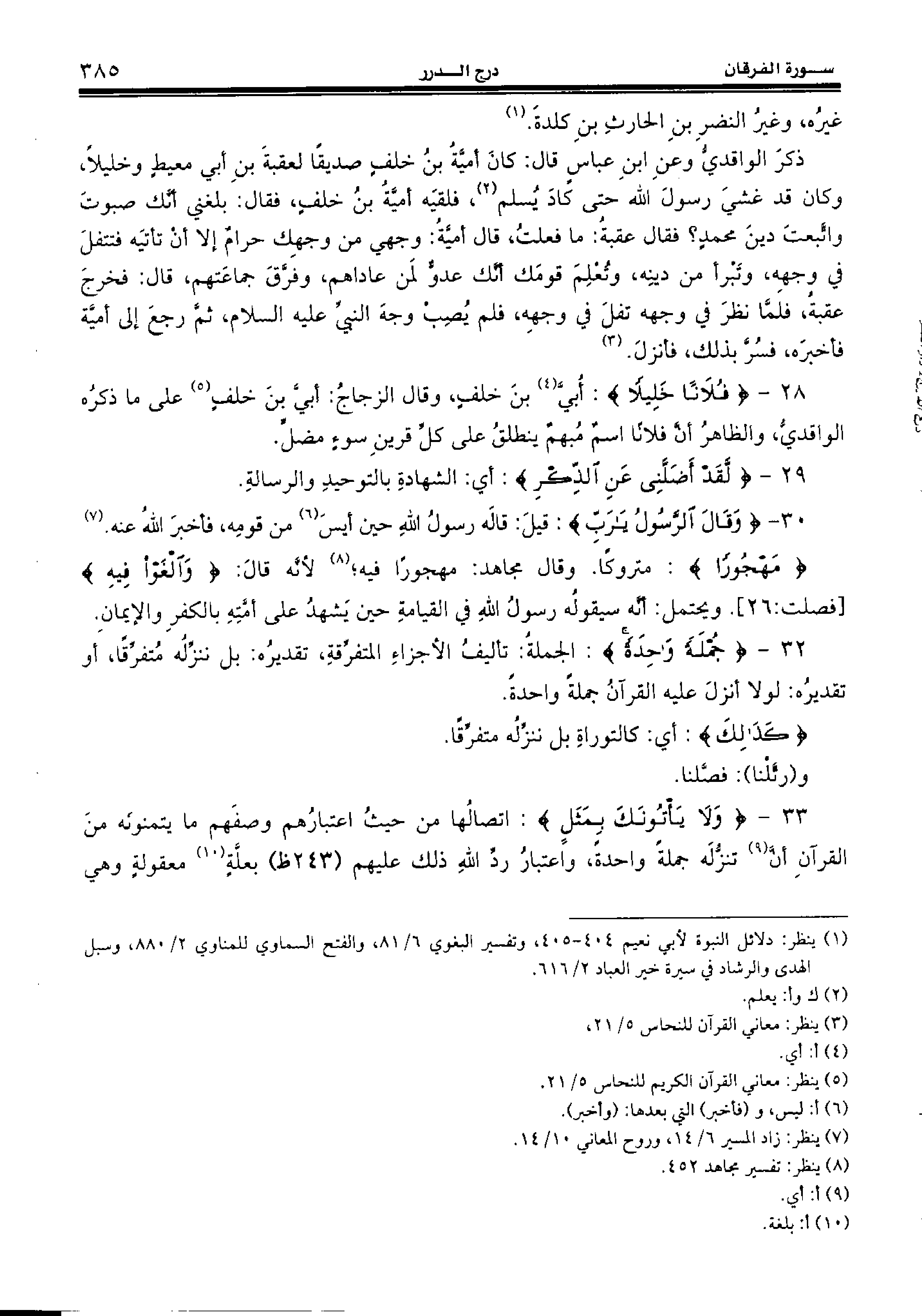 ذكر الواقديّ وعن ابن عباس قال: كان أميّة بن خلف صديقا لعقبة بن أبي معيط وخليلا، وكان قد غشي رسول الله حتى كاد يسلم (¬2)، فلقيه أميّة بن خلف، فقال: بلغني أنّك صبوت واتّبعت دين محمد؟ فقال عقبة: ما فعلت، قال أميّة: وجهي من وجهك حرام إلا أن تأتيه فتتفل في وجهه، وتبرأ من دينه، وتعلم قومك أنّك عدوّ لمن عاداهم، وفرّق جماعتهم، قال: فخرج عقبة، فلمّا نظر في وجهه تفل في وجهه، فلم يصب وجه النبيّ عليه السّلام، ثمّ رجع إلى أميّة فأخبره، فسرّ بذلك، فأنزل. (¬3)