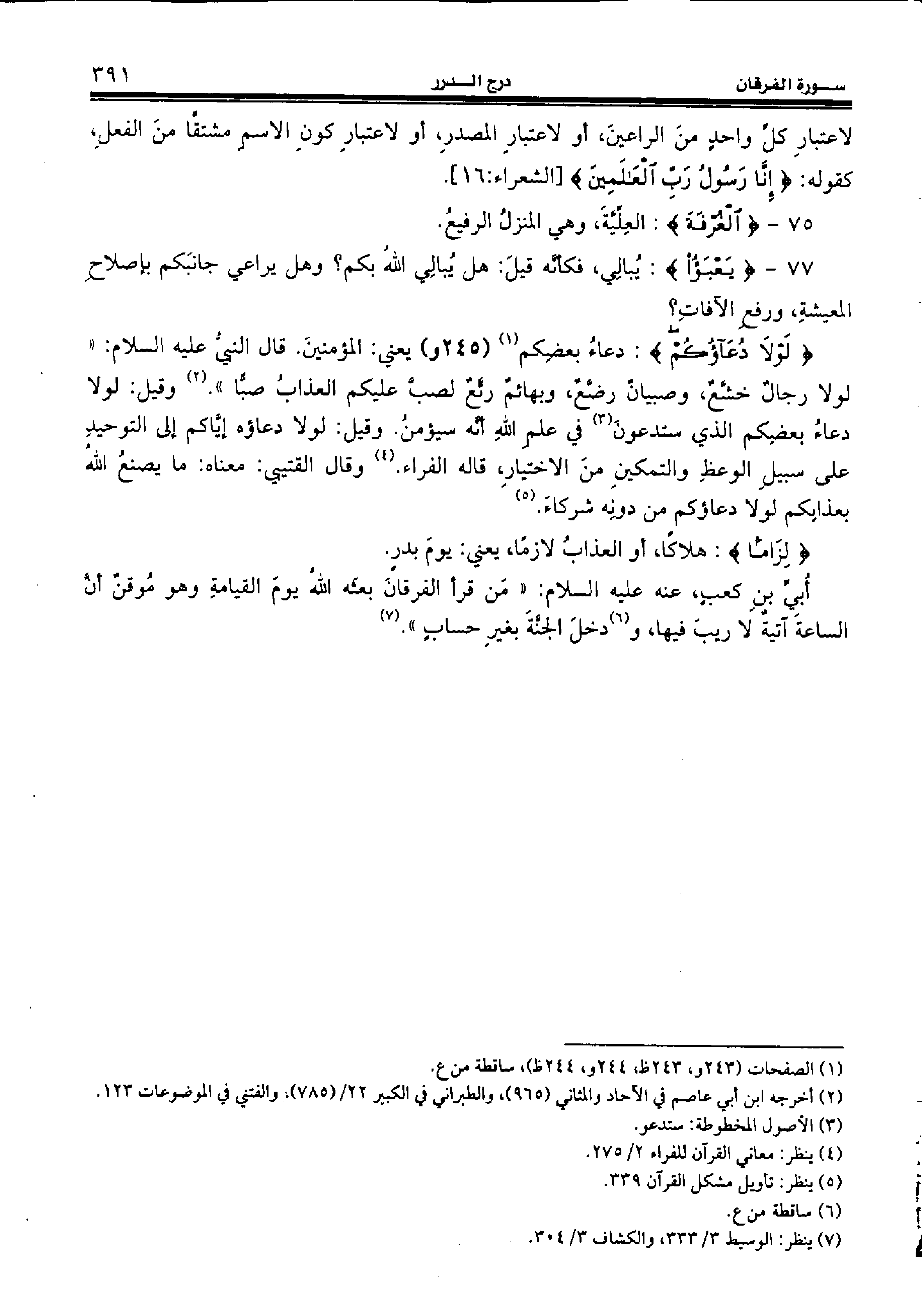 77 - {يَعْبَؤُا:} يبالي، فكأنّه قيل: هل يبالي الله بكم؟ وهل يراعي جانبكم بإصلاح المعيشة، ورفع الآفات؟