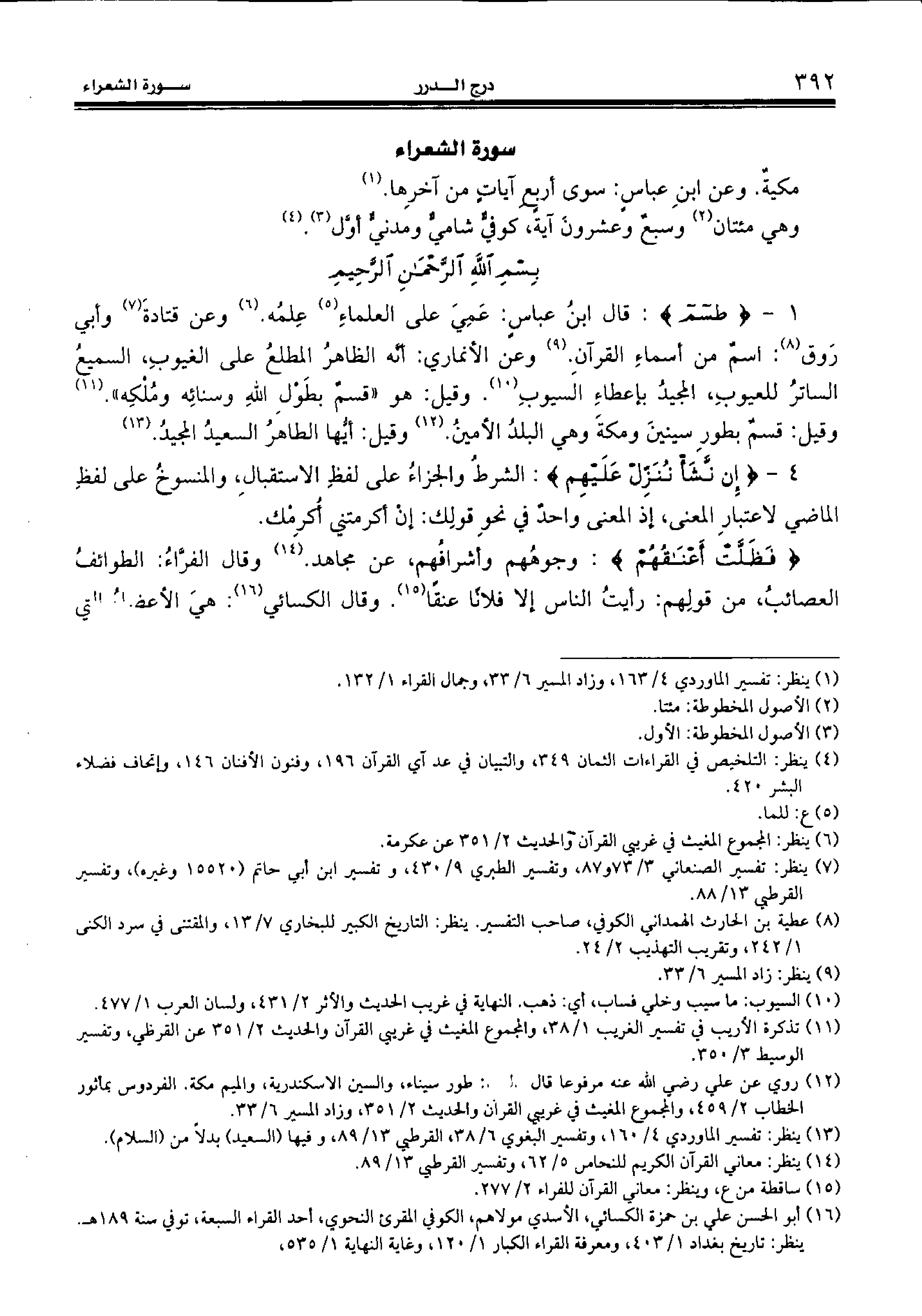 1 - {طسم:} قال ابن عباس: عمي على العلماء (¬5) علمه. (¬6) وعن قتادة (¬7) وأبي روق (¬8): اسم من أسماء القرآن. (¬9) وعن الأنماري: أنّه الظاهر المطلع على الغيوب، السميع الساتر للعيوب، المجيد بإعطاء السيوب (¬10). وقيل: هو «قسم بطول الله وسنائه وملكه». (¬11)