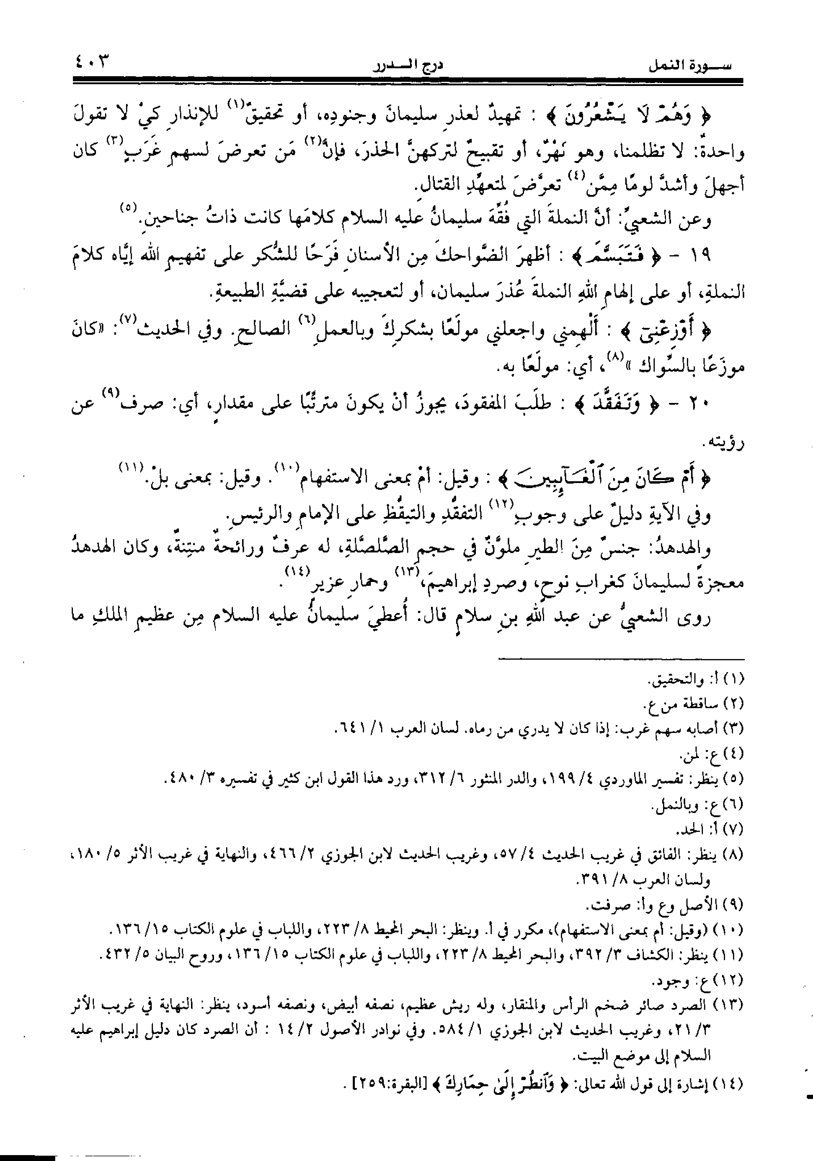19 - {فَتَبَسَّمَ:} أظهر الضّواحك من الأسنان فرحا للشّكر على تفهيم الله إيّاه كلام النملة، أو على إلهام الله النملة عذر سليمان، أو لتعجيبه على قضيّة الطبيعة.