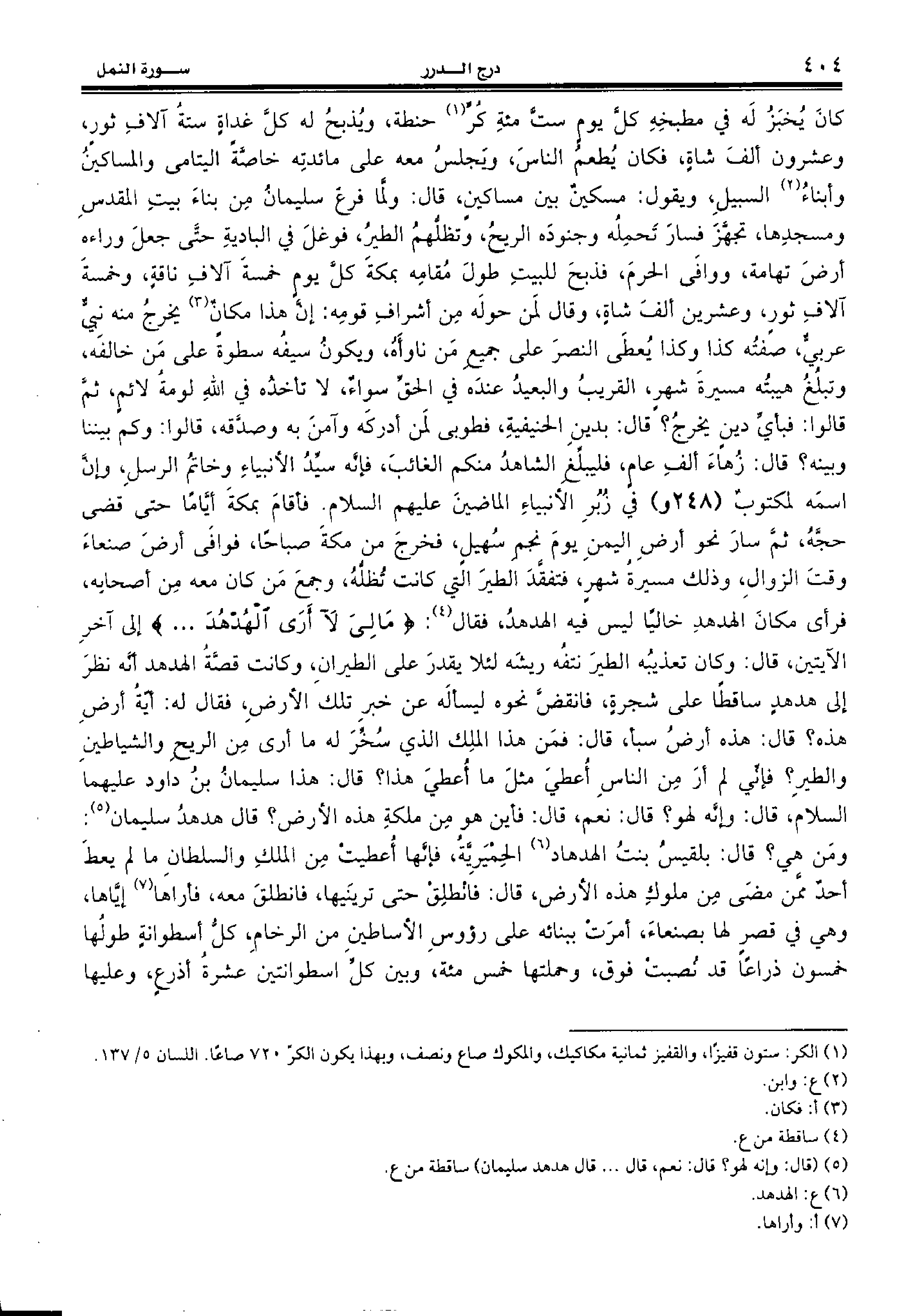 كان يخبز له في مطبخه كلّ يوم ستّ مئة كرّ (¬1) حنطة، ويذبح له كلّ غداة ستة آلاف ثور، وعشرون ألف شاة، فكان يطعم الناس، ويجلس معه على مائدته خاصّة اليتامى والمساكين وأبناء (¬2) السبيل، ويقول: مسكين بين مساكين، قال: ولّما فرع سليمان من بناء بيت المقدس ومسجدها، تجهّز فسار تحمله وجنوده الريح، وتظلّهم الطير، فوغل في البادية حتّى جعل وراءه أرض تهامة، ووافى الحرم، فذبح للبيت طول مقامه بمكة كلّ يوم خمسة آلاف ناقة، وخمسة آلاف ثور، وعشرين ألف شاة، وقال لمن حوله من أشراف قومه: إنّ هذا مكان (¬3) يخرج منه نبيّ عربيّ، صفته كذا وكذا يعطى النصر على جميع من ناوأه، ويكون سيفه سطوة على من خالفه، وتبلغ هيبته مسيرة شهر، القريب والبعيد عنده في الحقّ سواء، لا تأخذه في الله لومة لائم، ثمّ قالوا: فبأيّ دين يخرج؟ قال: بدين الحنيفية، فطوبى لمن أدركه وآمن به وصدّقه، قالوا: وكم بيننا وبينه؟ قال: زهاء ألف عام، فليبلّغ الشاهد منكم الغائب، فإنّه سيّد الأنبياء وخاتم الرسل، وإنّ اسمه لمكتوب (248 و) في زبر الأنبياء الماضين عليهم السّلام. فأقام بمكة أيّاما حتى قضى حجّه، ثمّ سار نحو أرض اليمن يوم نجم سهيل، فخرج من مكة صباحا، فوافى أرض صنعاء وقت الزوال، وذلك مسيرة شهر، فتفقّد الطير التي كانت تظلّه، وجمع من كان معه من أصحابه، فرأى مكان الهدهد خاليا ليس فيه الهدهد، فقال (¬4): {ما لِيَ لا أَرَى الْهُدْهُدَ. . .} إلى آخر الآيتين، قال: وكان تعذيبه الطير نتفه ريشه لئلا يقدر على الطيران، وكانت قصّة الهدهد أنّه نظر إلى هدهد ساقطا على شجرة، فانقضّ نحوه ليسأله عن خبر تلك الأرض، فقال له: أيّة أرض هذه؟ قال: هذه أرض سبأ، قال: فمن هذا الملك الذي سخّر له ما أرى من الريح والشياطين والطير؟ فإنّي لم أر من الناس أعطي مثل ما أعطي هذا؟ قال: هذا سليمان بن داود عليهما السّلام، قال: وإنّه لهو؟ قال: نعم، قال: فأين هو من ملكة هذه الأرض؟ قال هدهد سليمان (¬5):