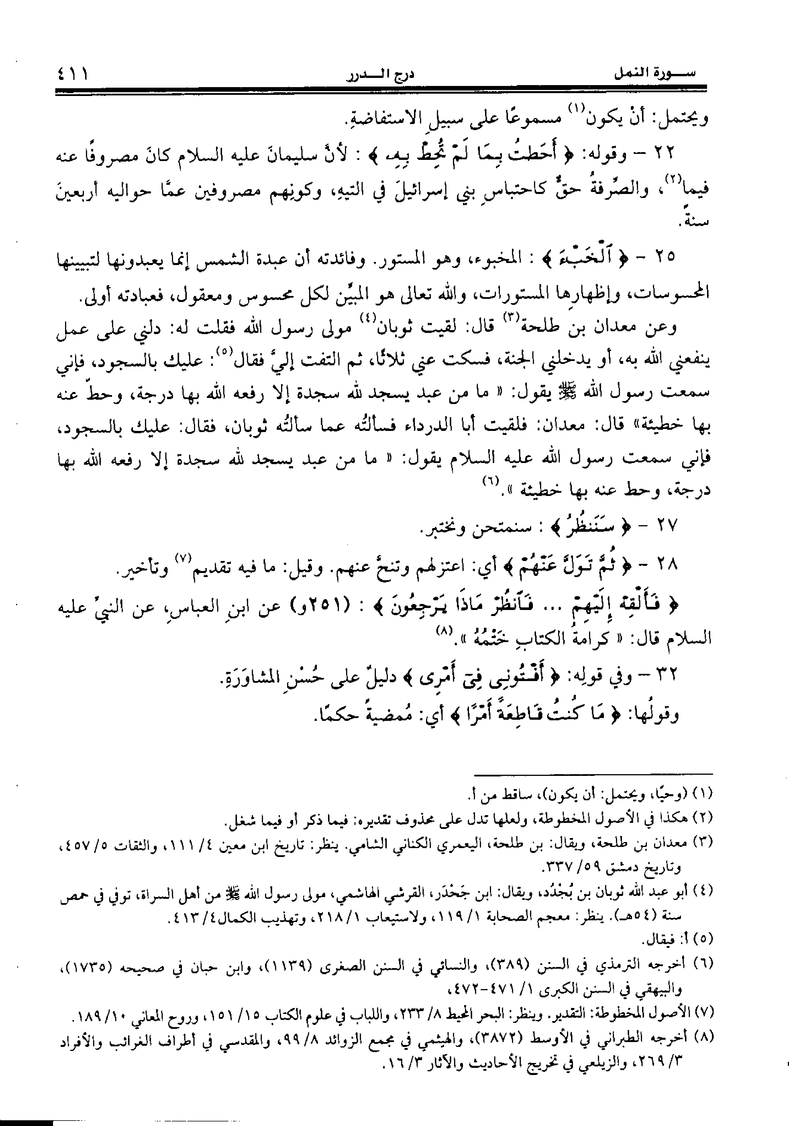 22 - وقوله: {أَحَطْتُ بِما لَمْ تُحِطْ بِهِ:} لأنّ سليمان عليه السّلام كان مصروفا عنه فيما (¬2)، والصّرفة حقّ كاحتباس بني إسرائيل في التيه، وكونهم مصروفين عمّا حواليه أربعين سنة.
