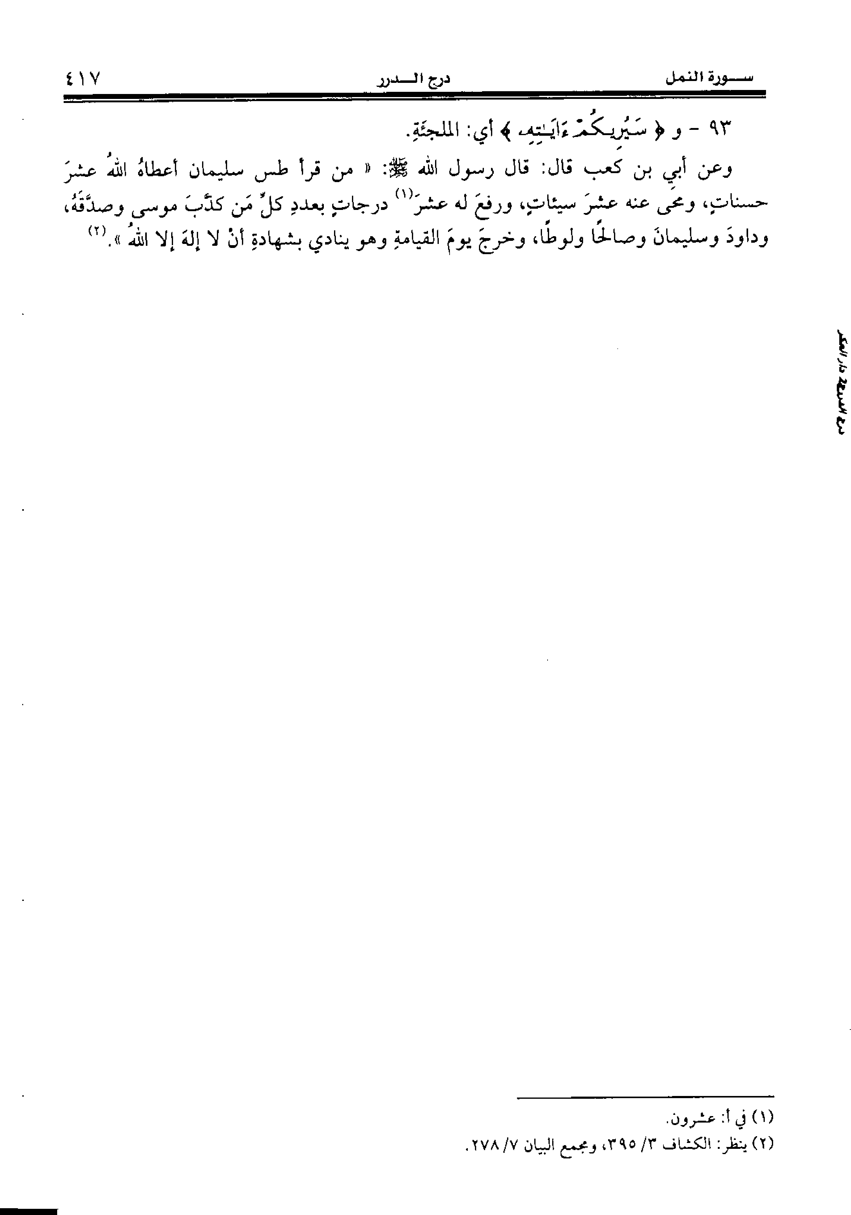 وعن أبي بن كعب قال: قال رسول الله صلّى الله عليه وسلّم: «من قرأ طس سليمان أعطاه الله عشر حسنات، ومحى عنه عشر سيئات، ورفع له عشر (¬1) درجات بعدد كلّ من كذّب موسى وصدّقه، وداود وسليمان وصالحا ولوطا، وخرج يوم القيامة وهو ينادي بشهادة أن لا إله إلا الله». (¬2)
